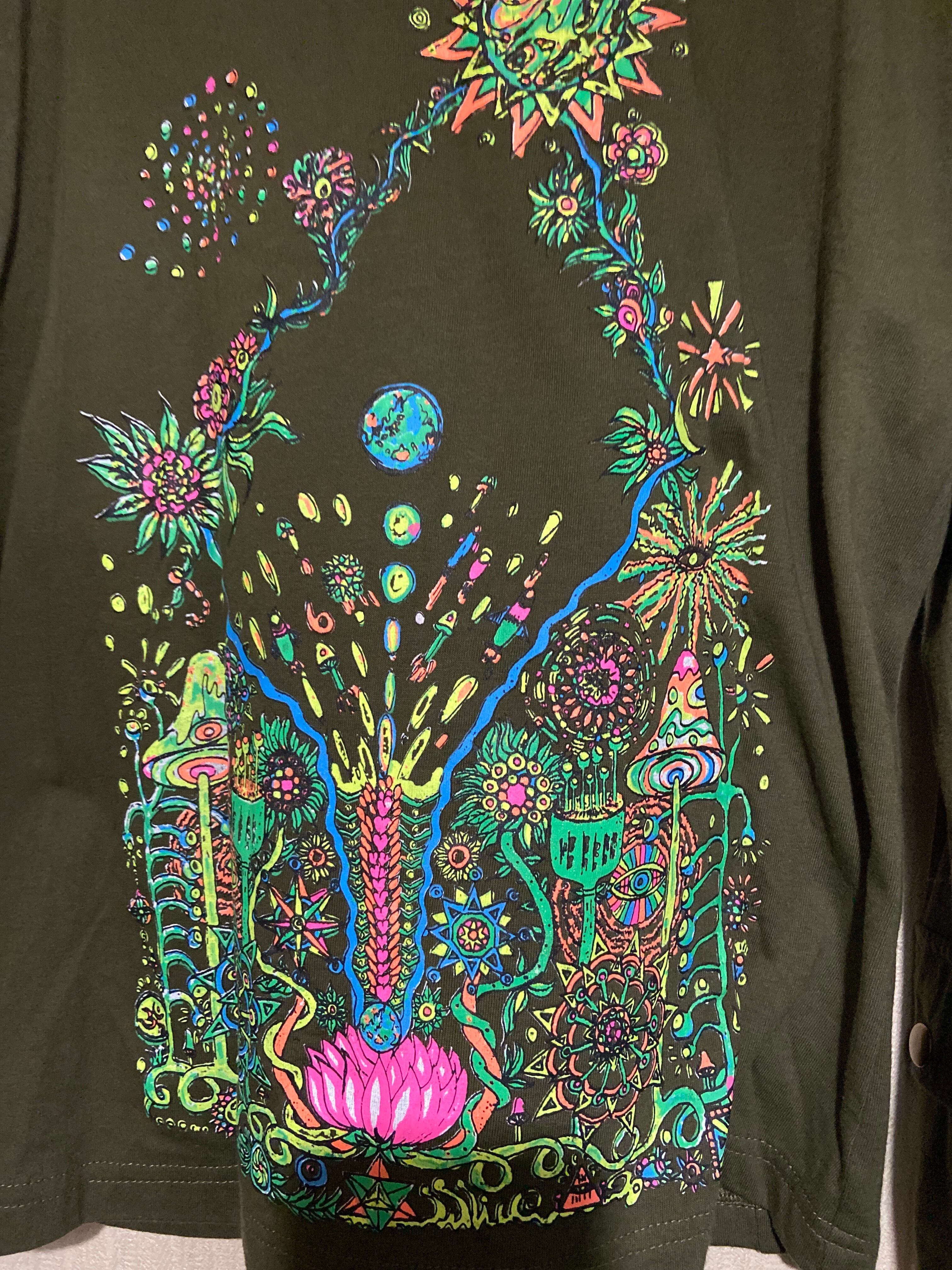 プリントの絵はアヤワスカ体験中にこの星に戻る時に強烈な色の世界を抜けハスの花が開く感覚とともに生まれ変わって出てきた世界を描いてます