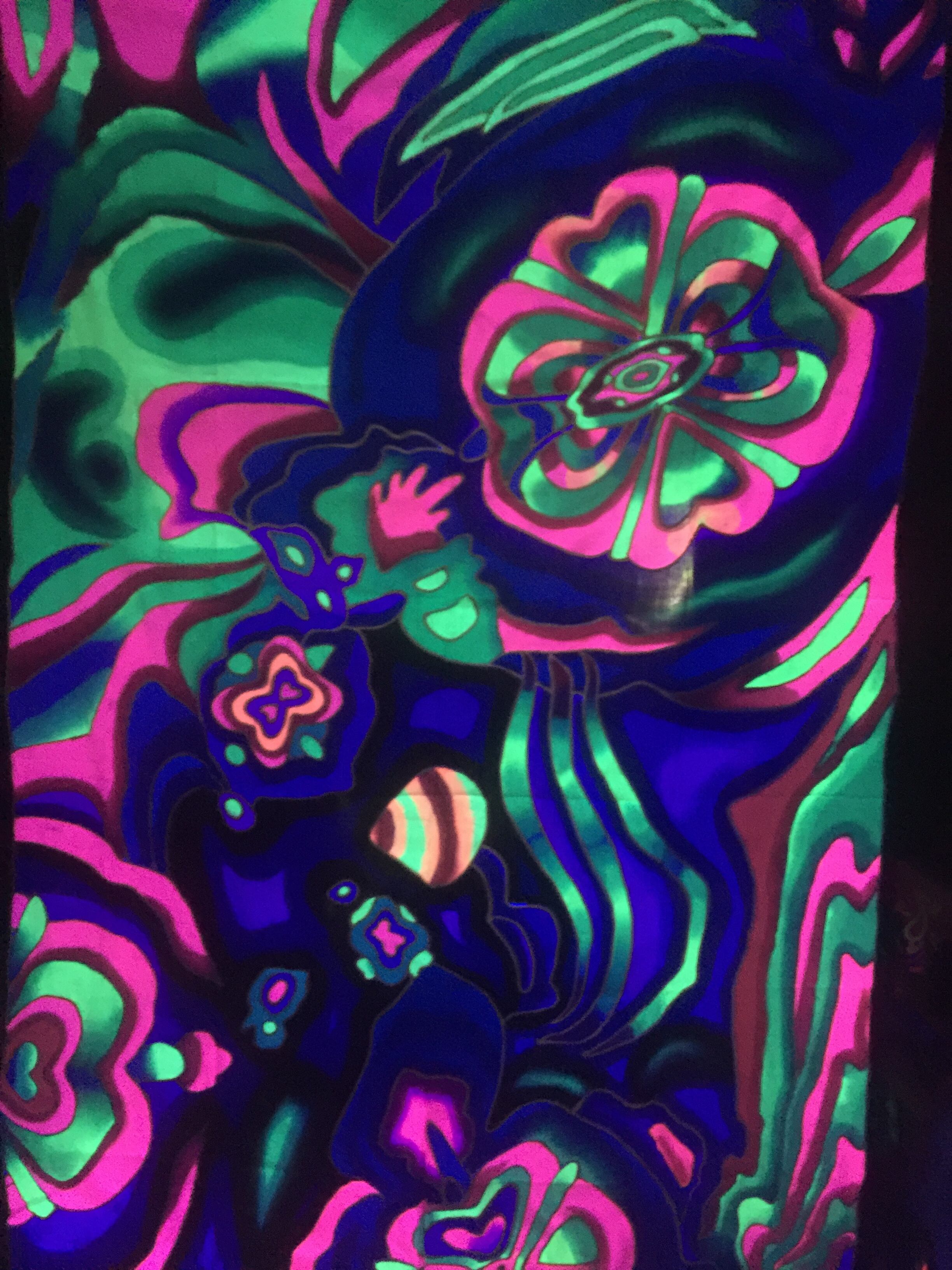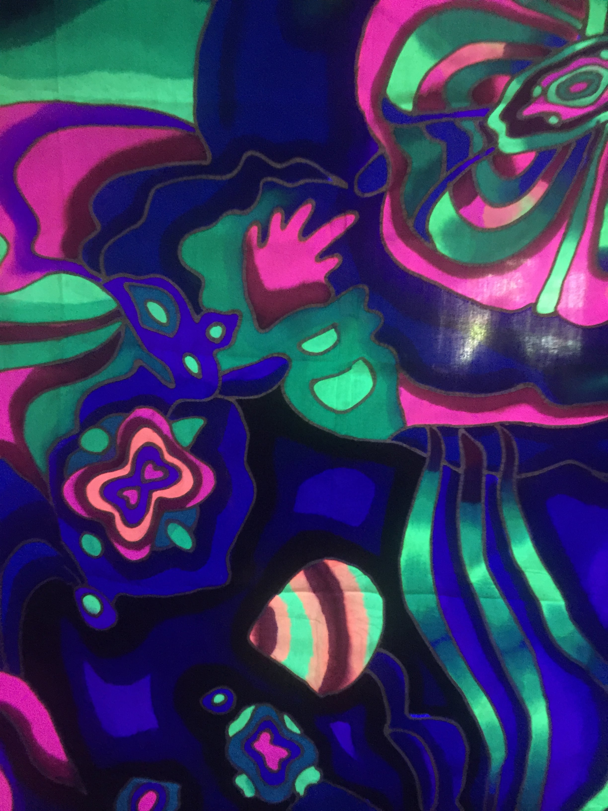 布に蛍光塗料を使いろうけつ染めアートしたタペストリーです。部屋の模様替えやイベントのデコレーション*バックドロップなどに最適です。ブラックライトに反応してサイケデリックな世界が楽しめます。