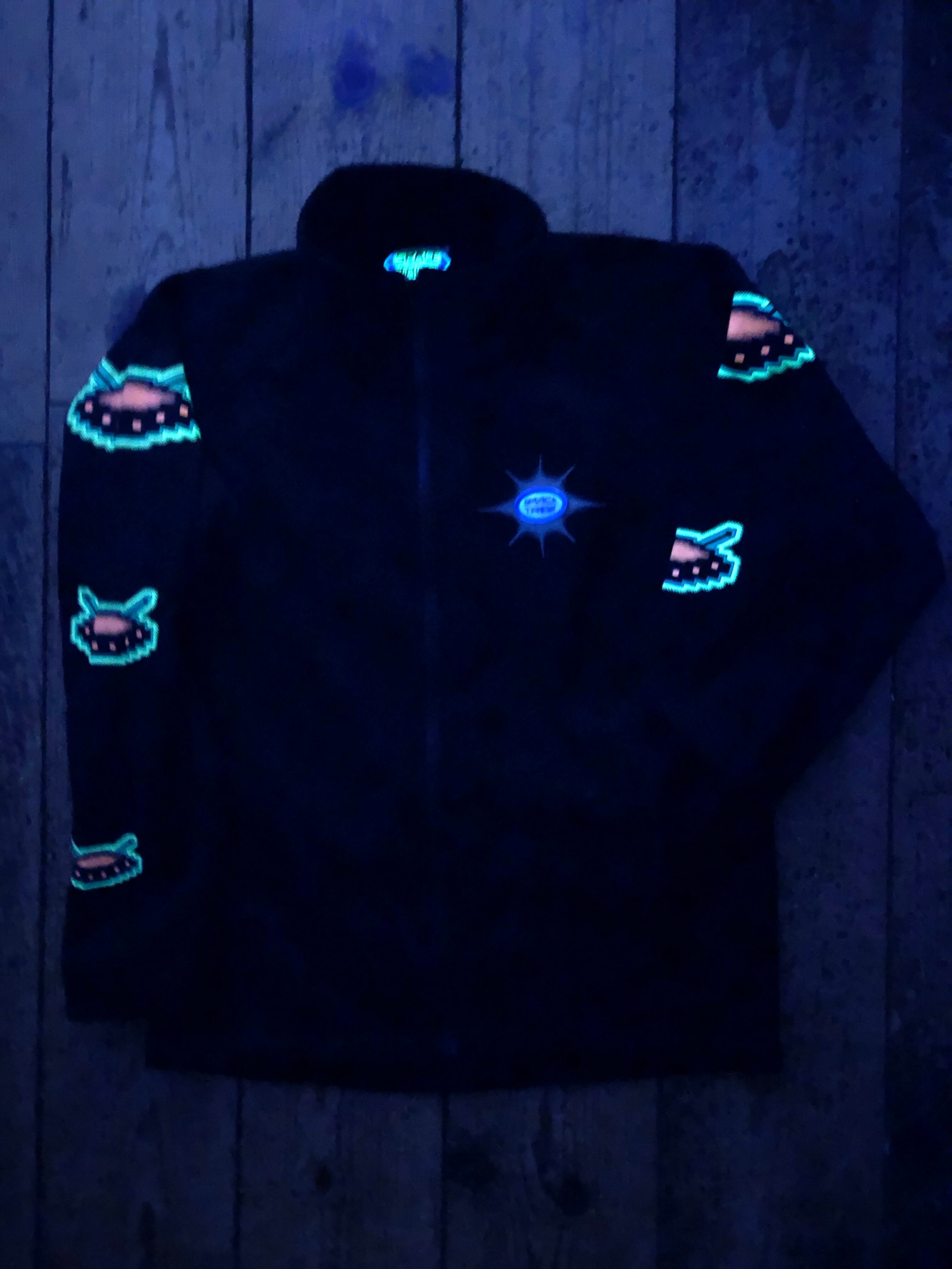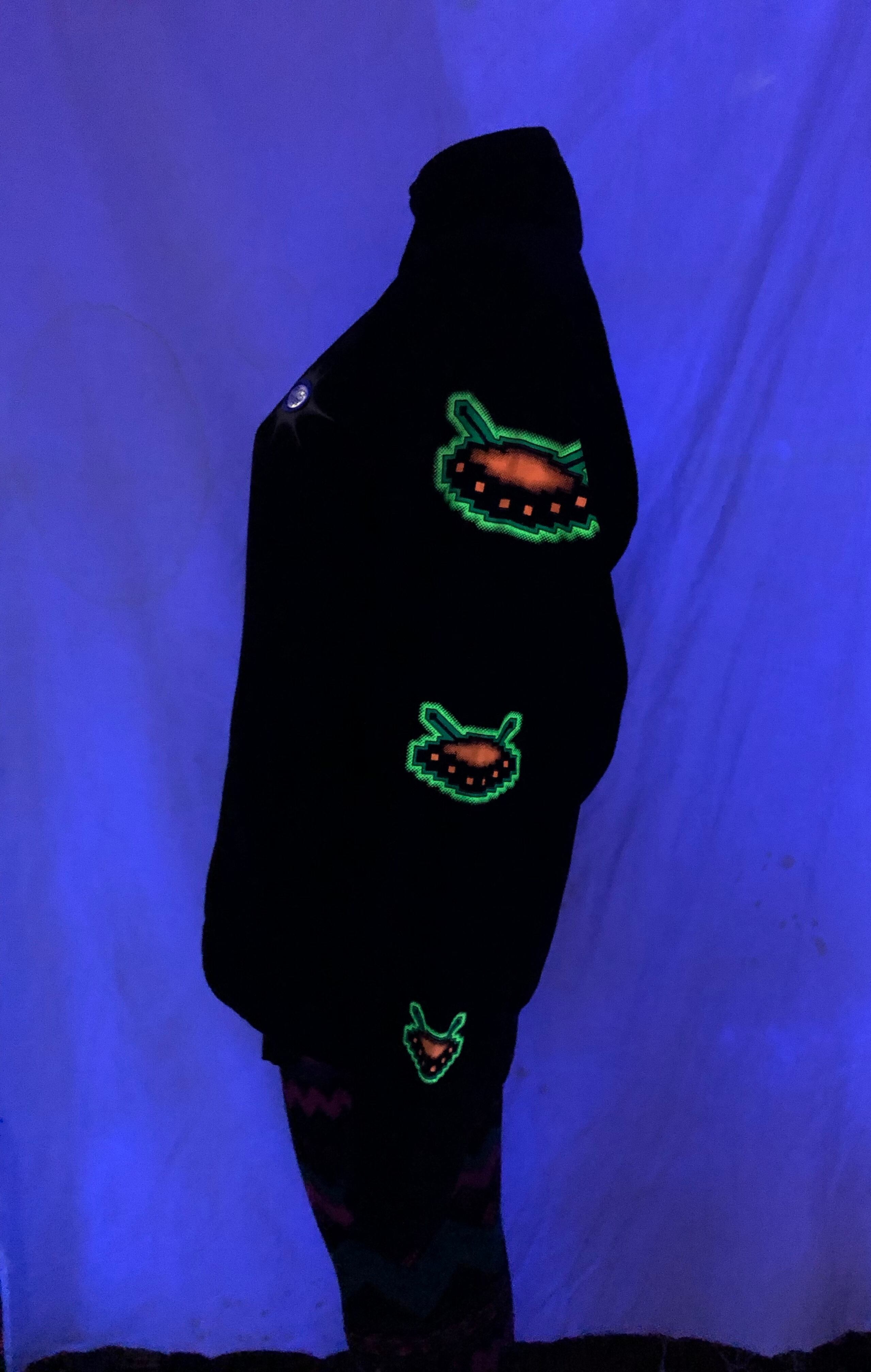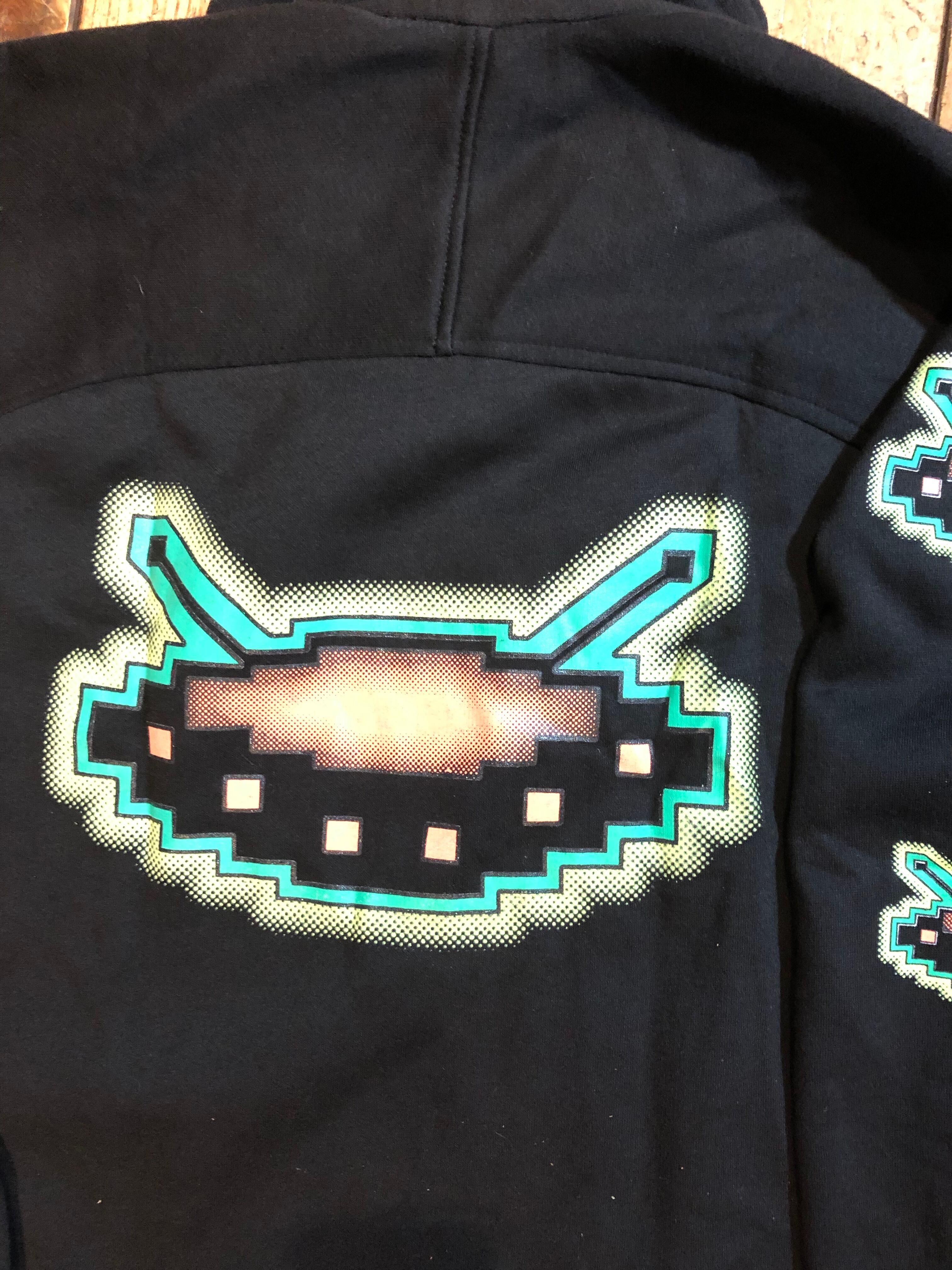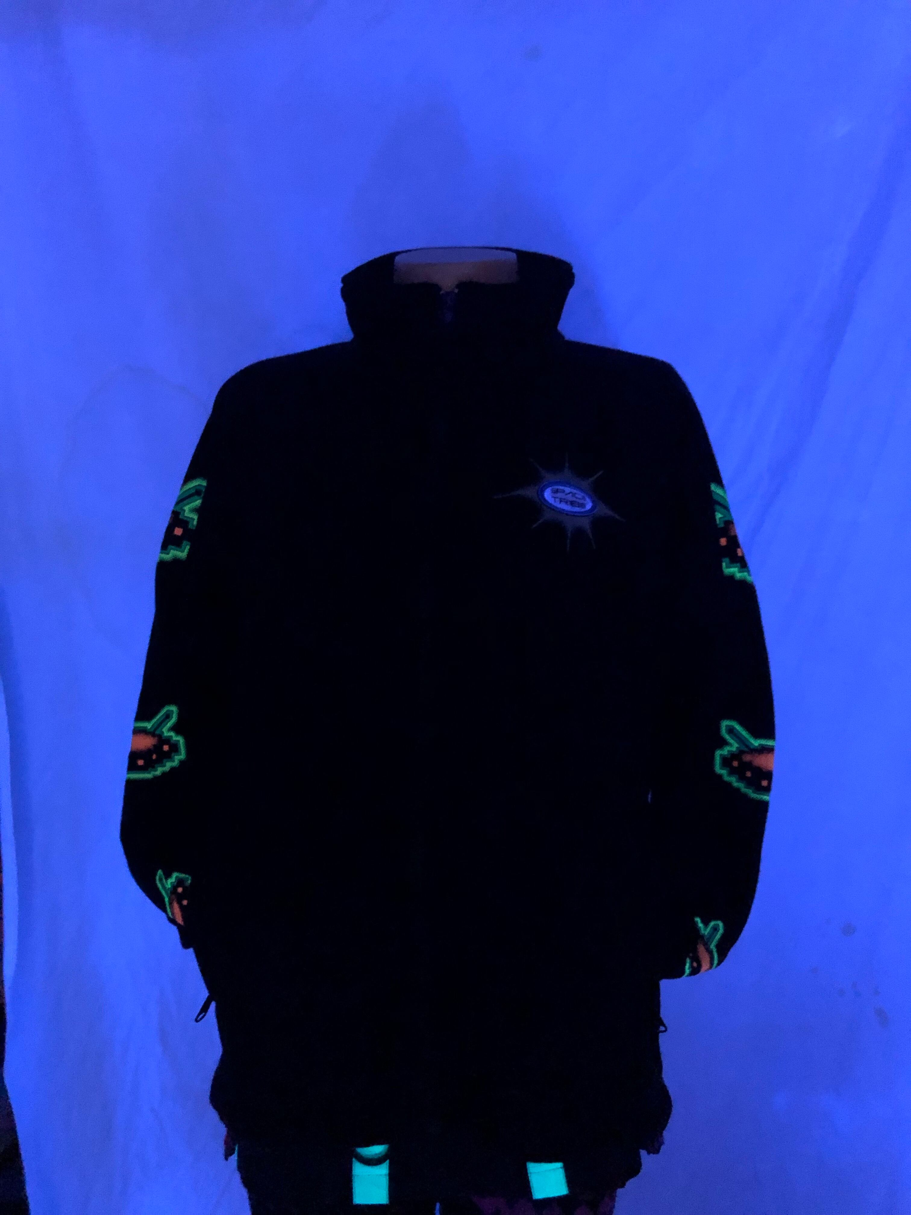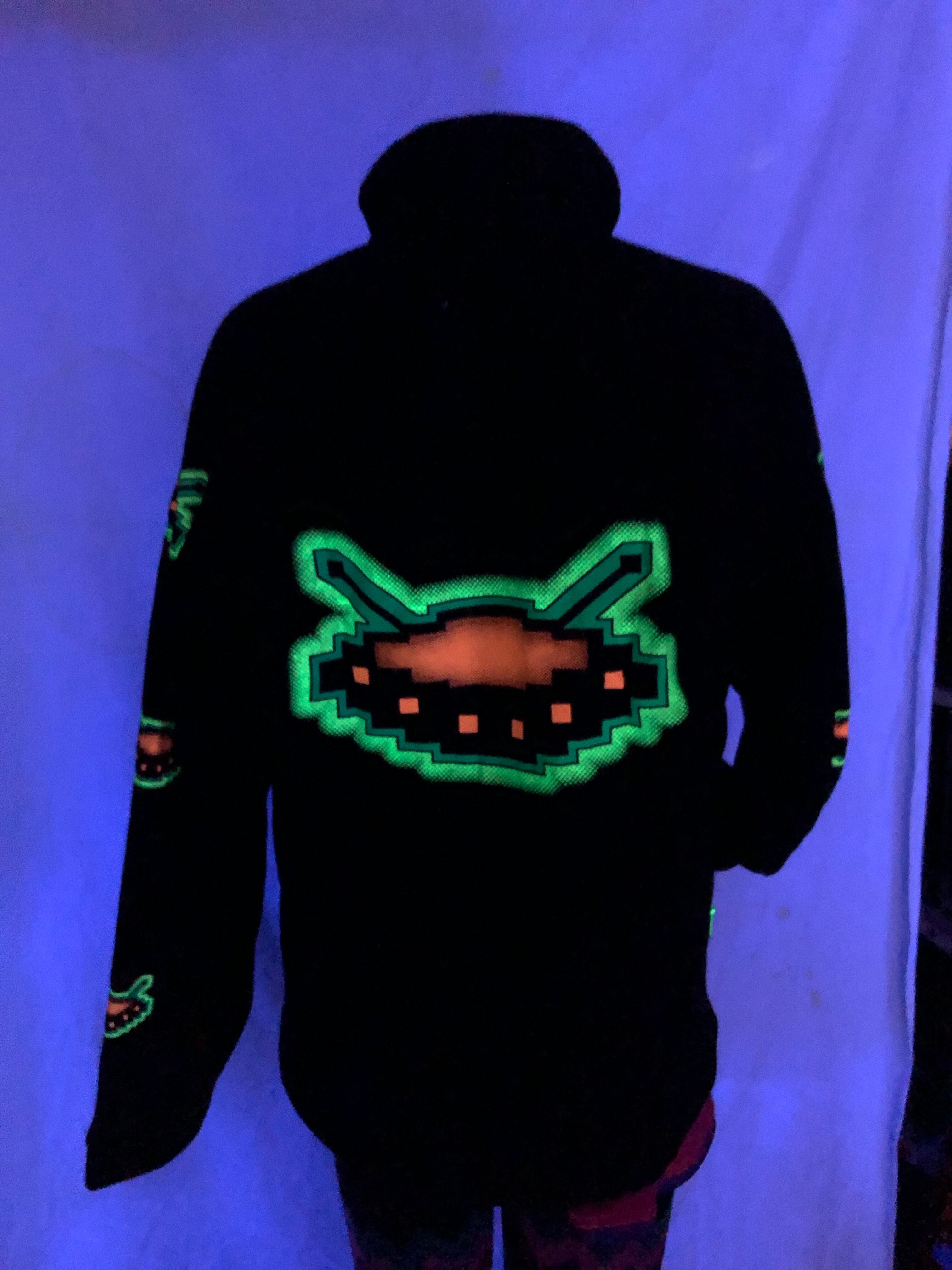 プリントはフロント、バック、スリブ、4箇所で蛍光インクを使いシルクスクリーンで手刷りプリントしています、蛍光インクを使ってますのでUVライトに反応して光ります。