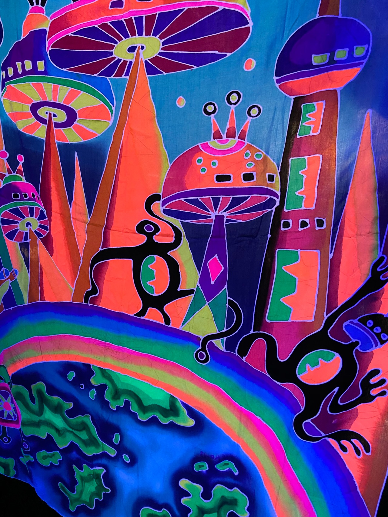 布に蛍光塗料を使いろうけつ染めアートしたタペストリーです。部屋の模様替えやイベントのデコレーション*バックドロップなどに最適です。ブラックライトに反応してサイケデリックな世界が楽しめます。