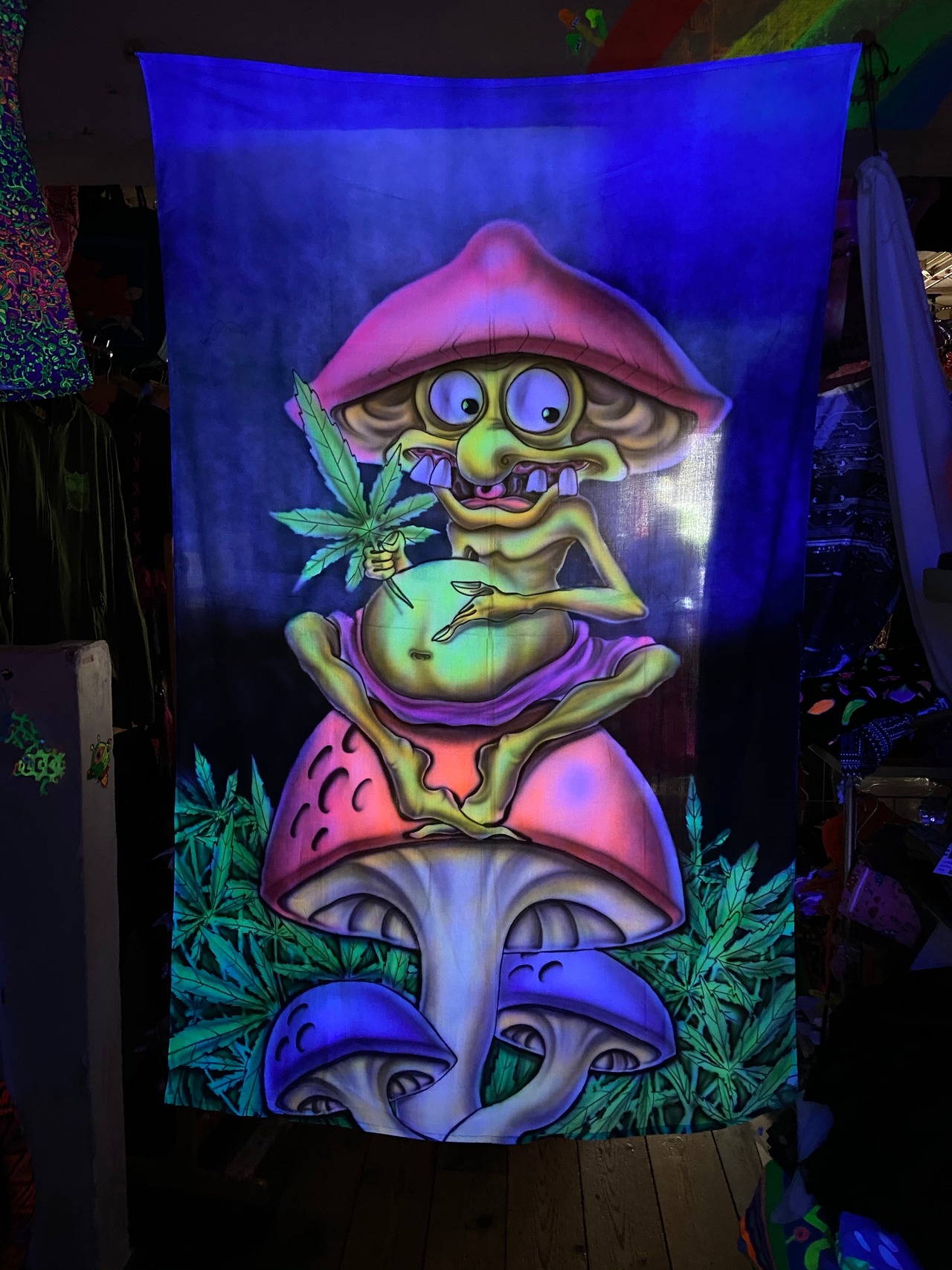 布に蛍光塗料を使いエアーブラシでアートしたタペストリーです。部屋の模様替えやイベントのデコレーション*バックドロップなどに最適です。ブラックライトに反応してサイケデリックな世界が楽しめます。