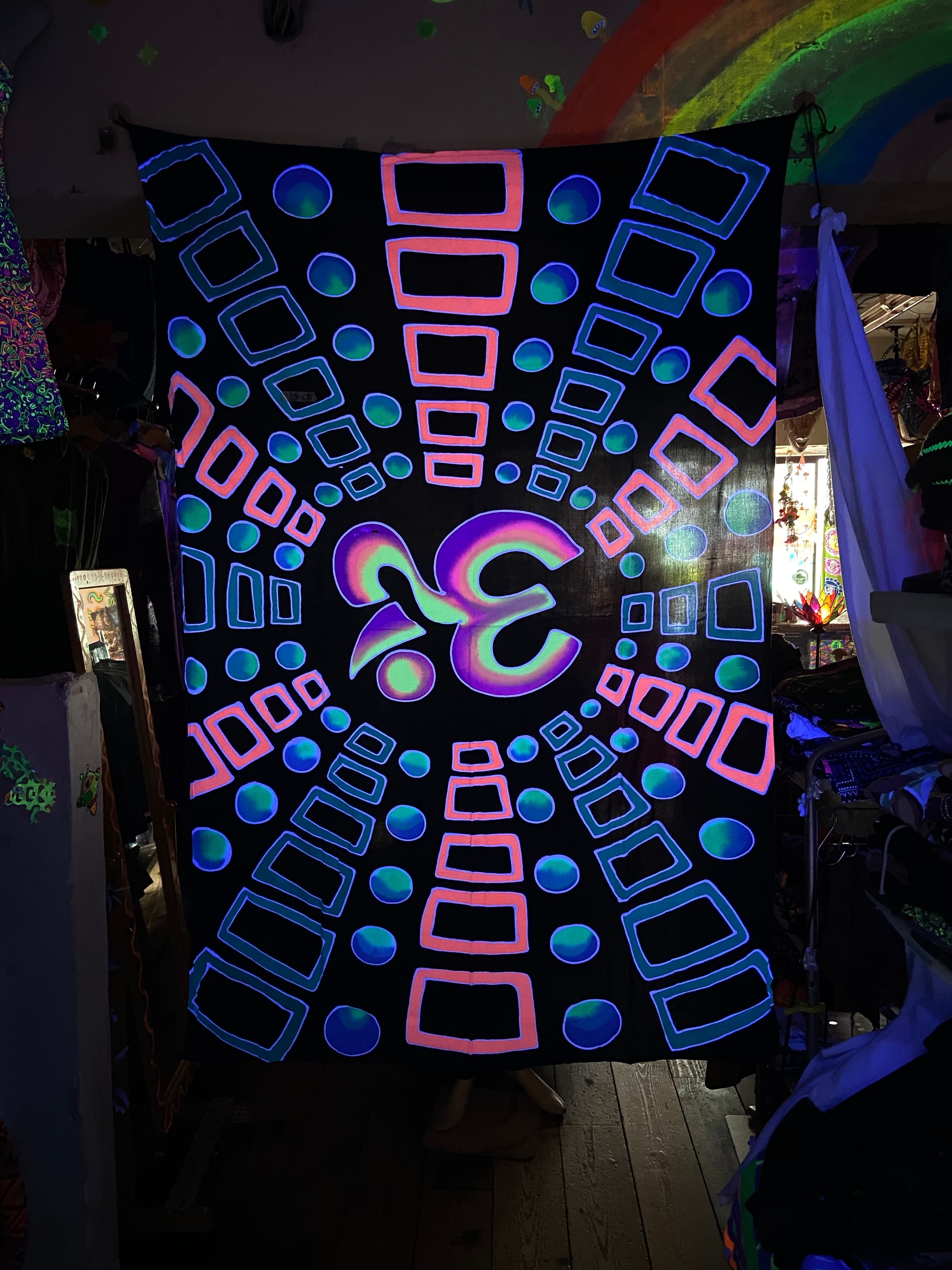 布に蛍光塗料を使いろうけつ染めアートしたタペストリーです。部屋の模様替えやイベントのデコレーション*バックドロップなどに最適です。ブラックライトに反応してサイケデリックな世界が楽しめます