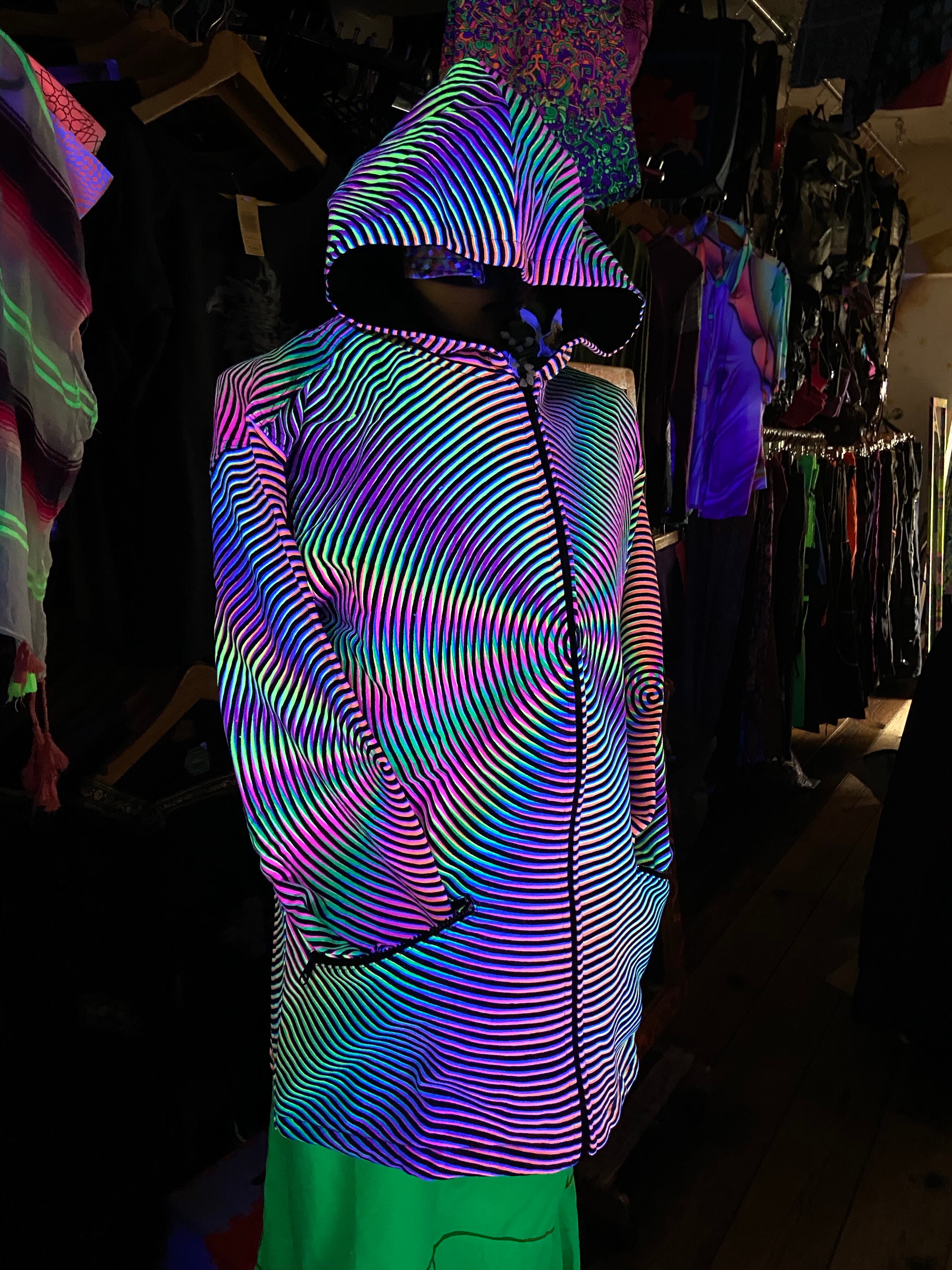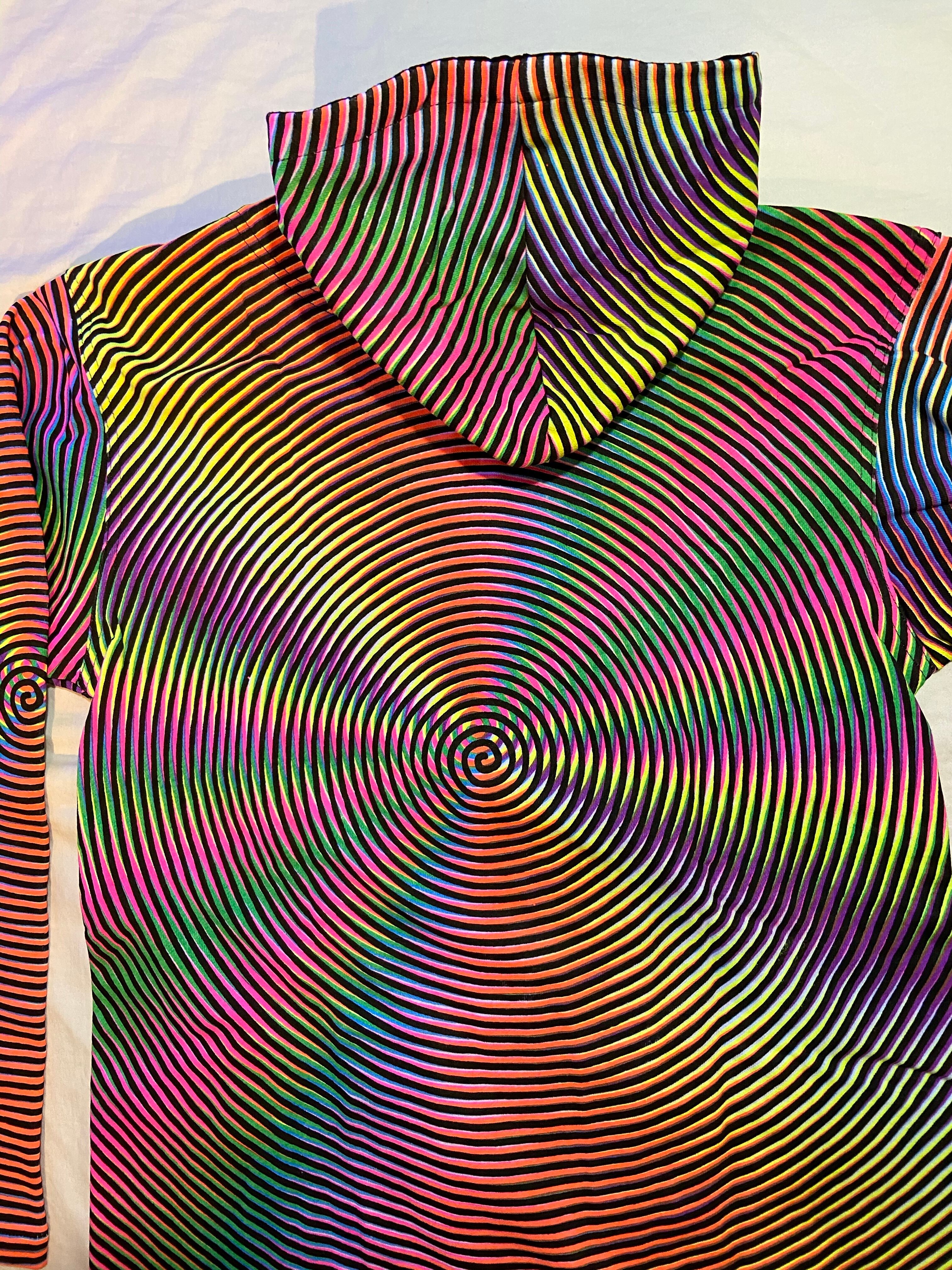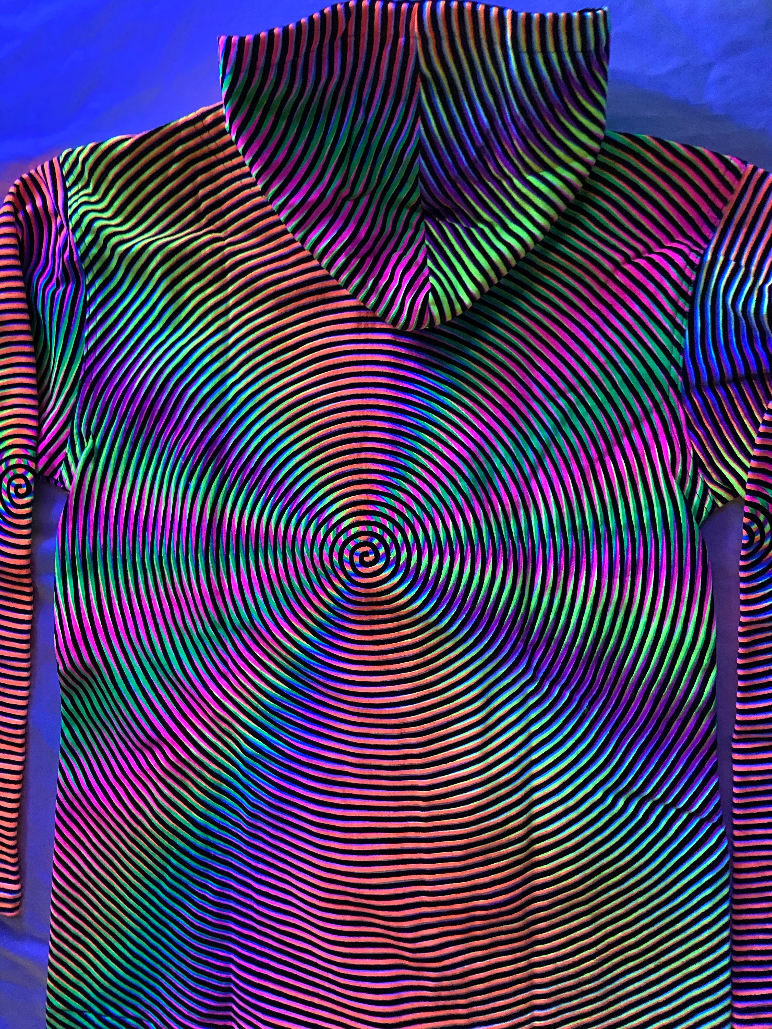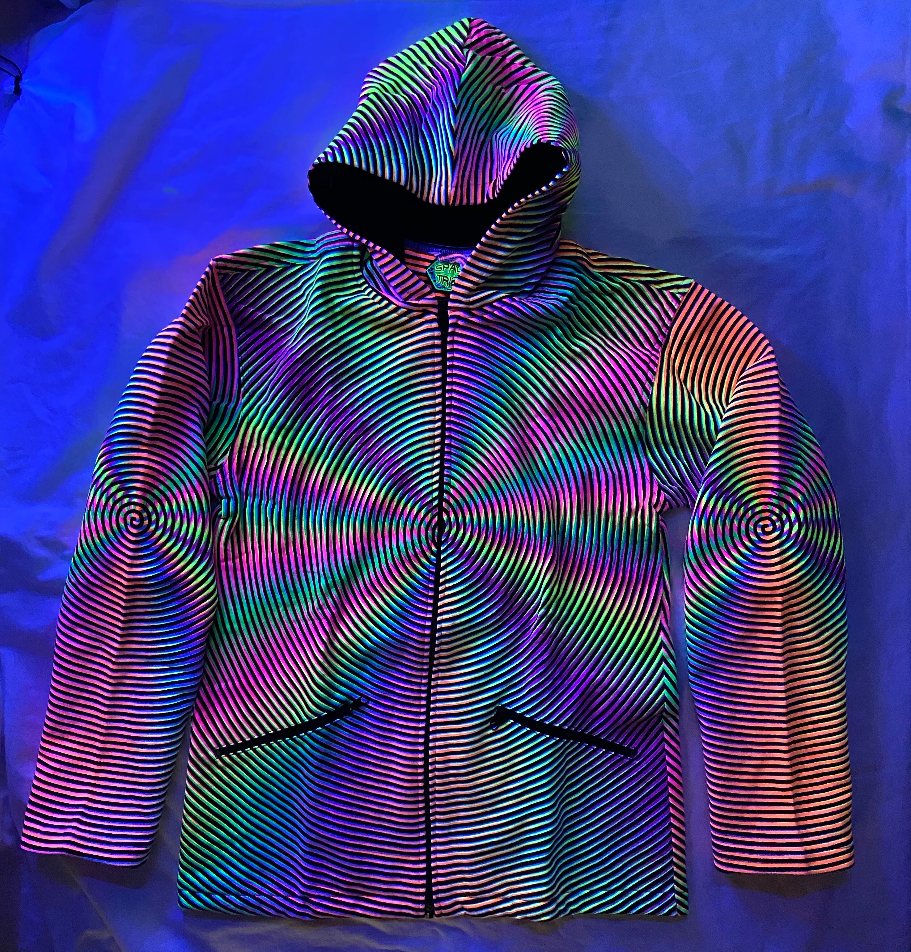 蛍光インクを使用してシルクスクリーンで手刷プリントしたスペーストライブ オリジナルフードジャケット