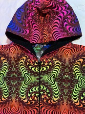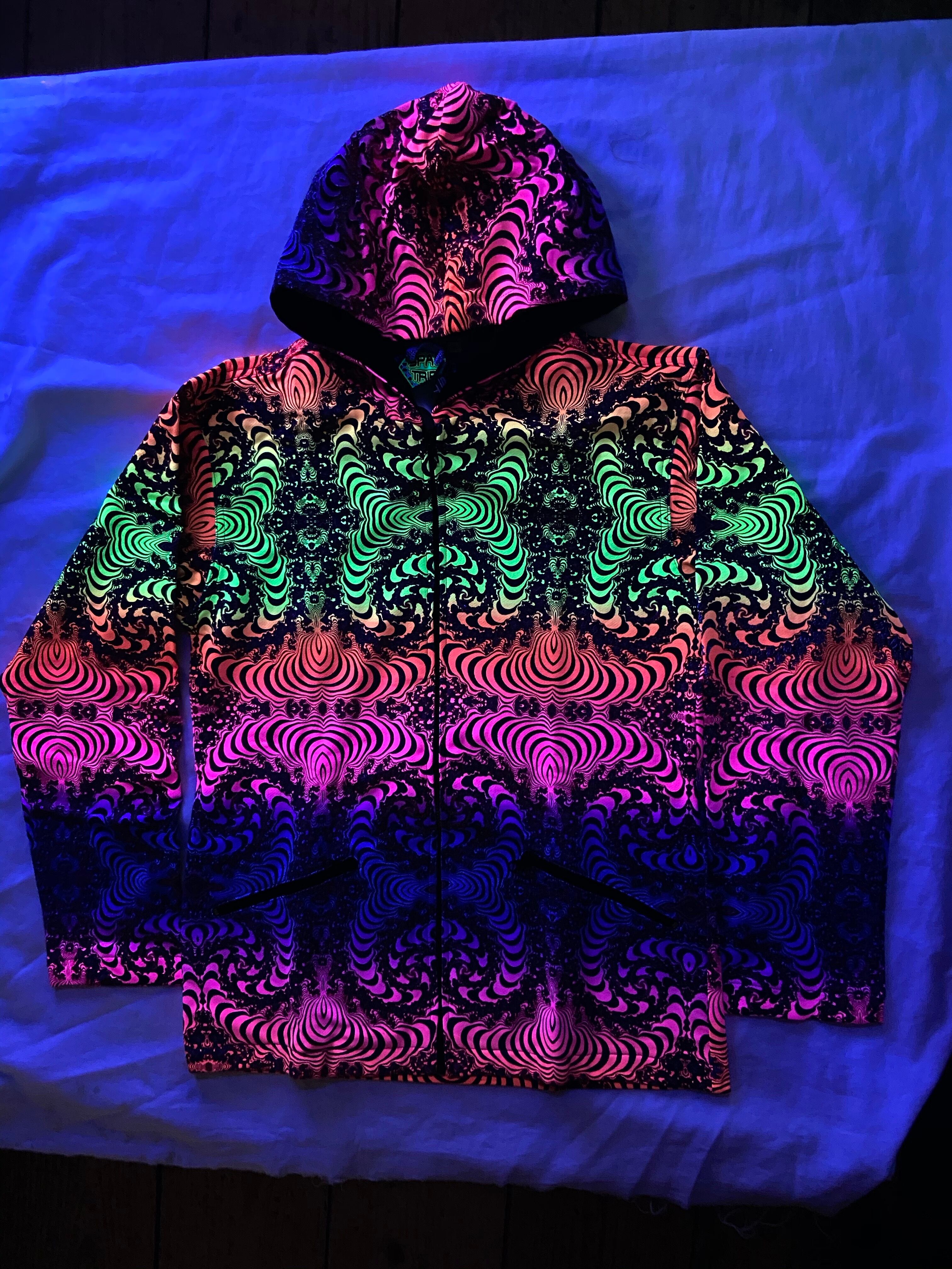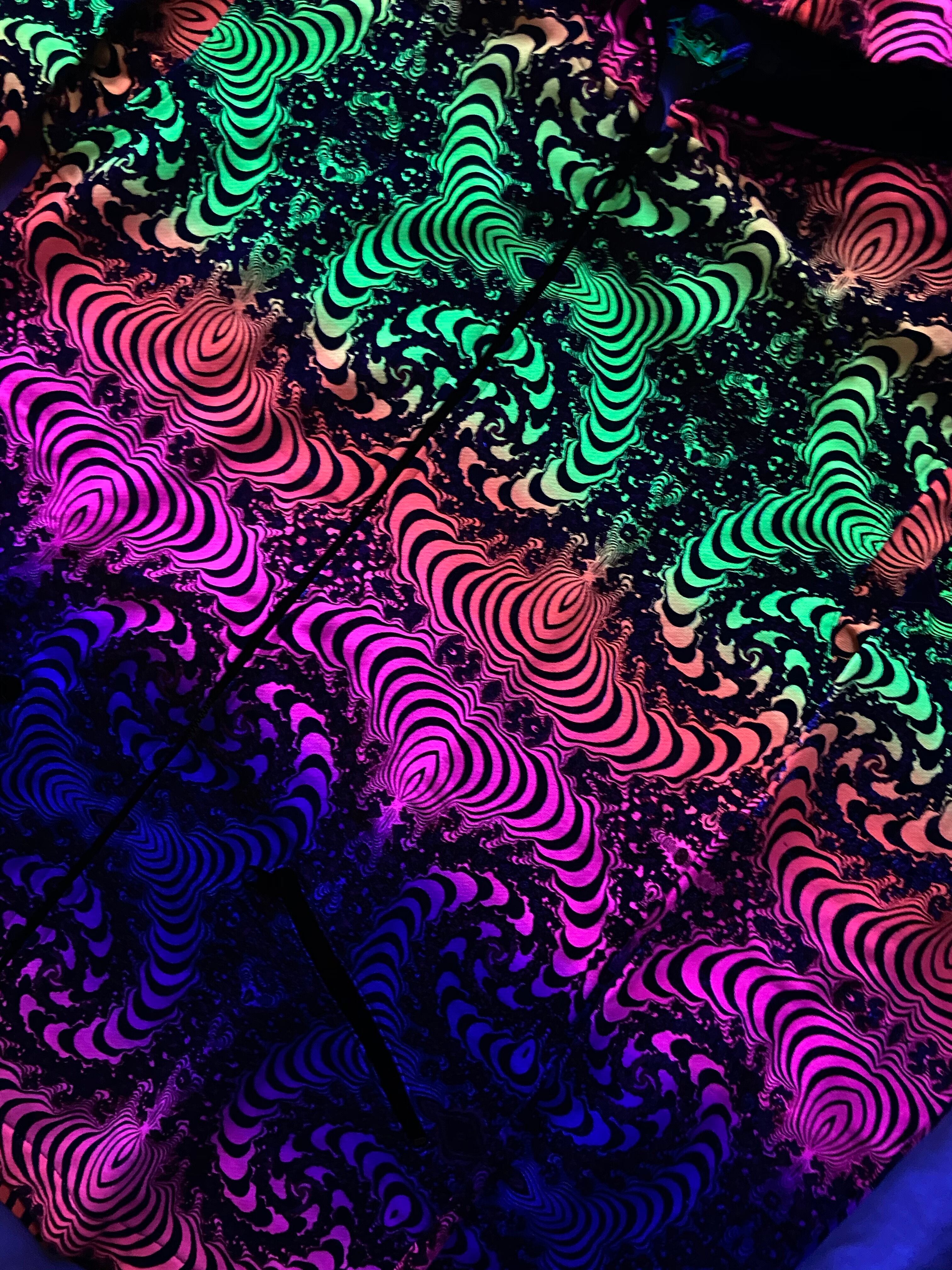 蛍光インクを使用してシルクスクリーンで手刷プリントしたスペーストライブ オリジナルフードジャケット