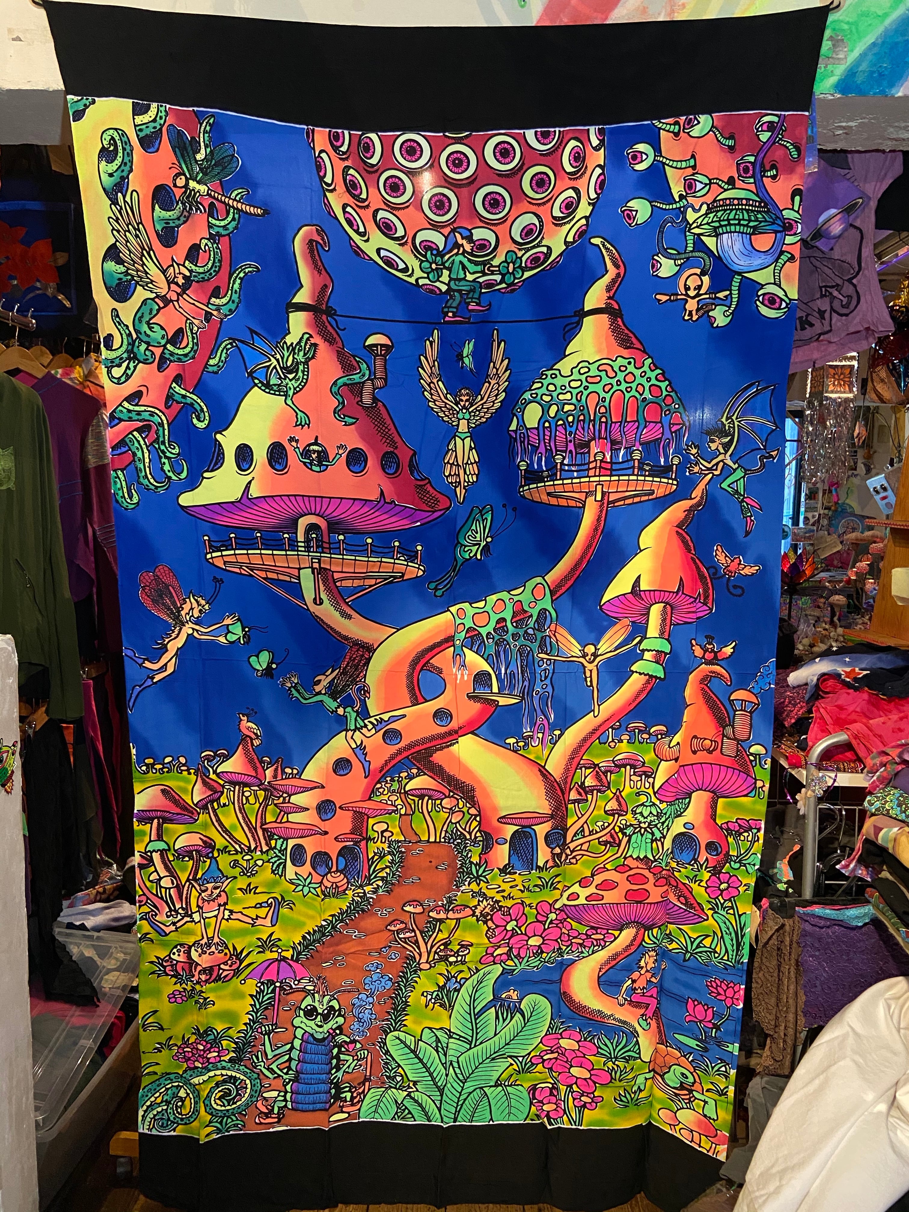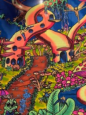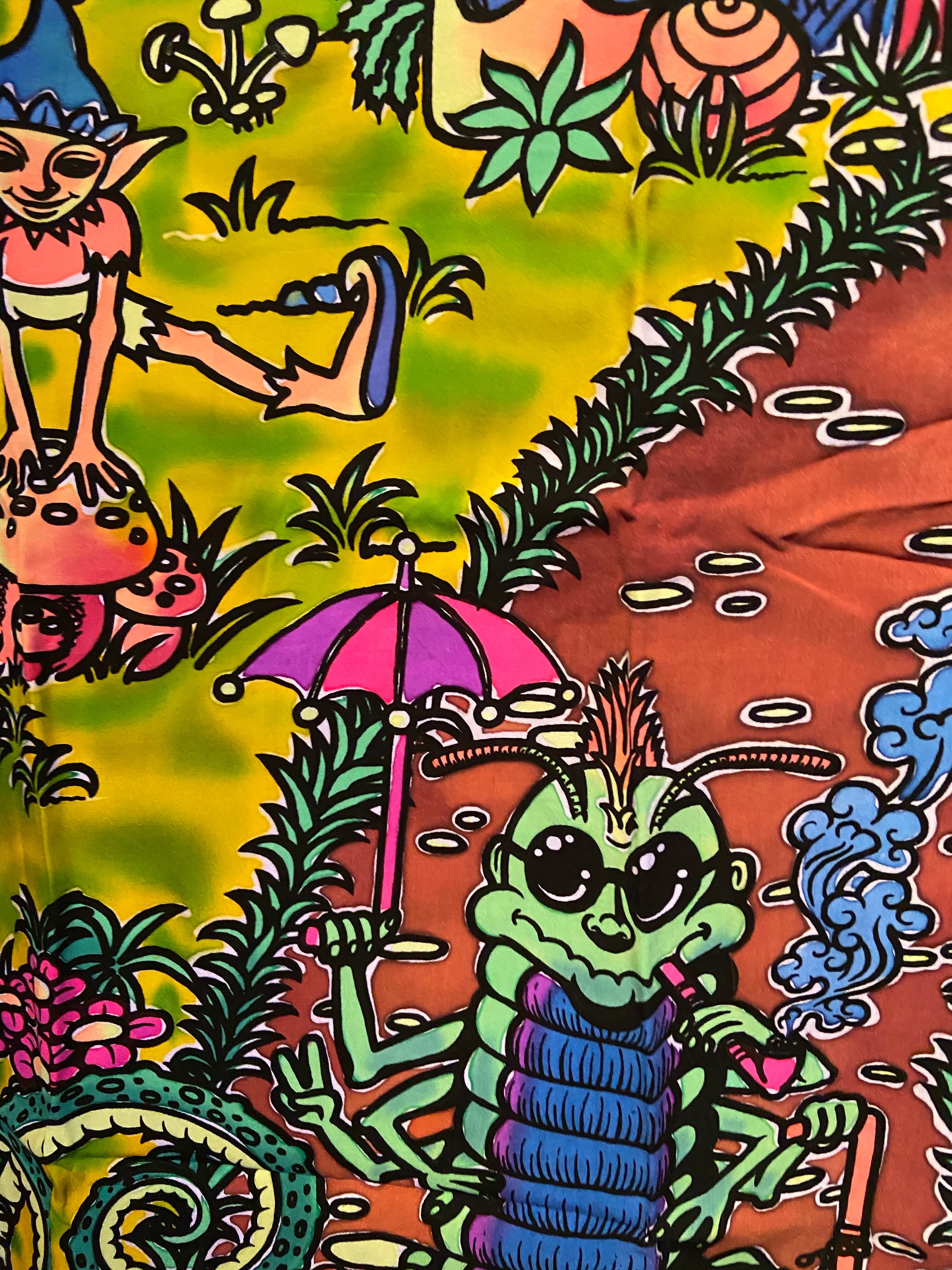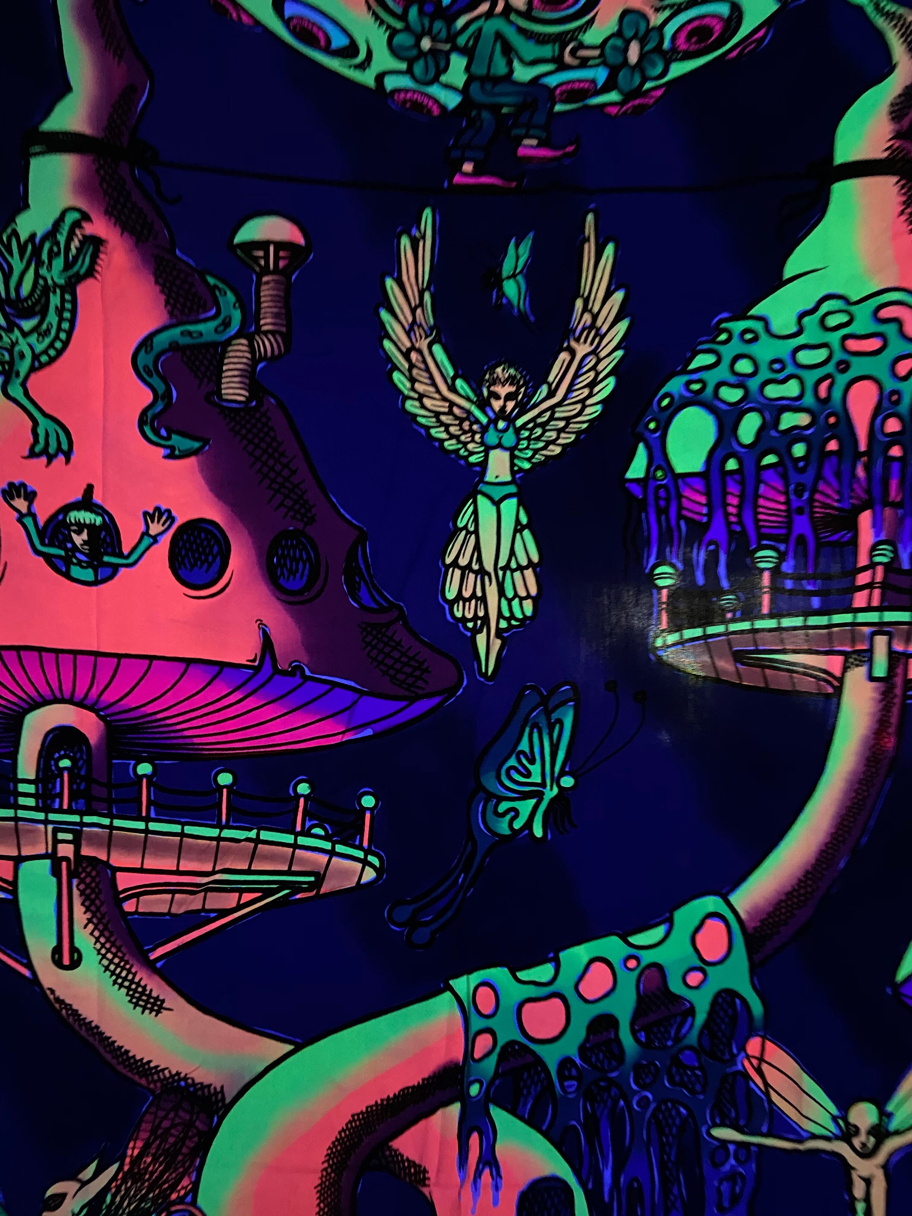 布に蛍光塗料を使いろうけつ染めアートしたタペストリーです。部屋の模様替えやイベントのデコレーション*バックドロップなどに最適です。ブラックライトに反応してサイケデリックな世界が楽しめます。