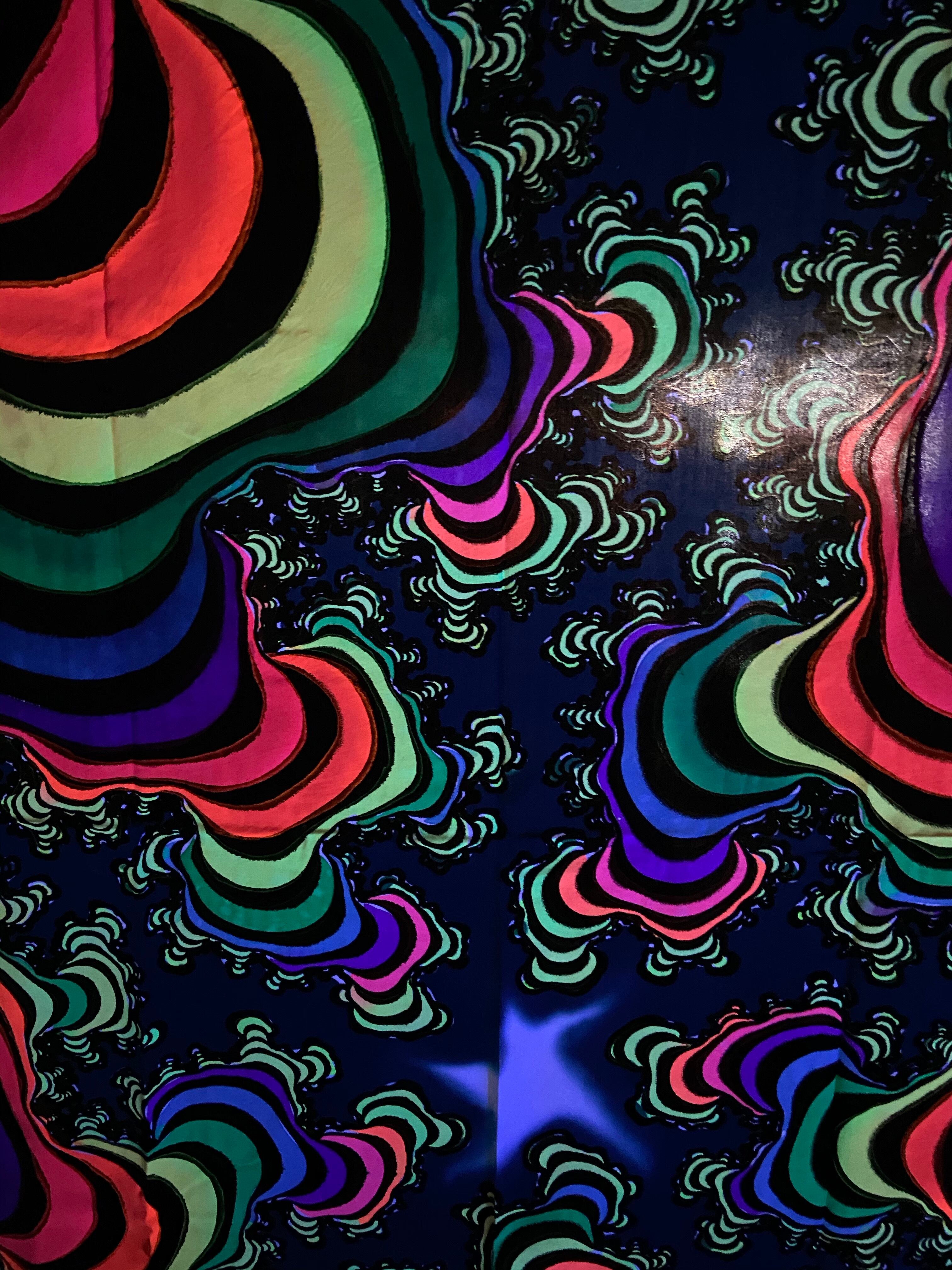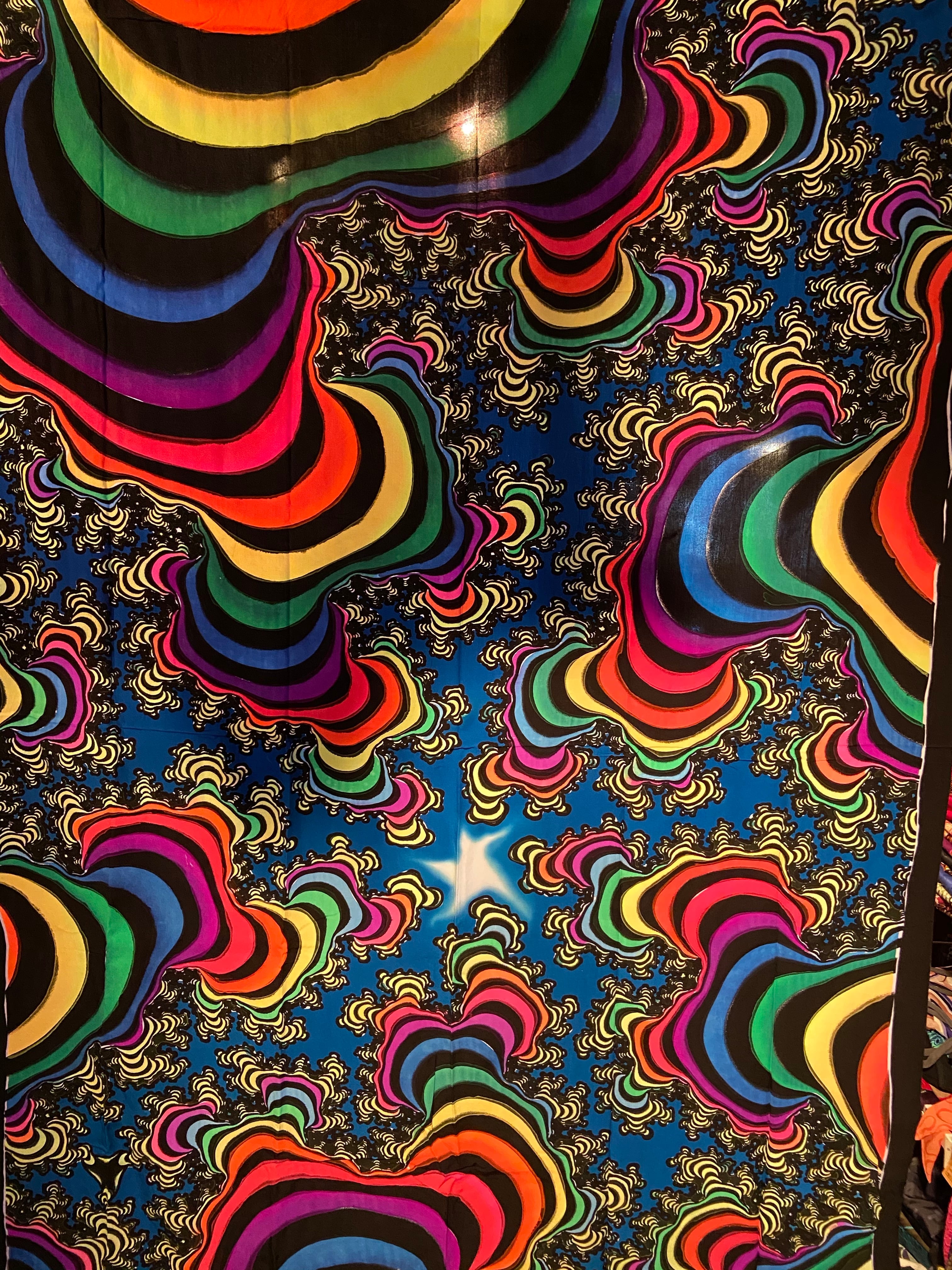 生地レーヨンに蛍光塗料を使いろうけつ染めアートしたタペストリーです。部屋の模様替えやイベントのデコレーション*バックドロップなどに最適です。ブラックライトに反応してサイケデリックな世界が楽しめます。