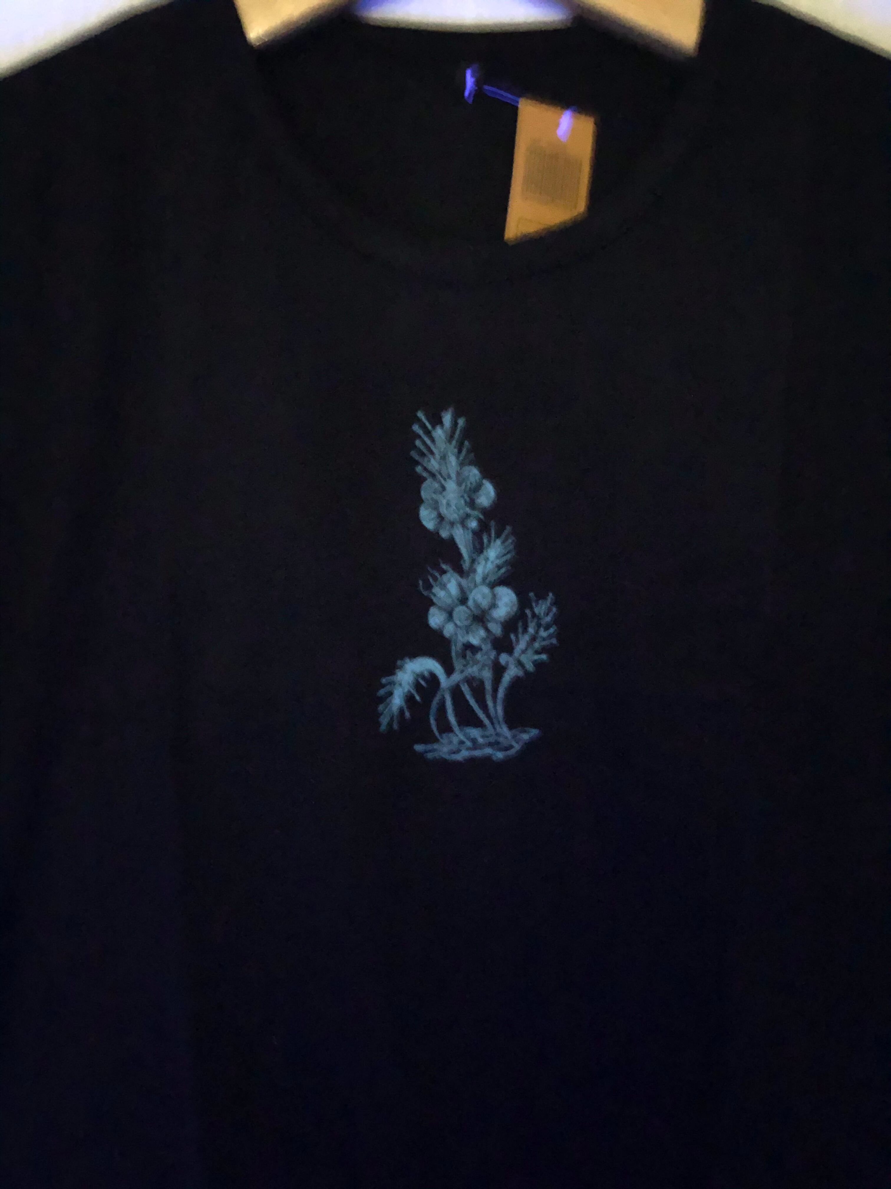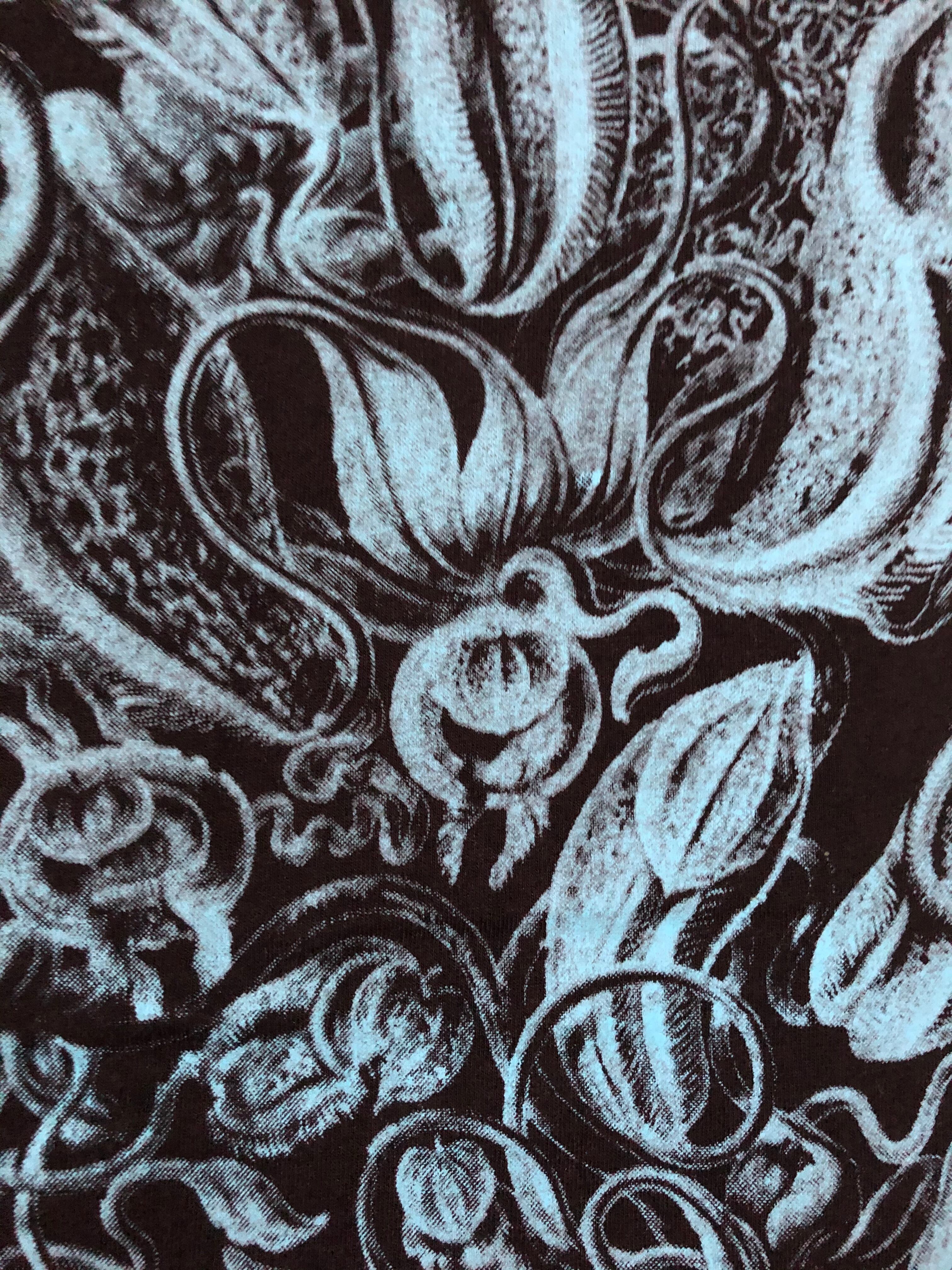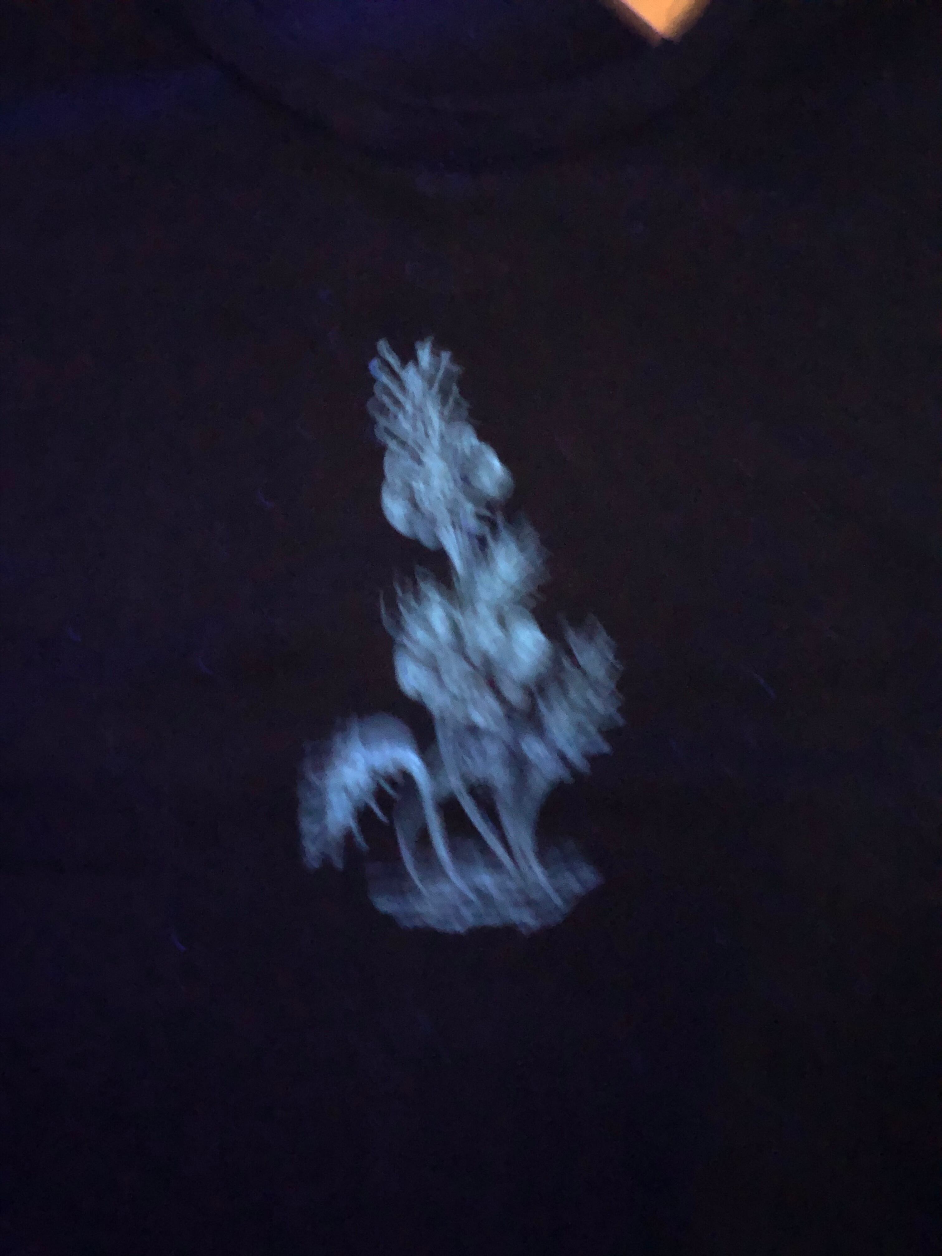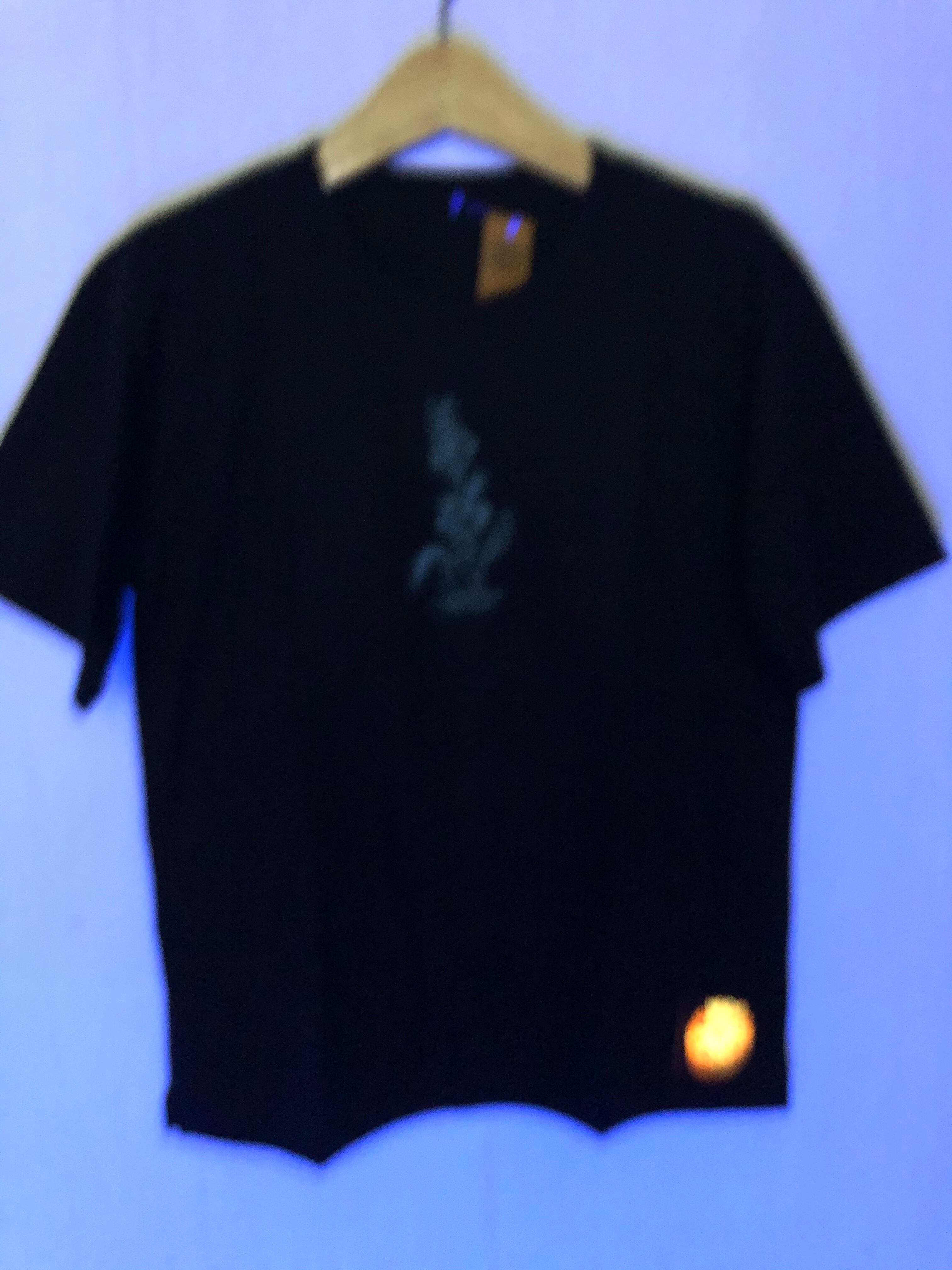 ブラックの生地にブルーのプリントが入ってます。ブラックライトで少しだけ光ります。
