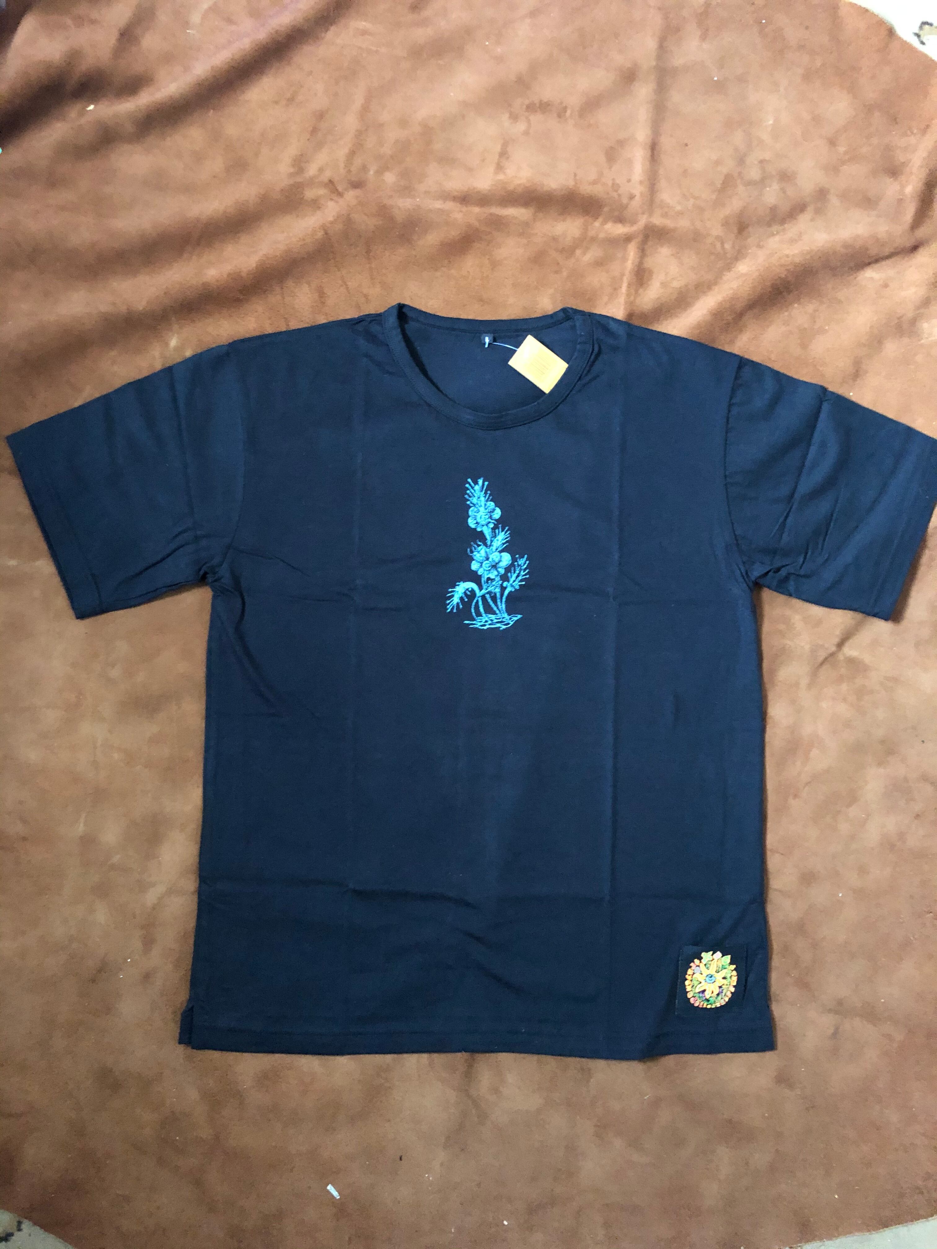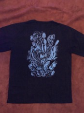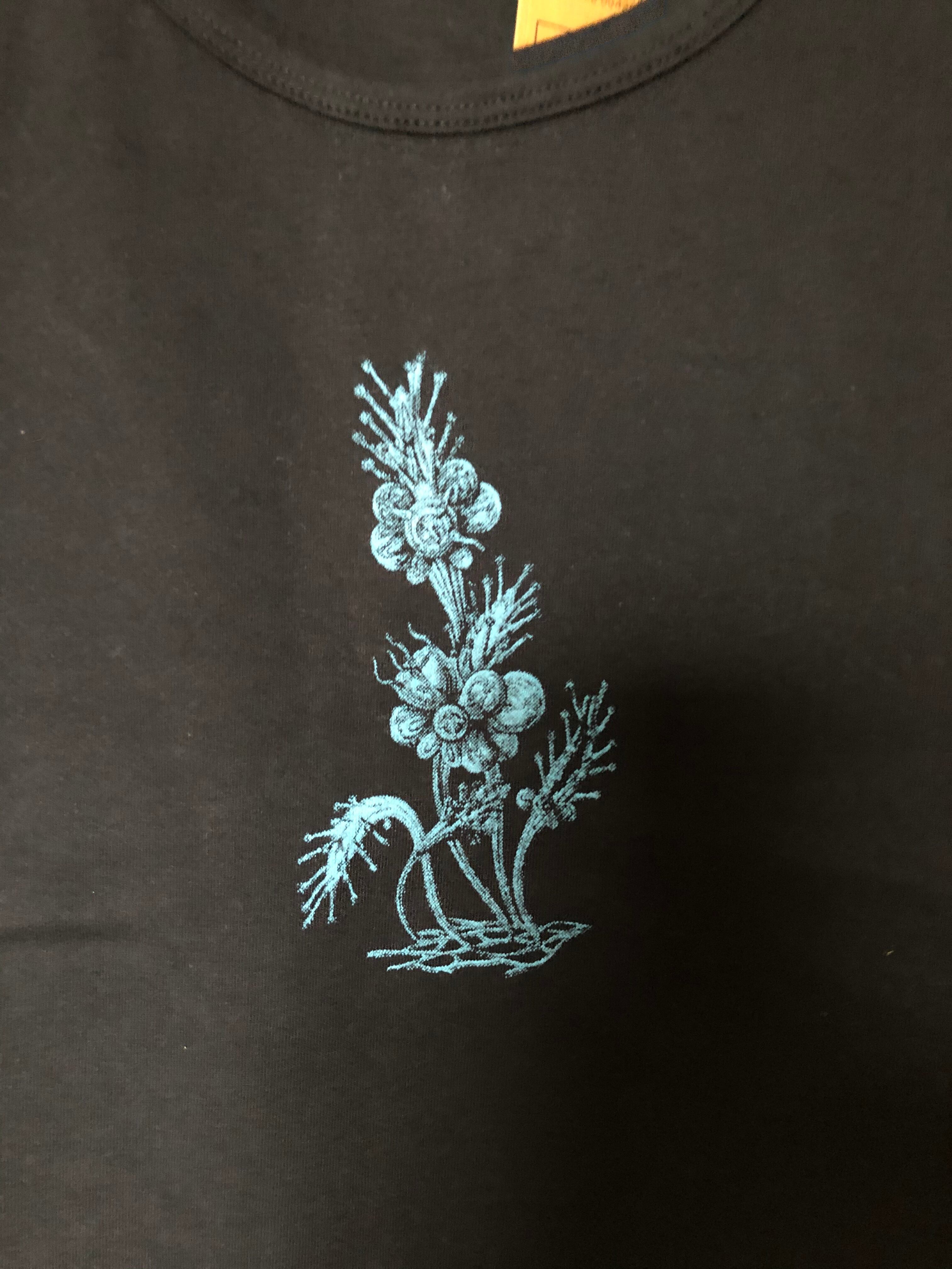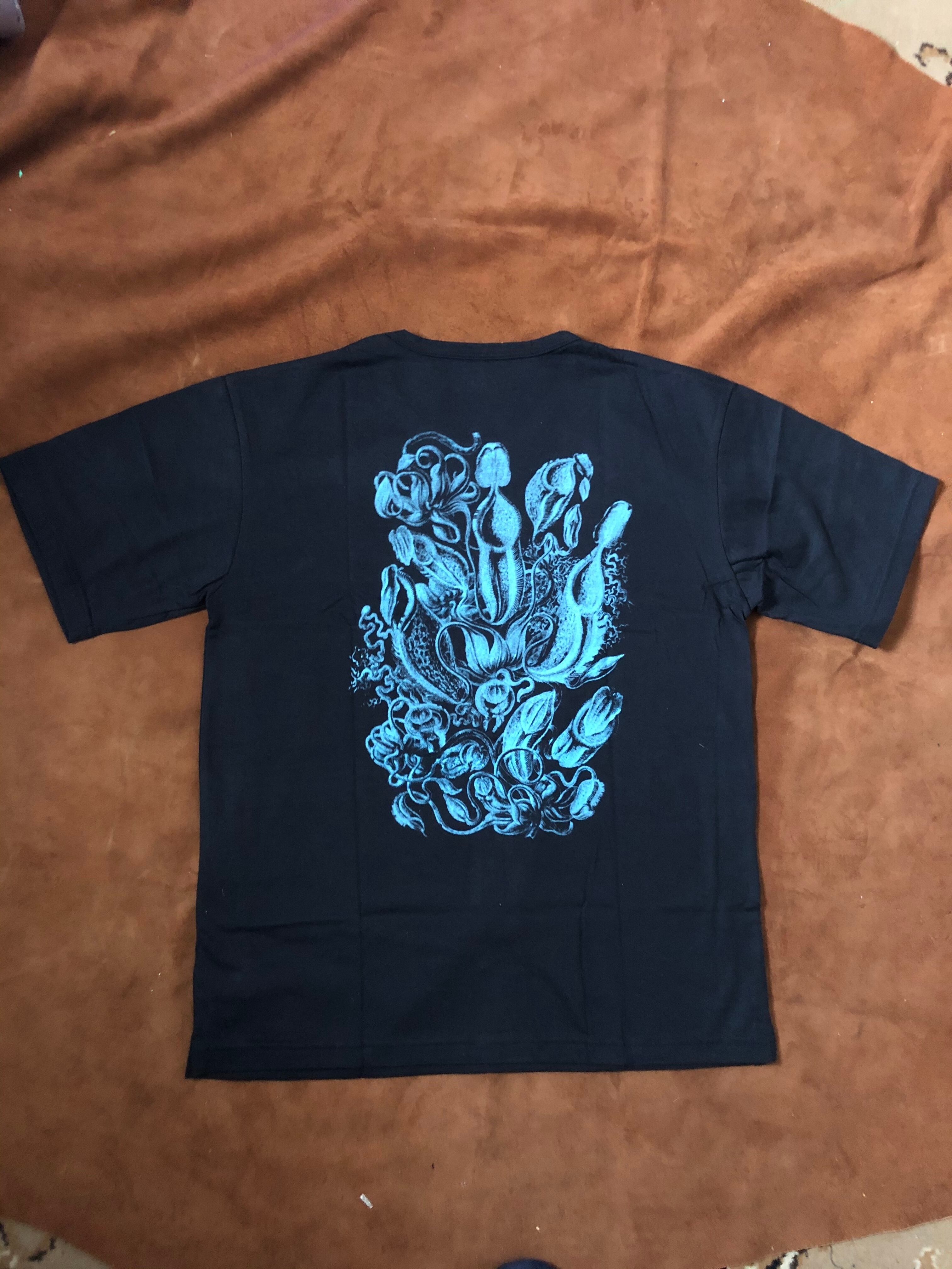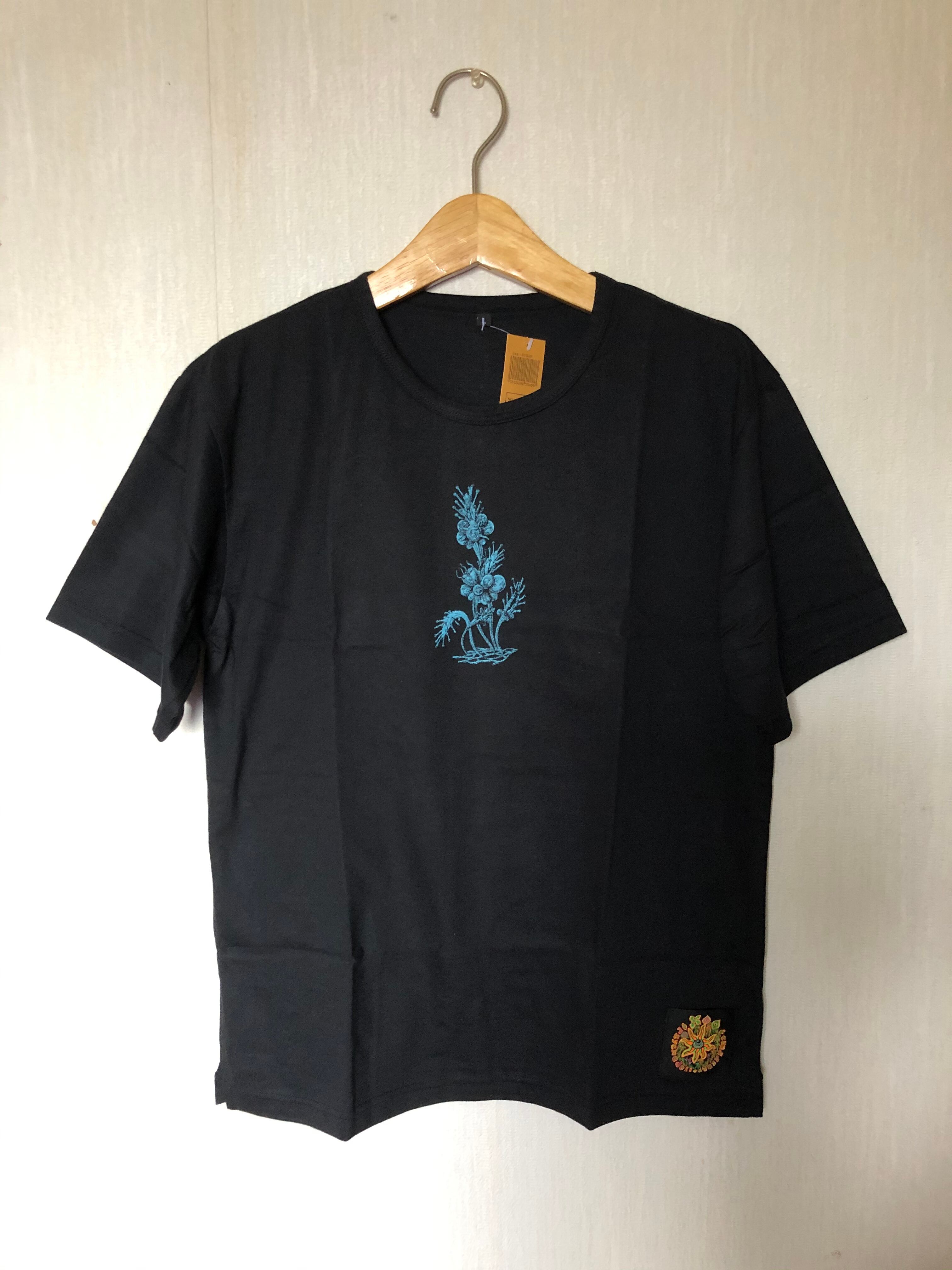 ブラックの生地にブルーのプリントが入ってます。ブラックライトで少しだけ光ります。