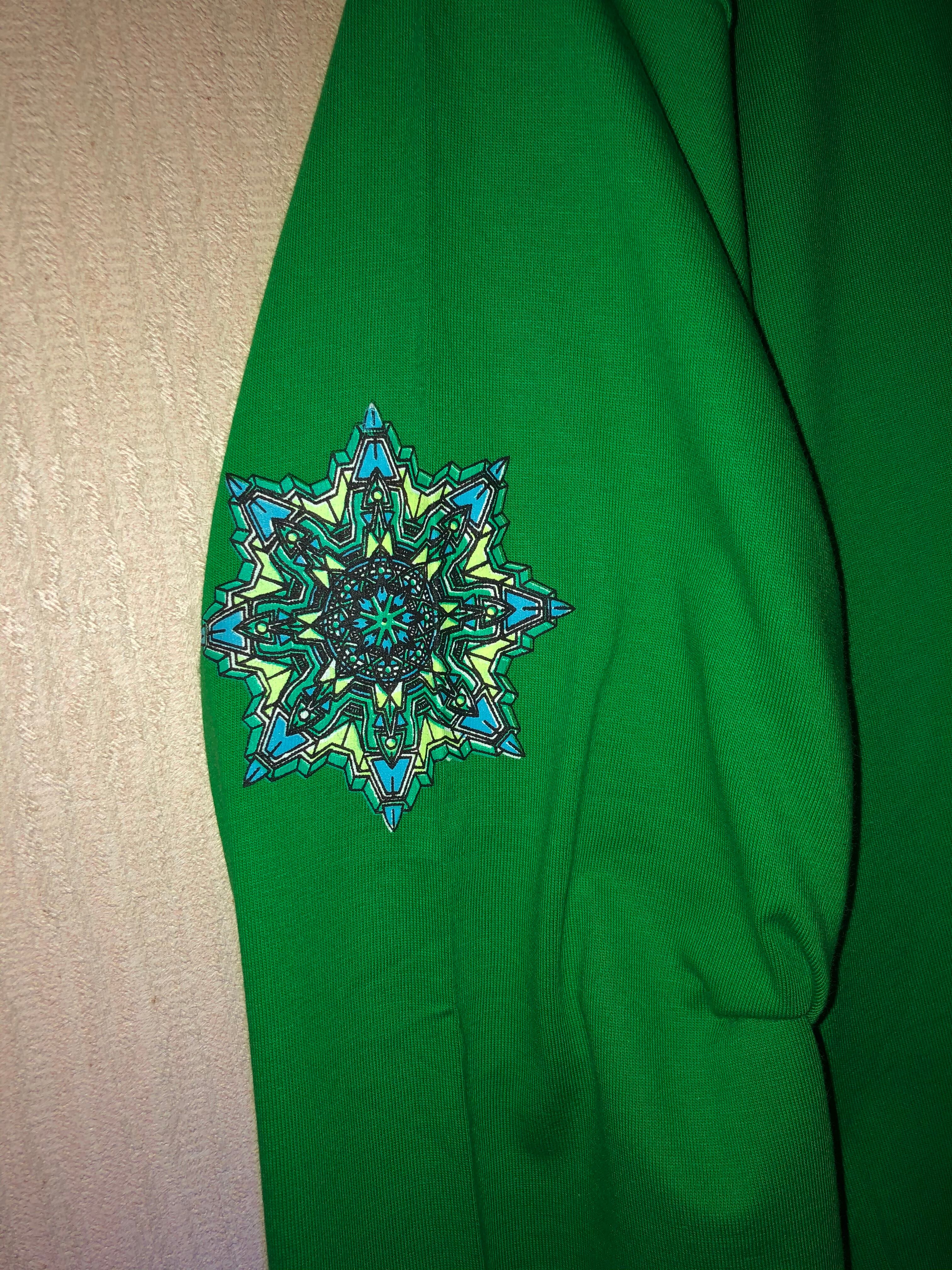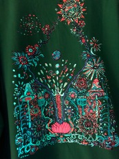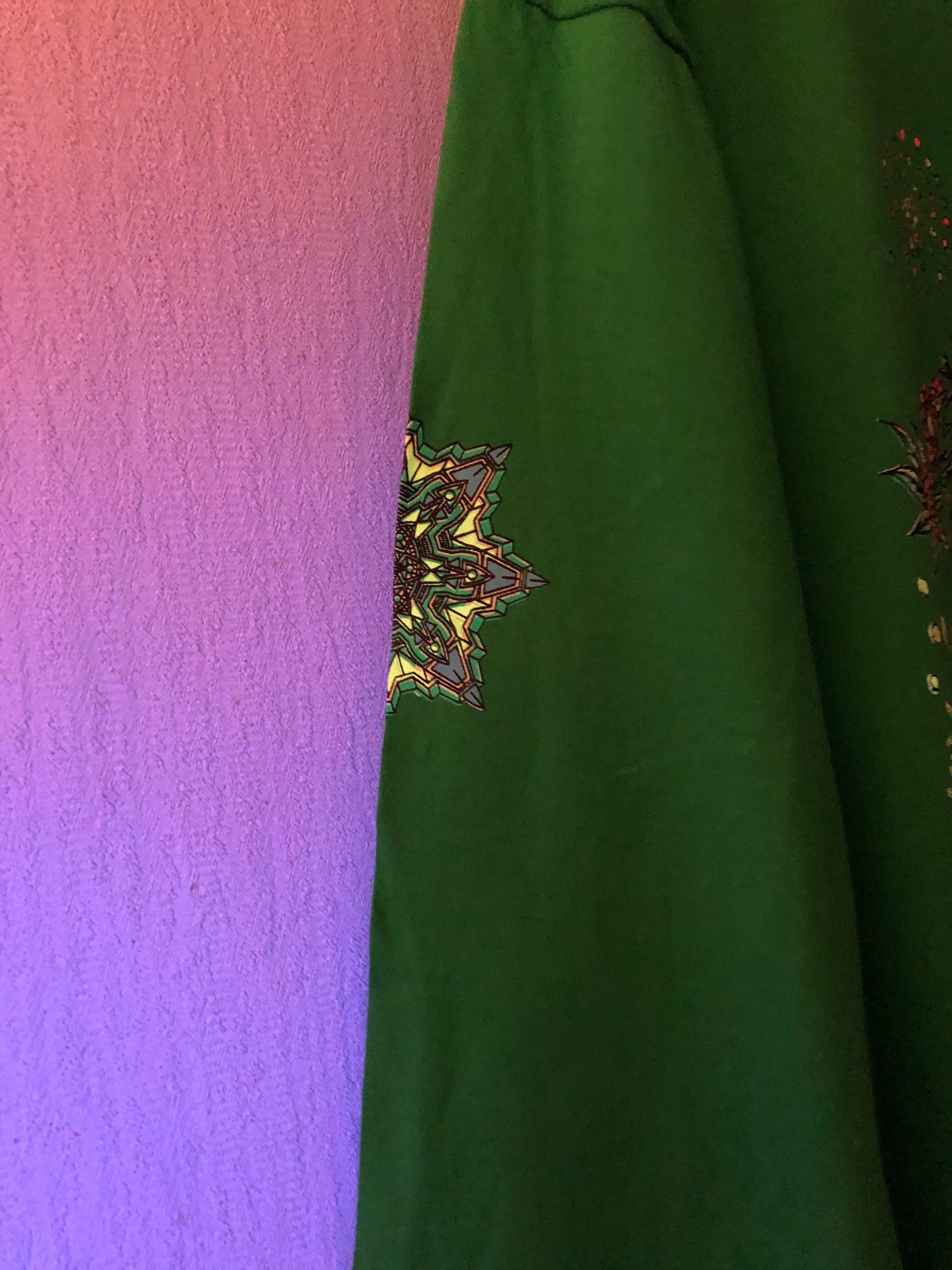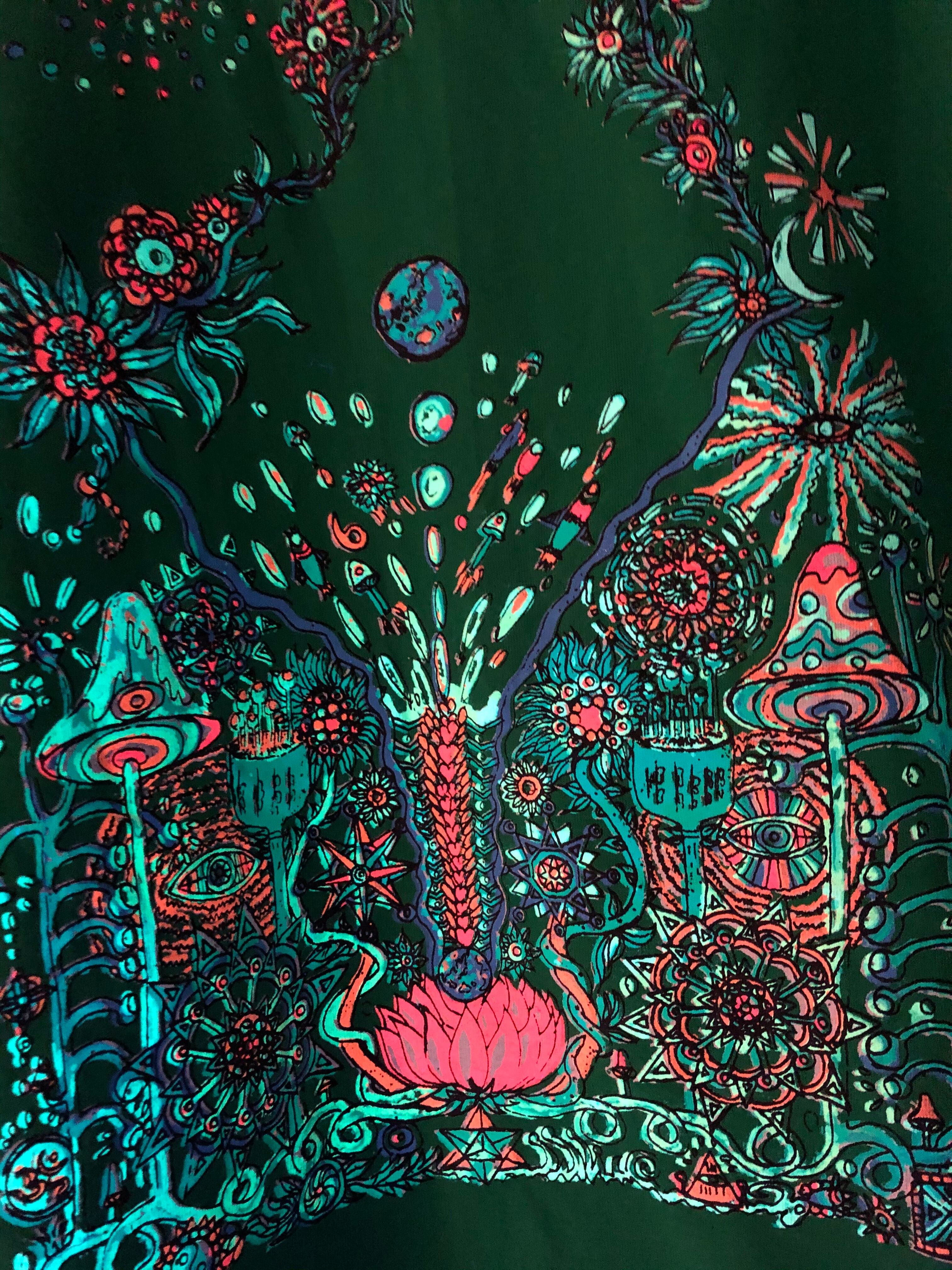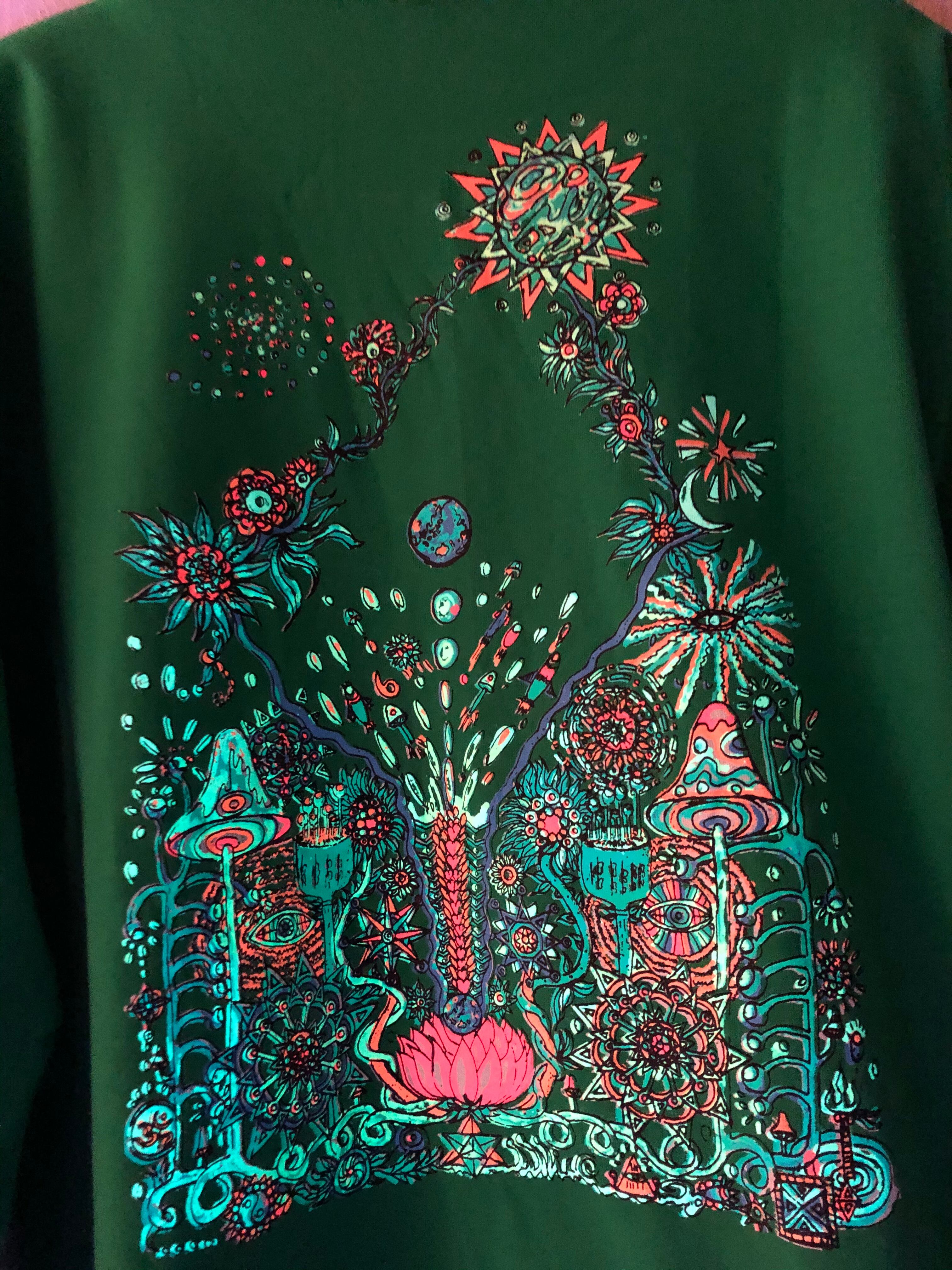 この商品はフラワーシャワーのパワーをもらい本人が描いた絵をシルクスクリーンでプリントしたものです。