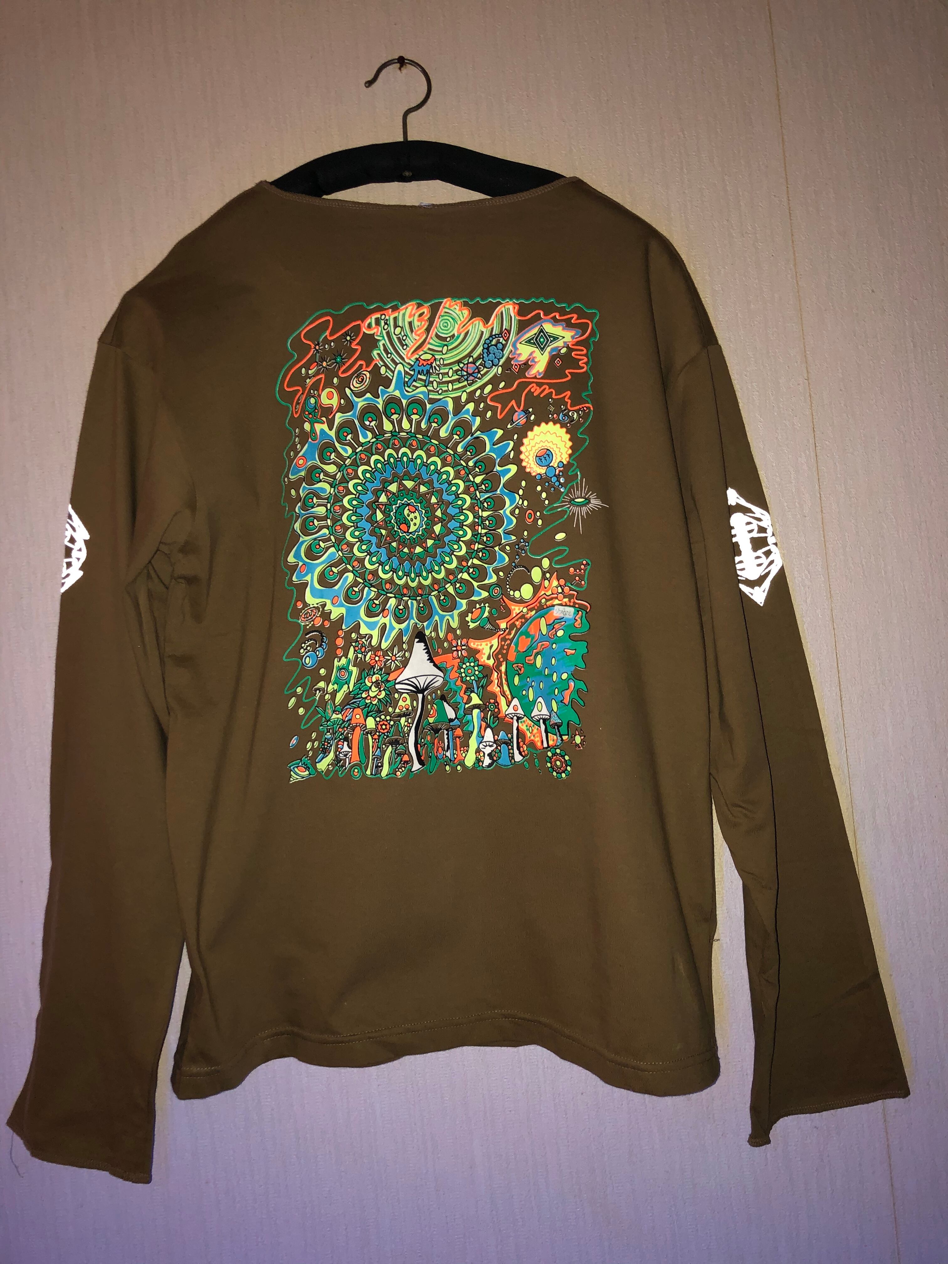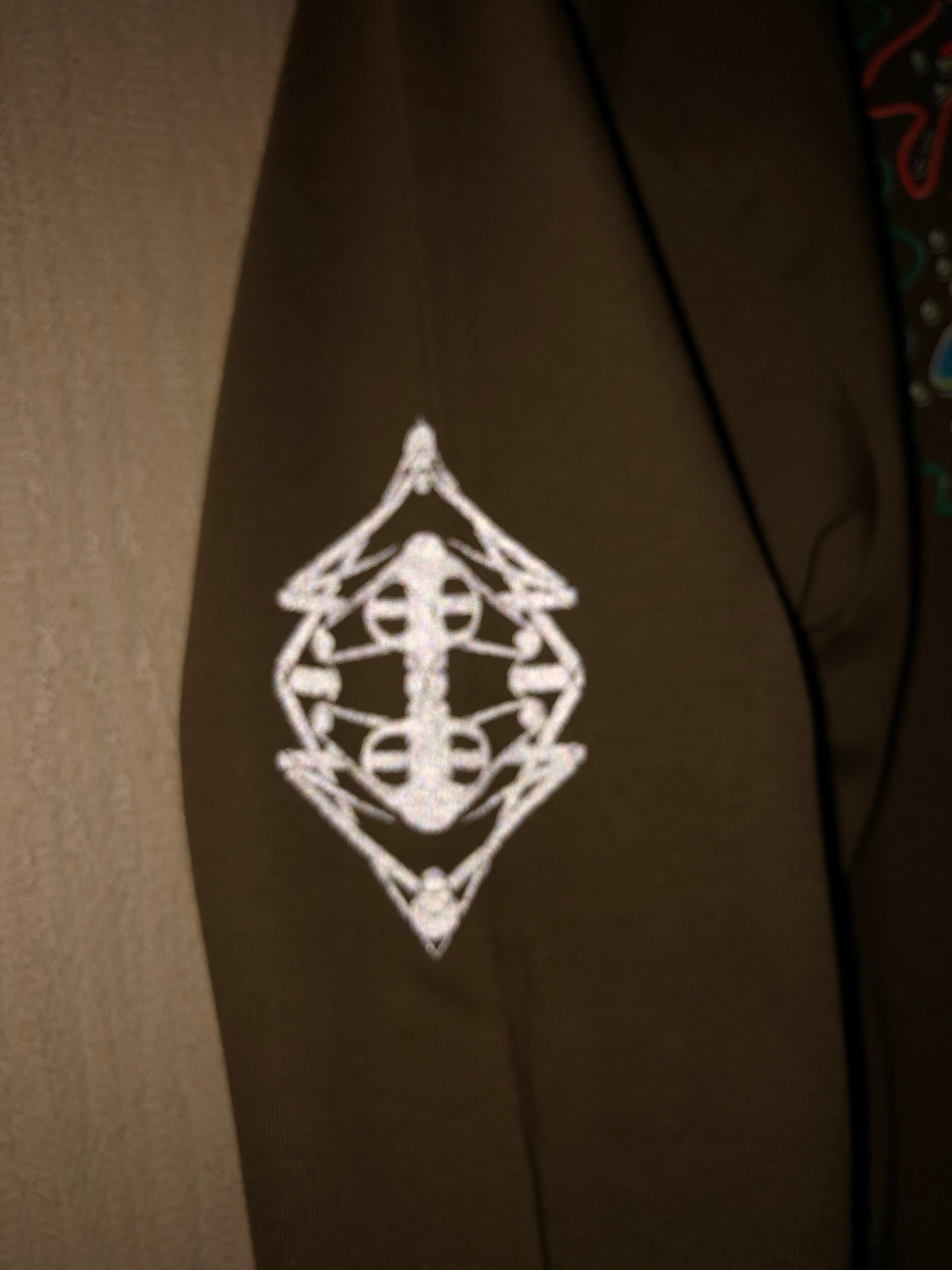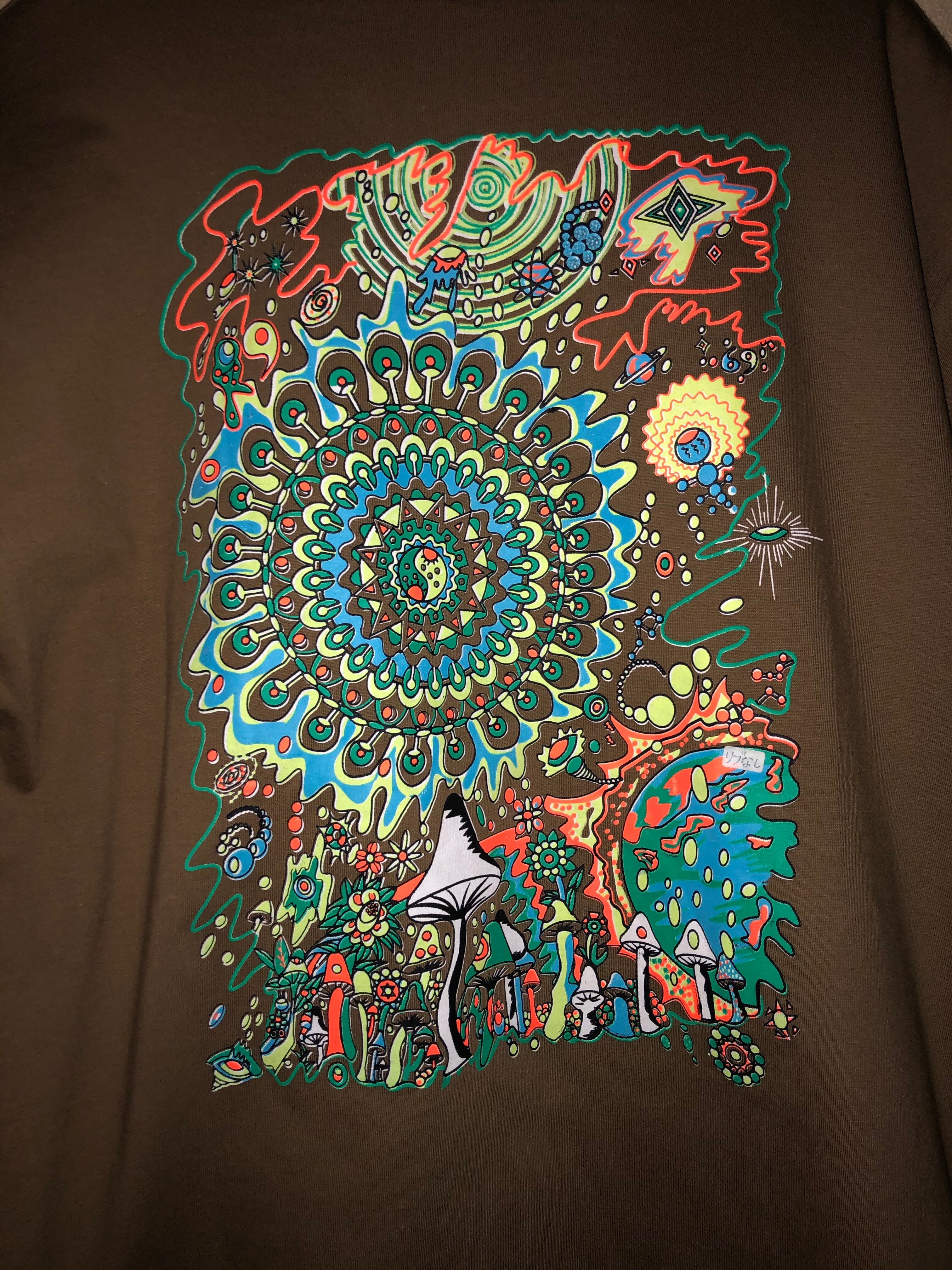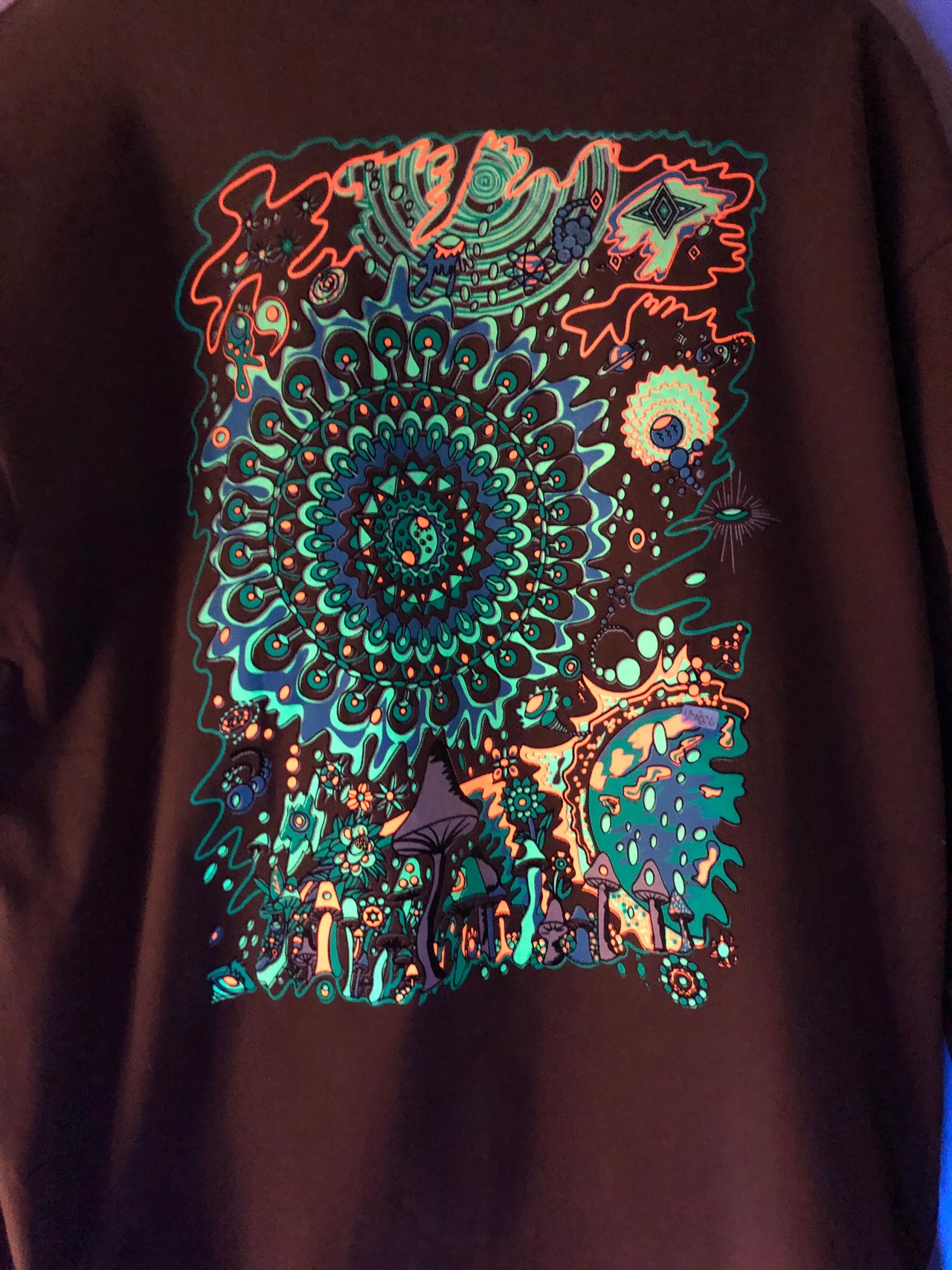 #サイケデリック #パーティー #レイブ #ブラックライト #グルグル #きのこ#キノコ #リフレクタープリント #フルプリント #ブラウンTシャツ