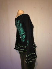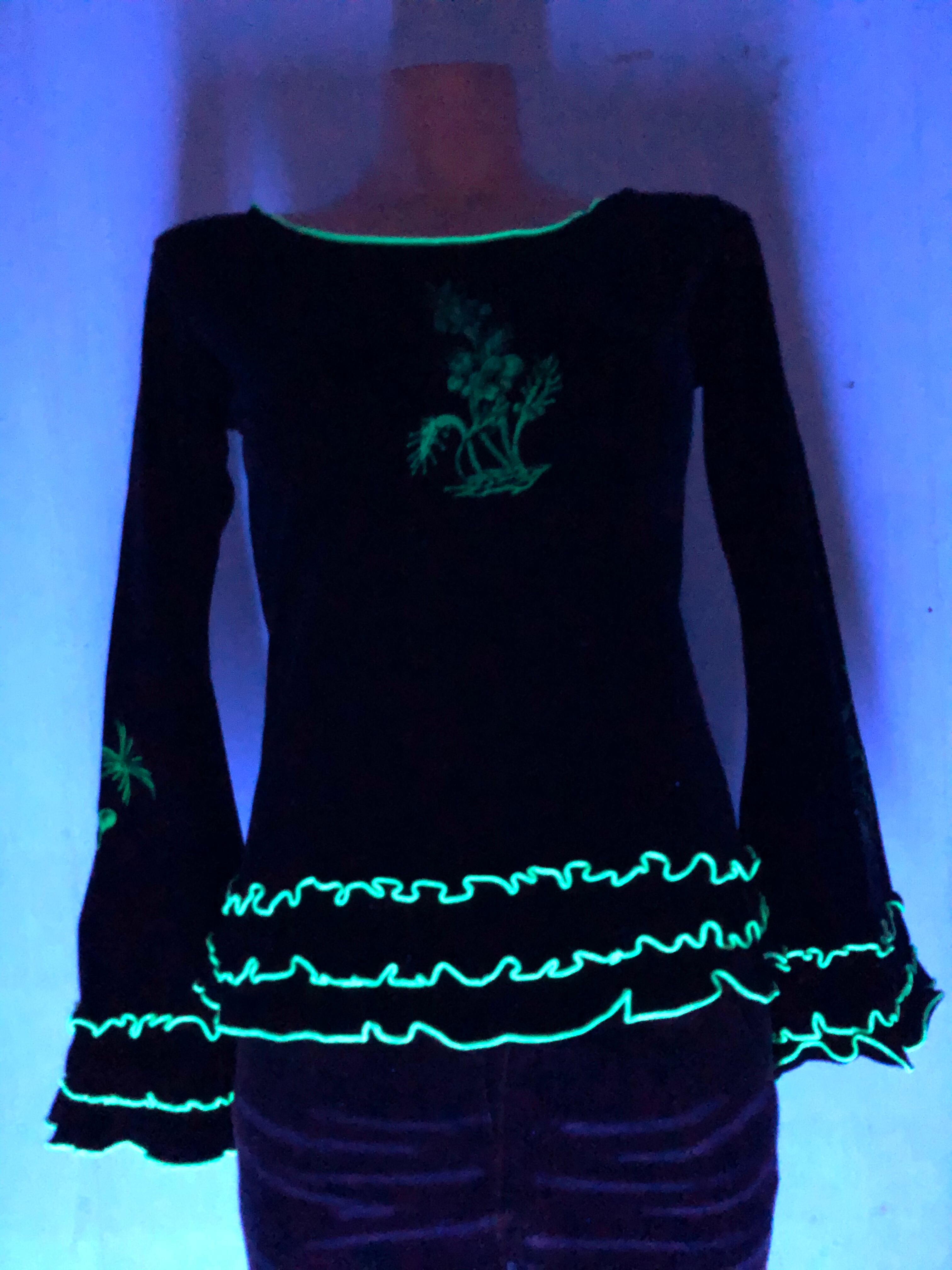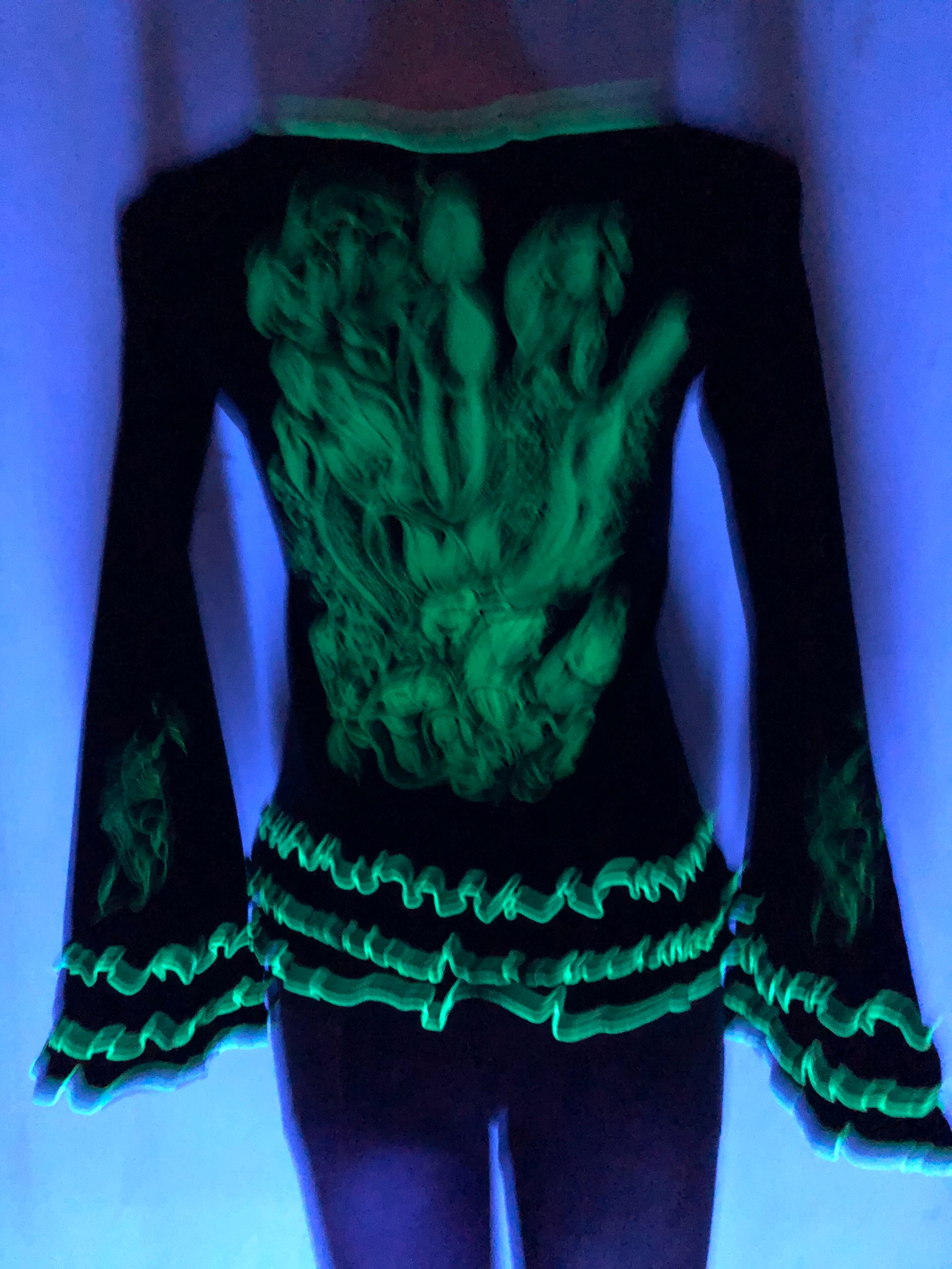 首元や袖、裾にグリーンのネッチが施されていてブラックライトで光ります。