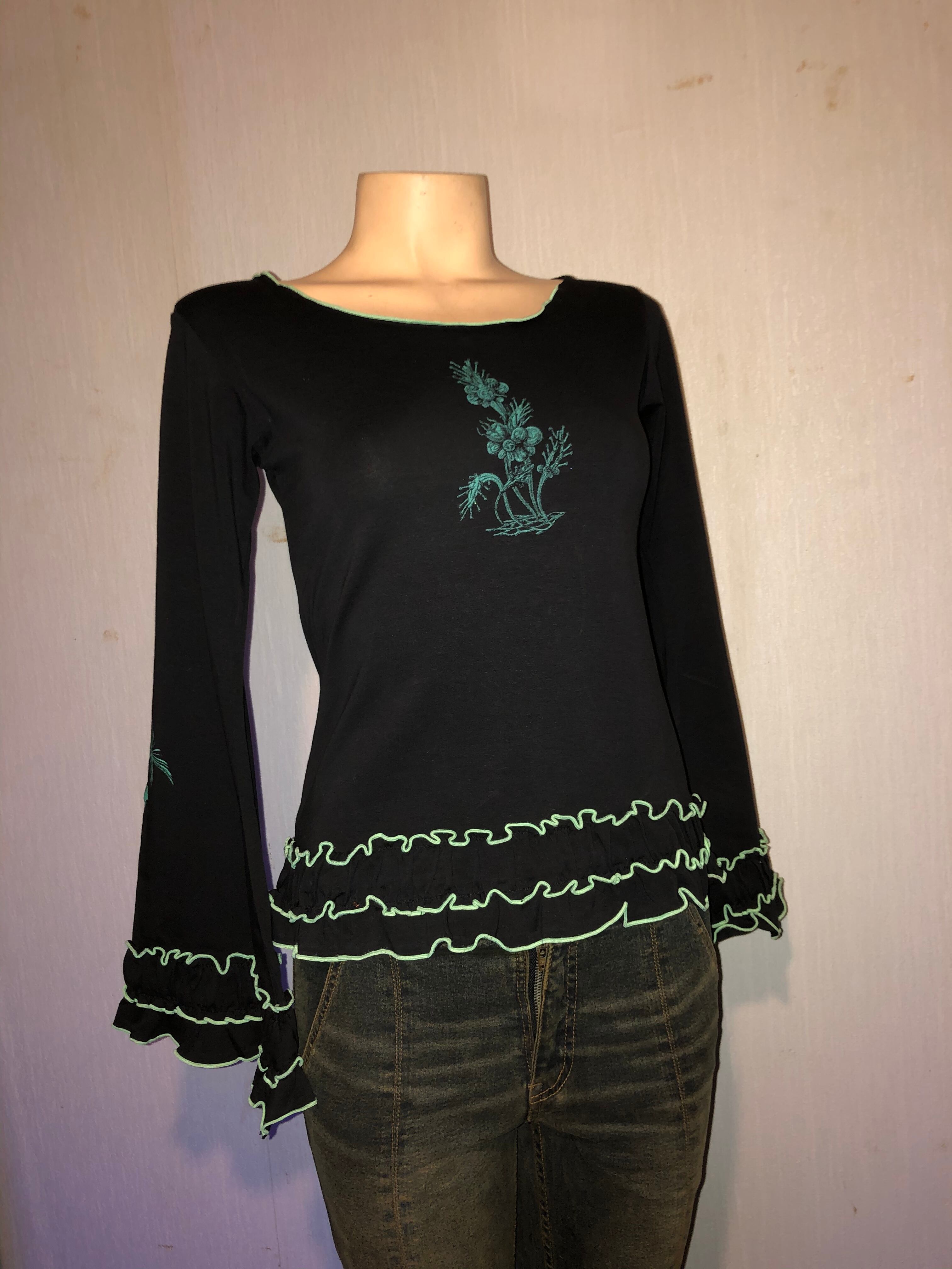 このロングスリブTシャツはブラック生地にグリーンのプリントが入っています。