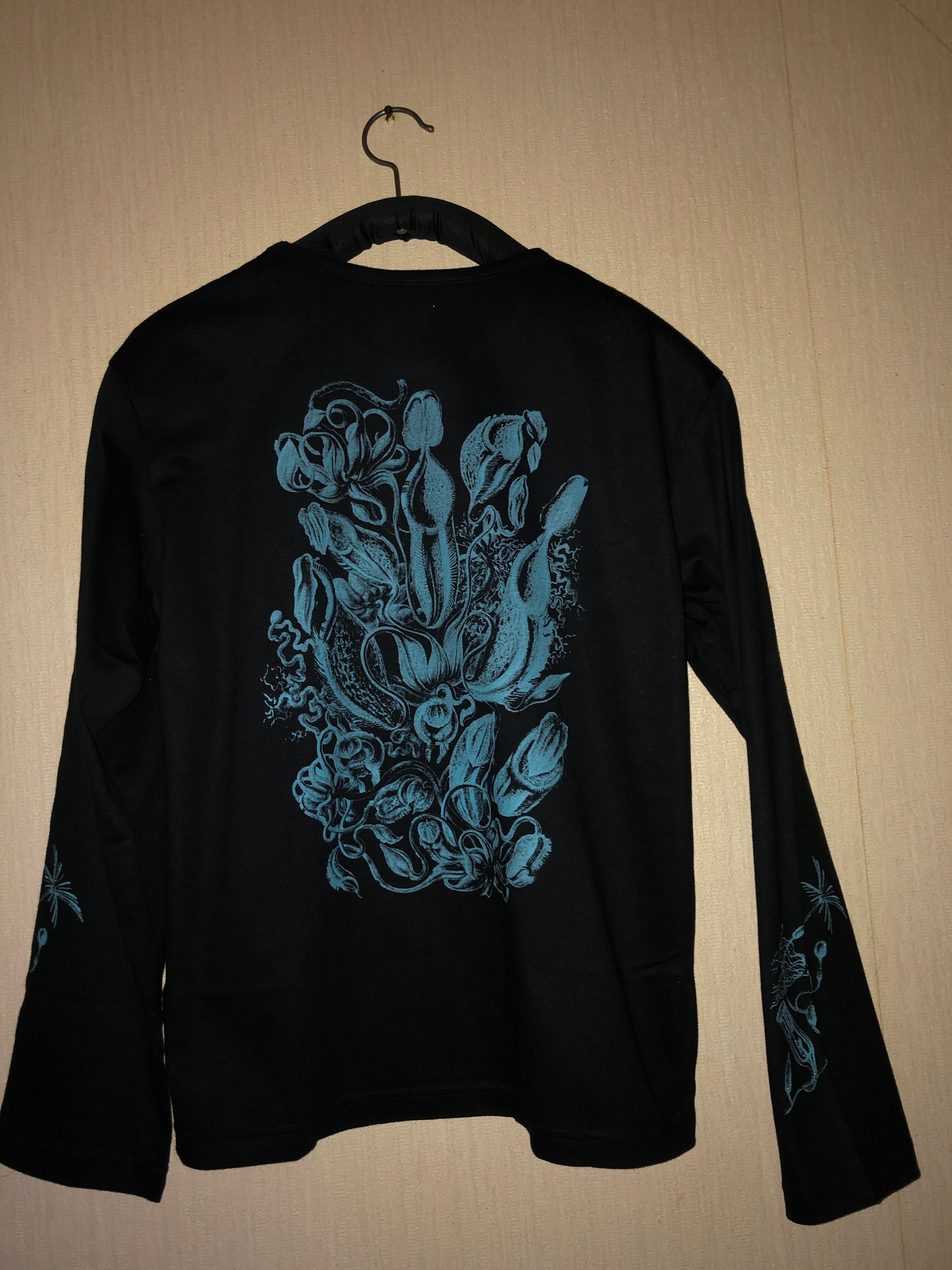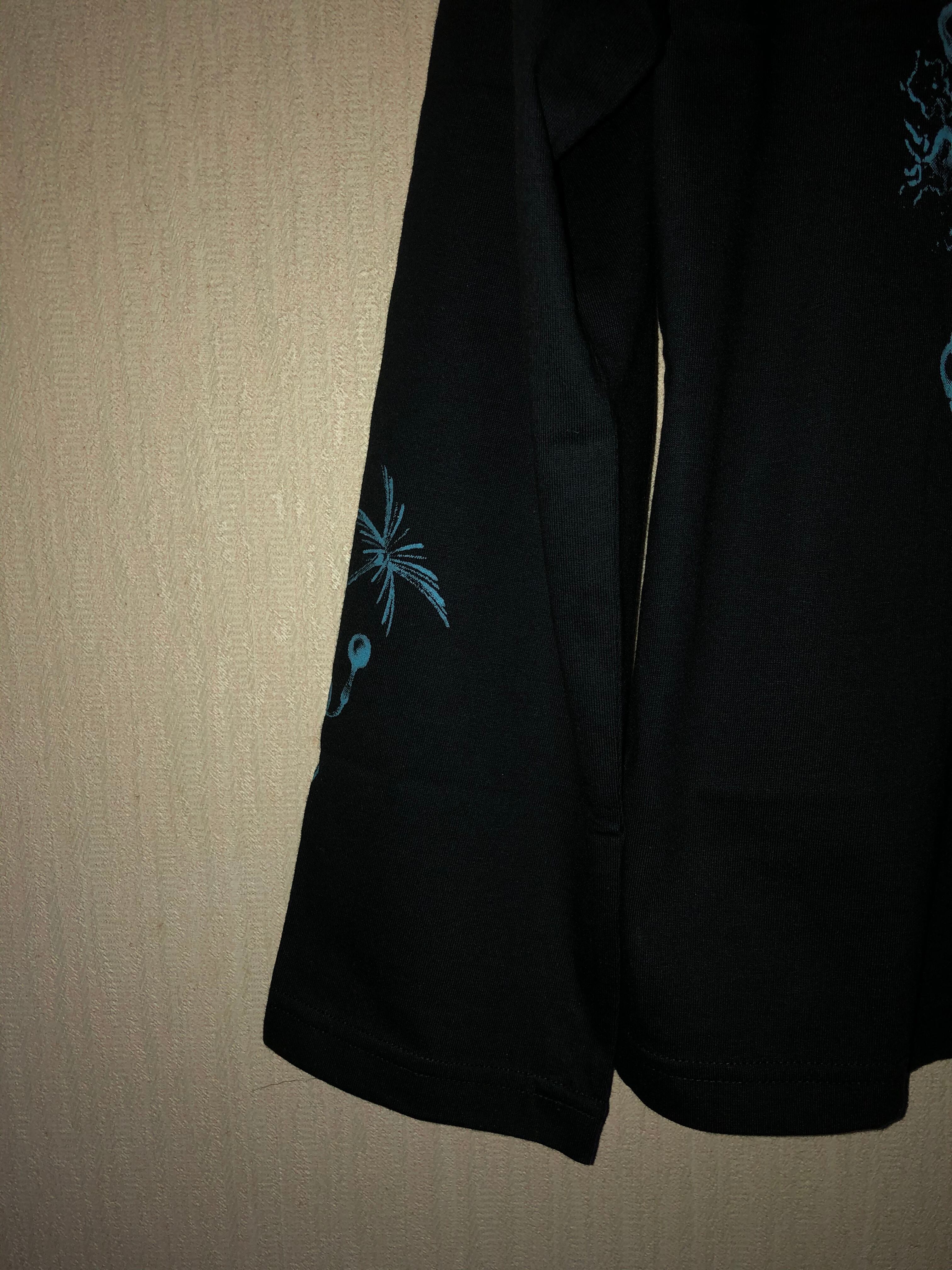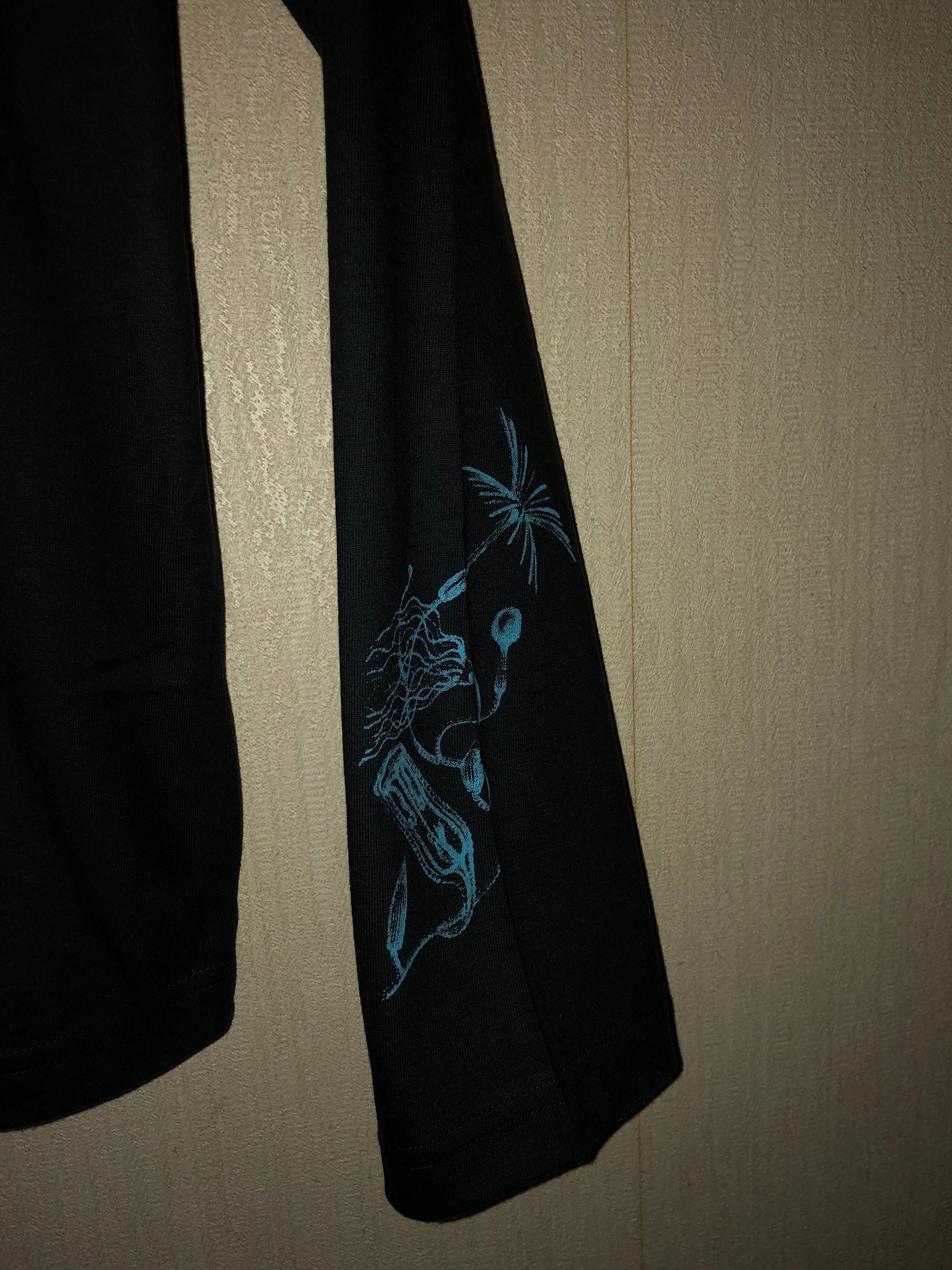 このロングスリブTシャツはブラック生地にブルーのプリントが入った商品です。