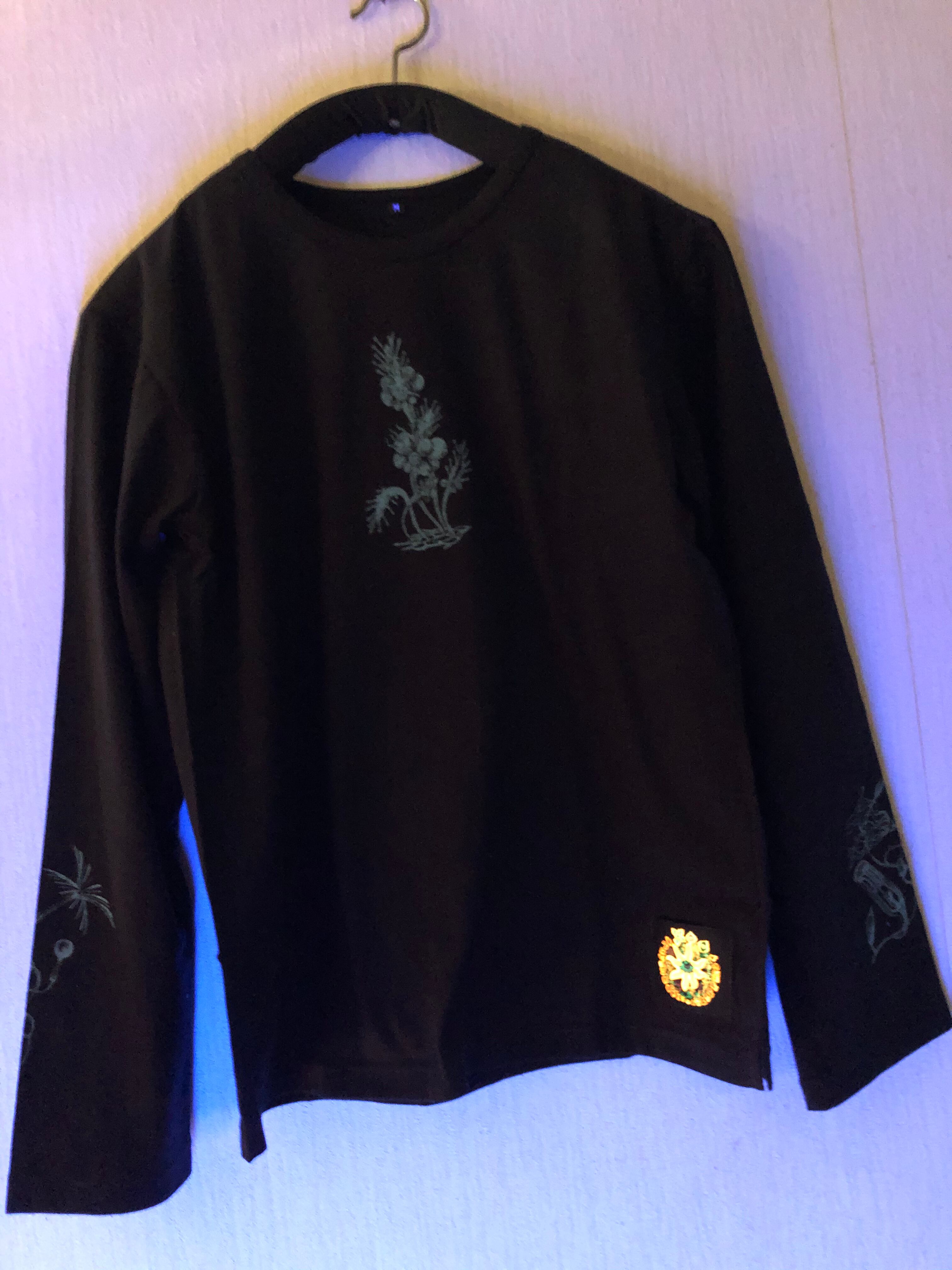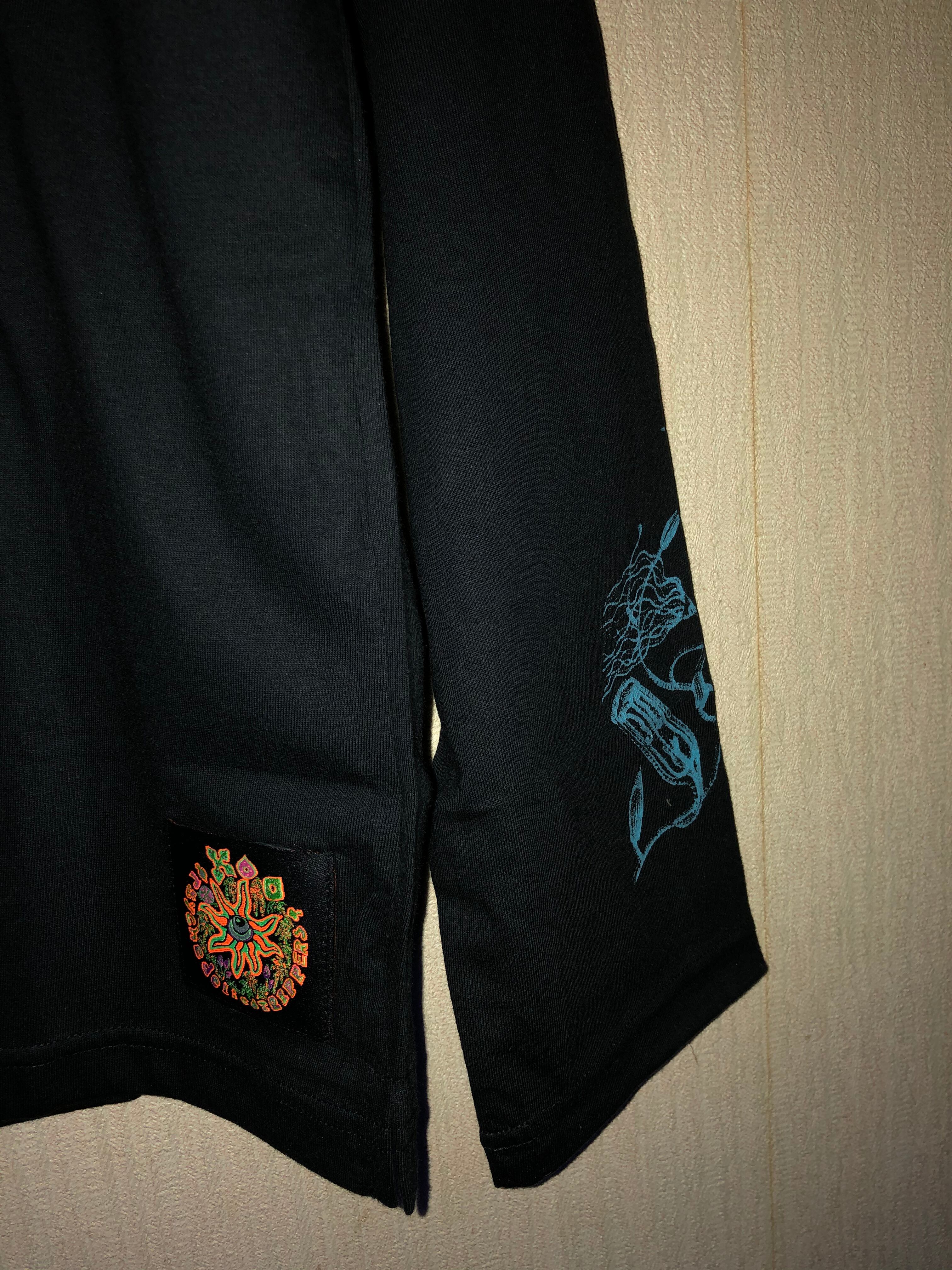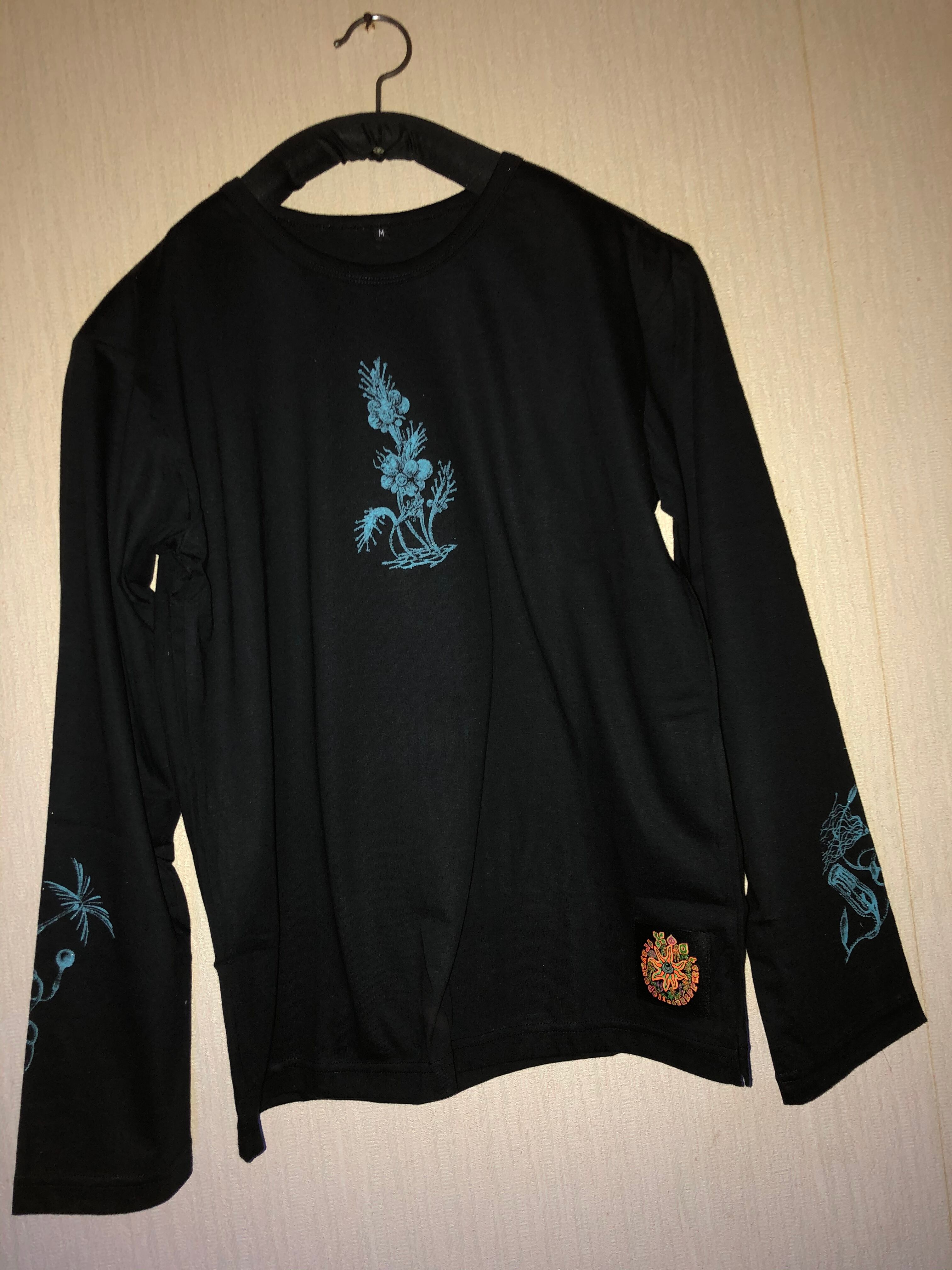 このロングスリブTシャツはブラック生地にブルーのプリントが入った商品です。