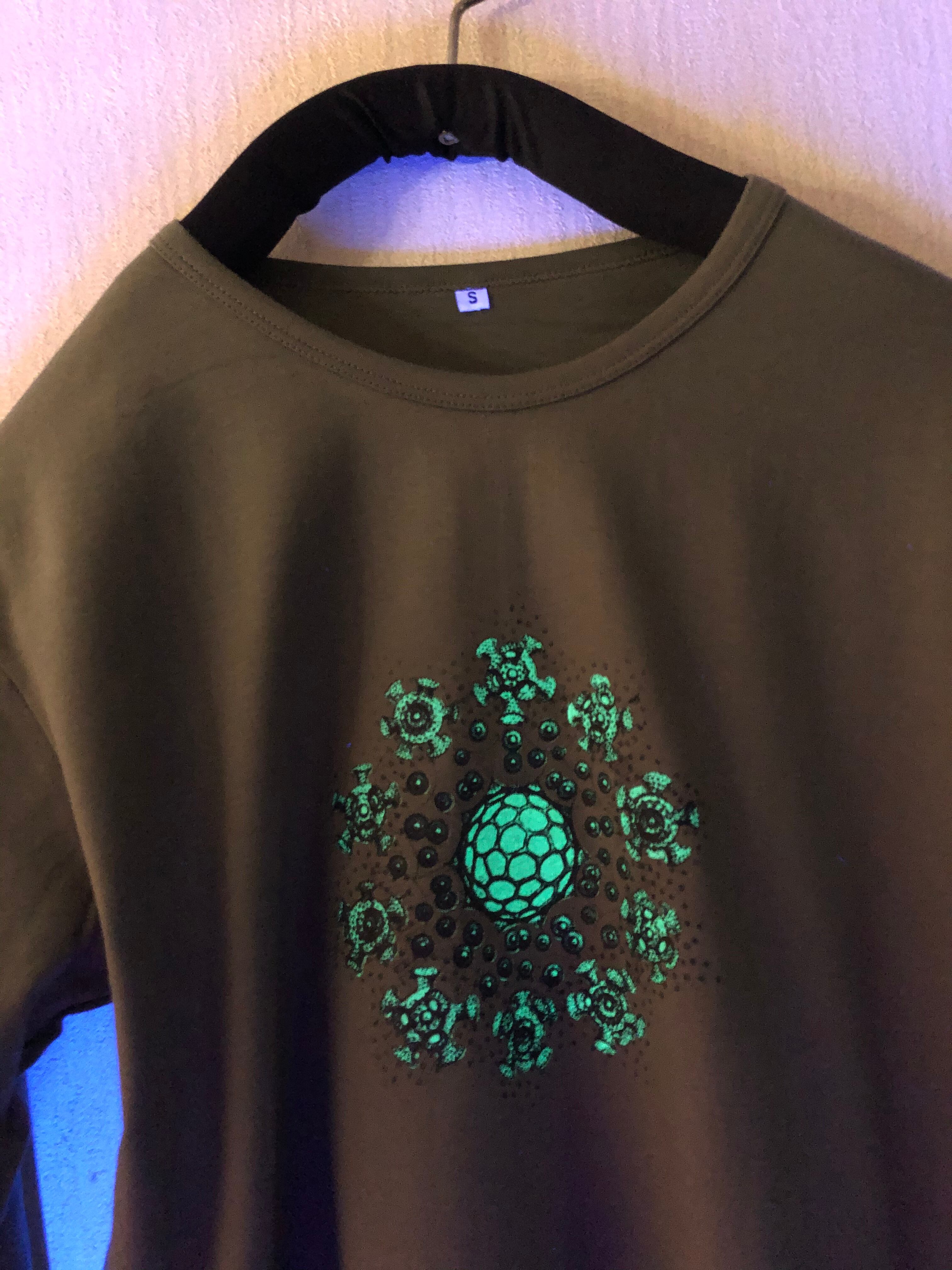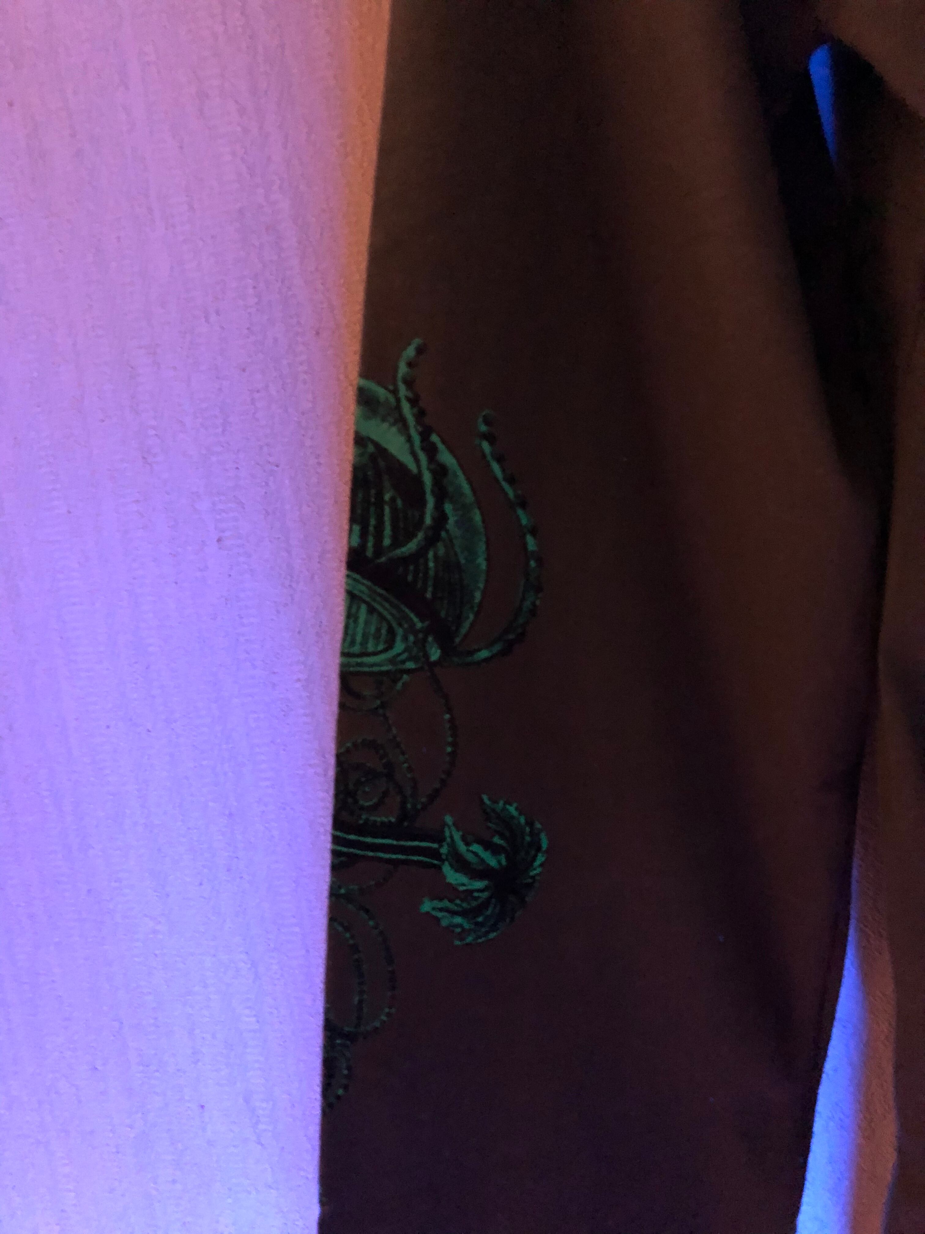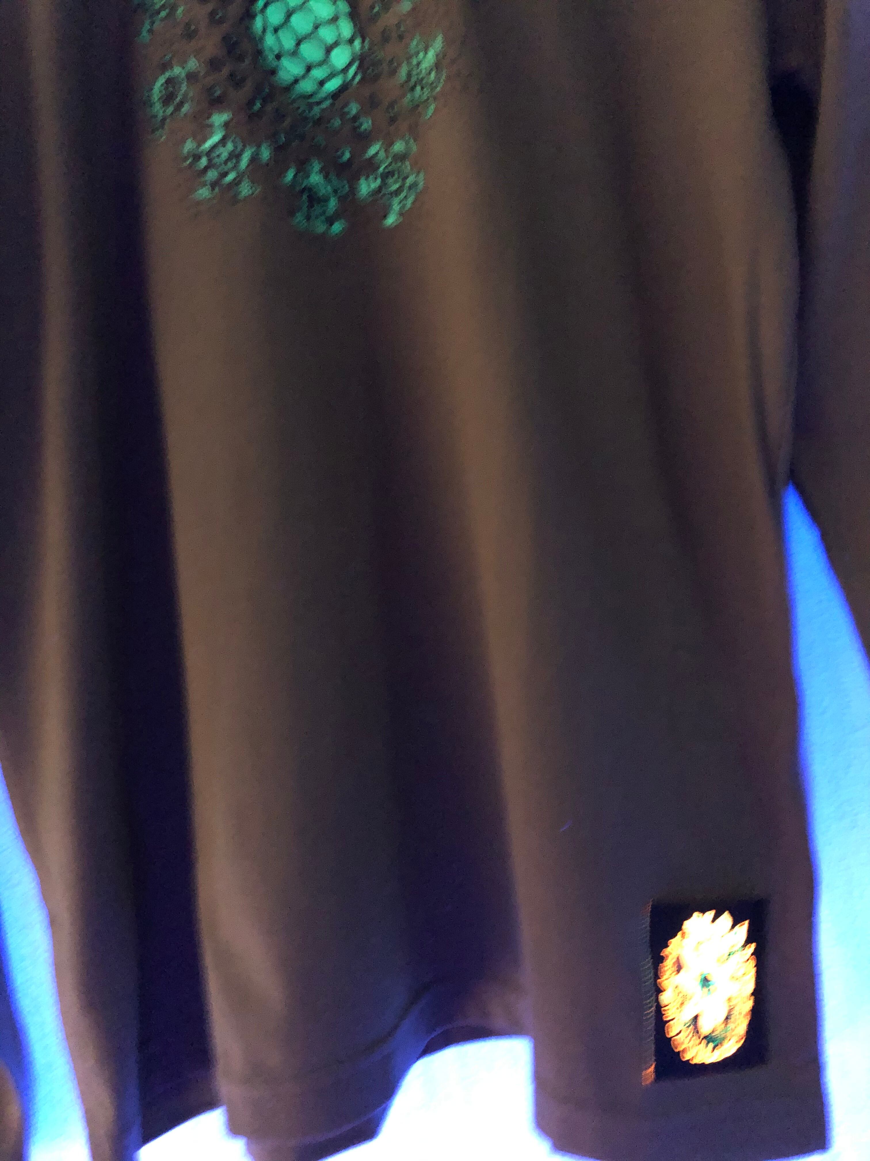 生地はカーキでプリントがグリーンでブラックライトで光ります。