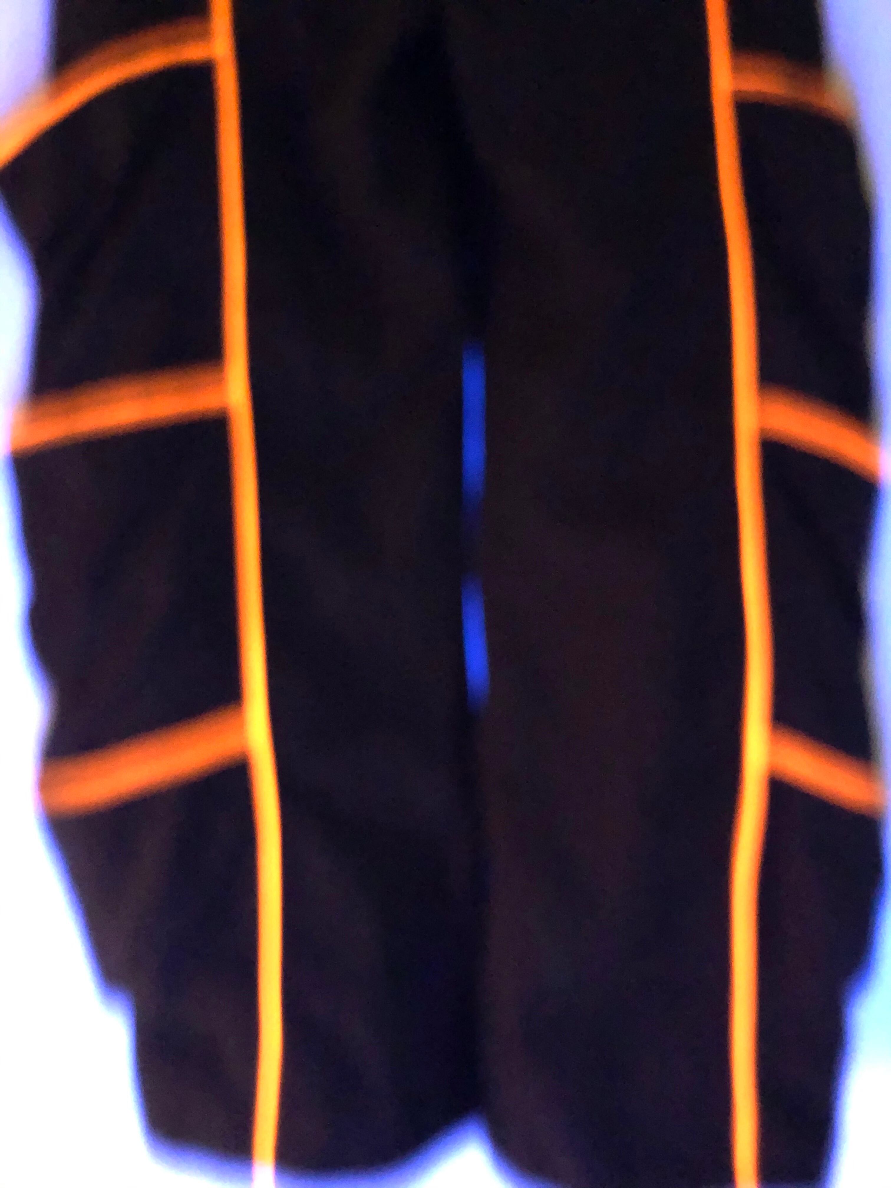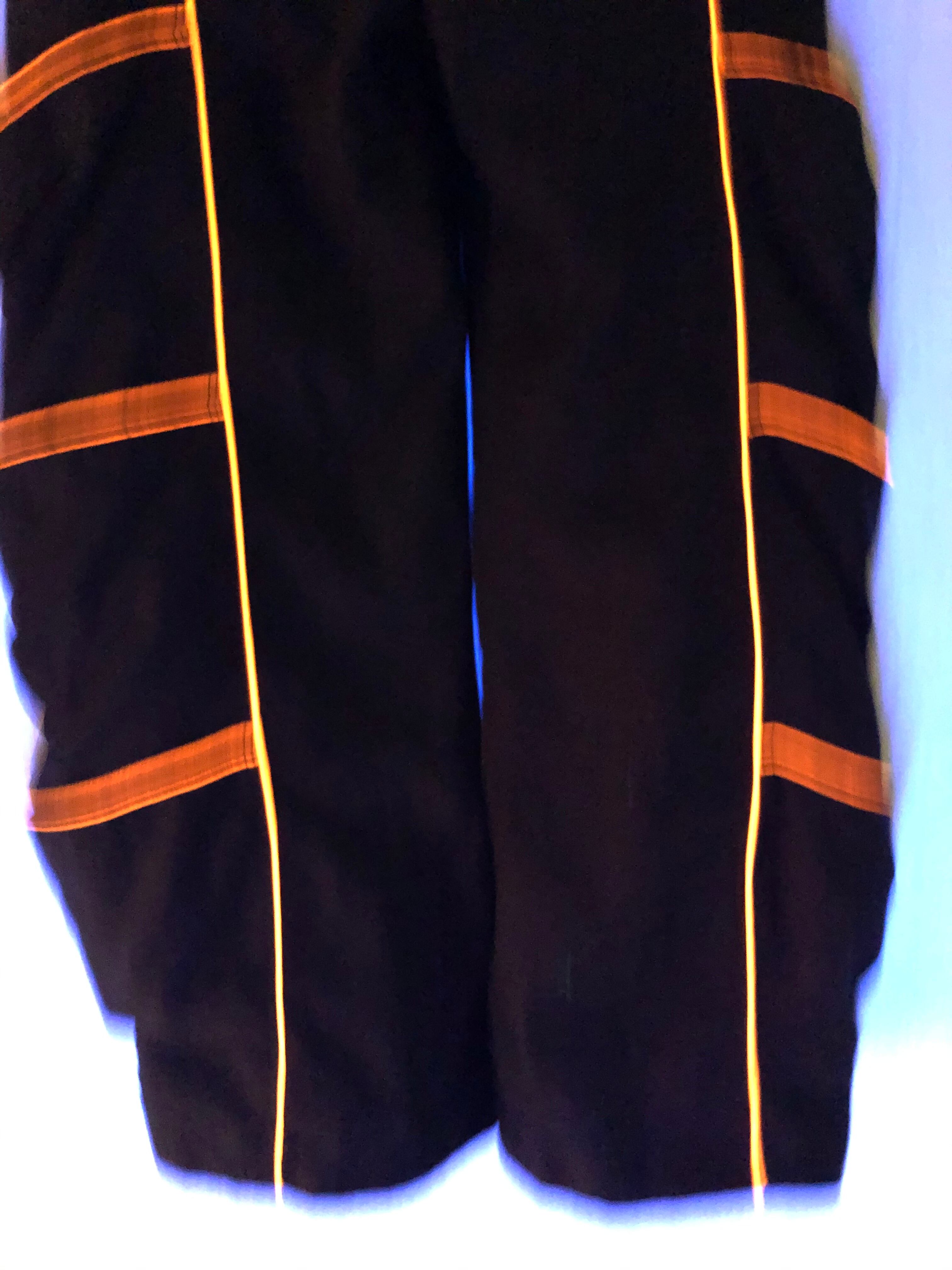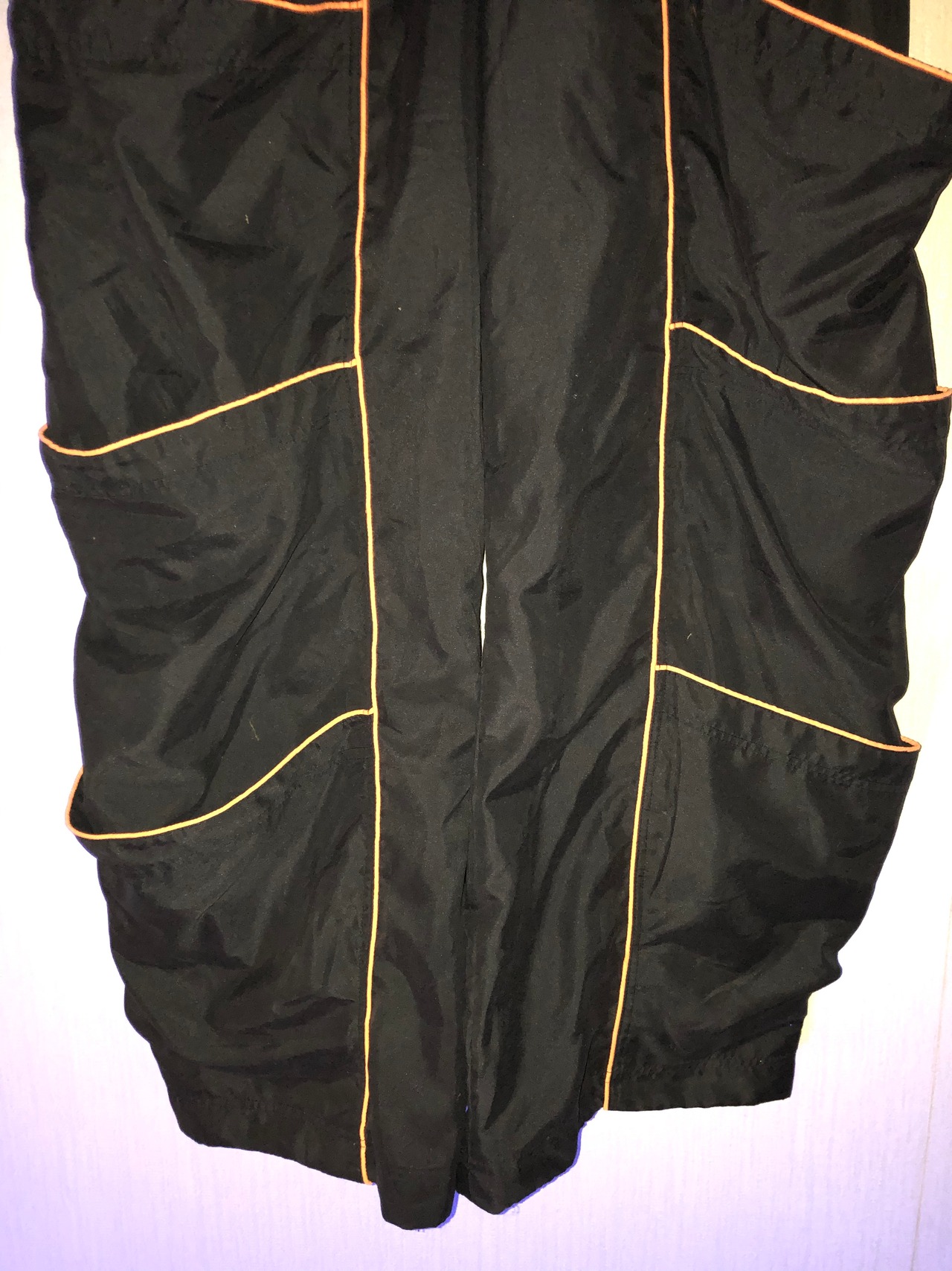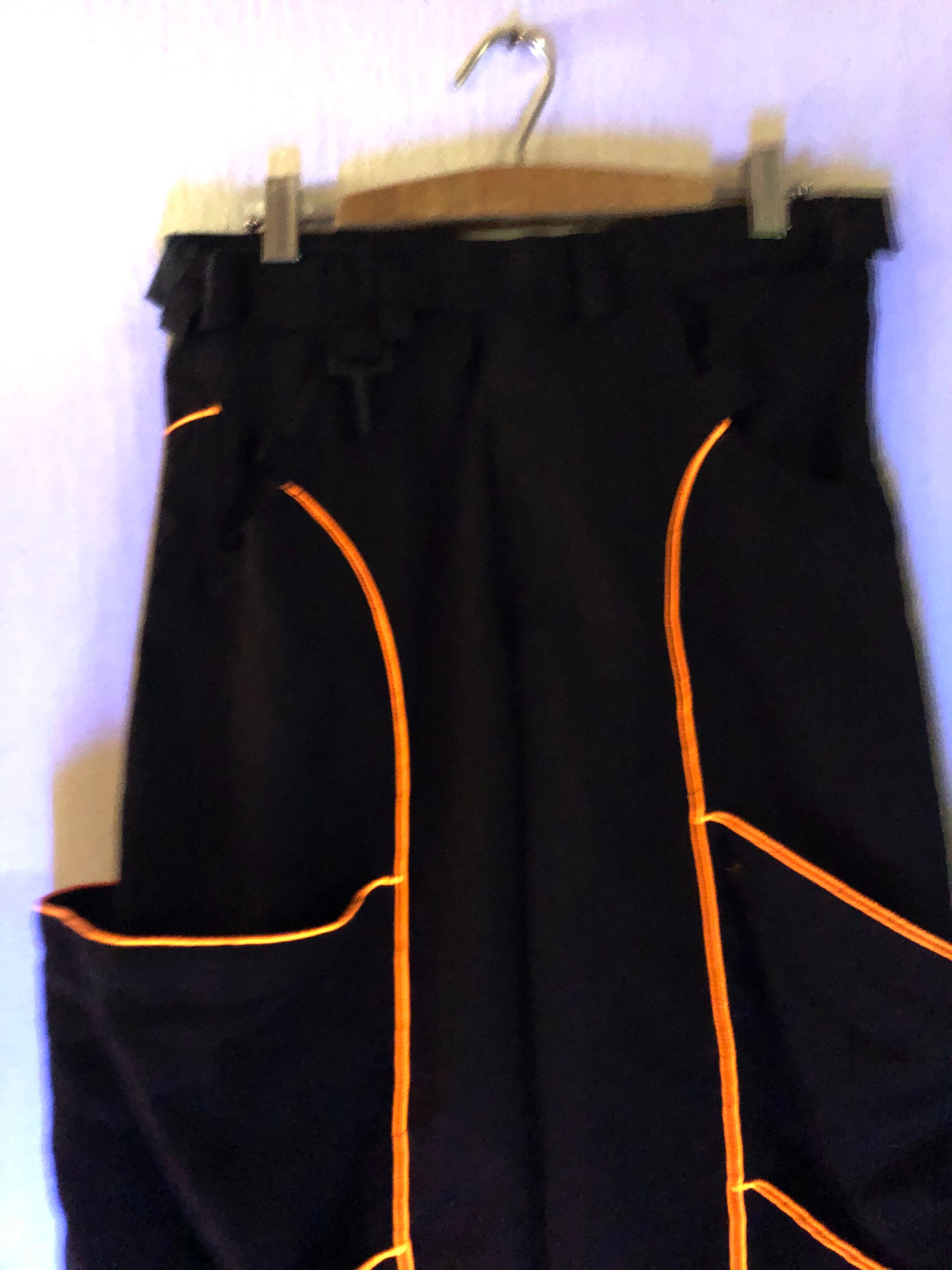 このスペーストライブのパンツはブラック生地でオレンジのラインがポケットの縁に付いています。
