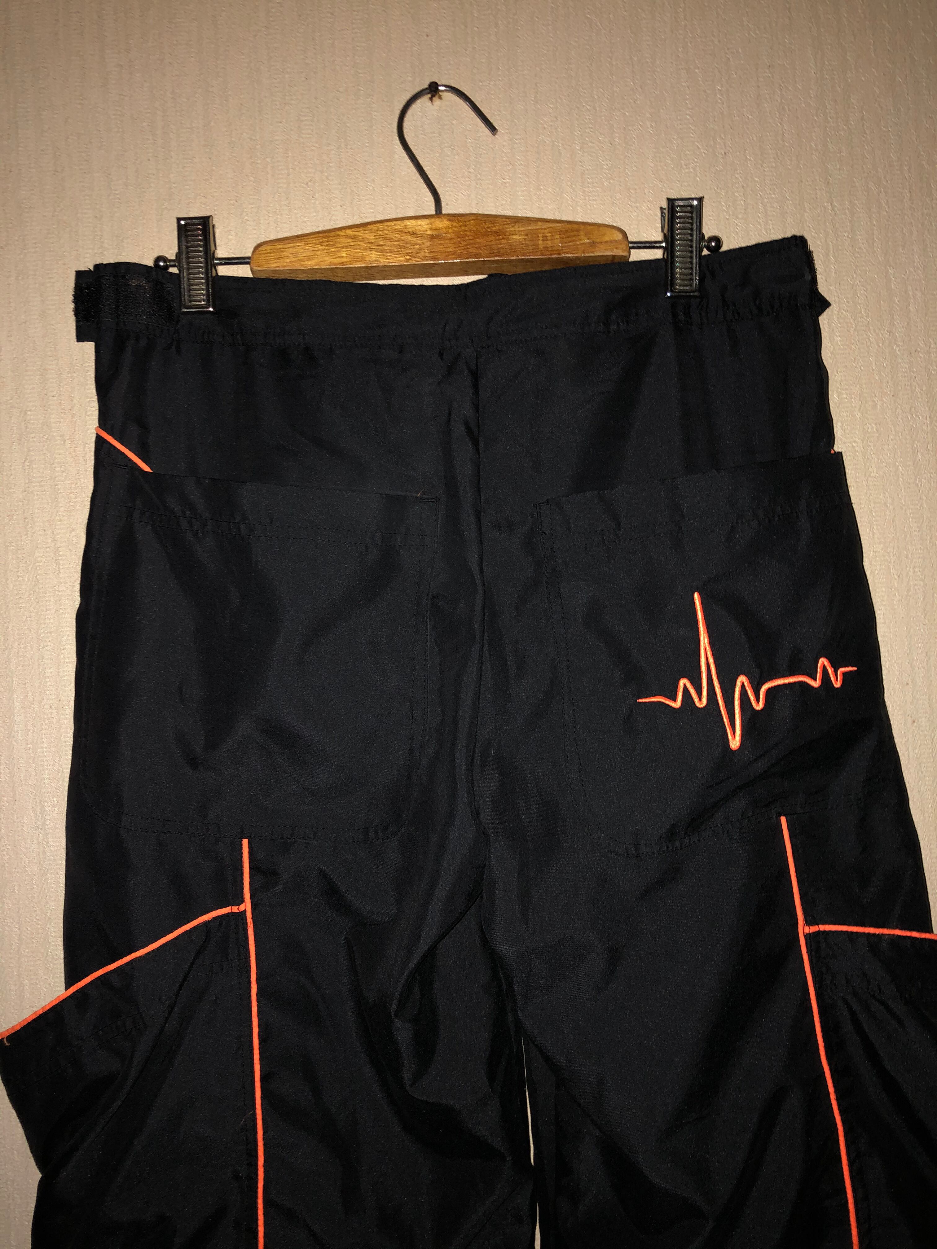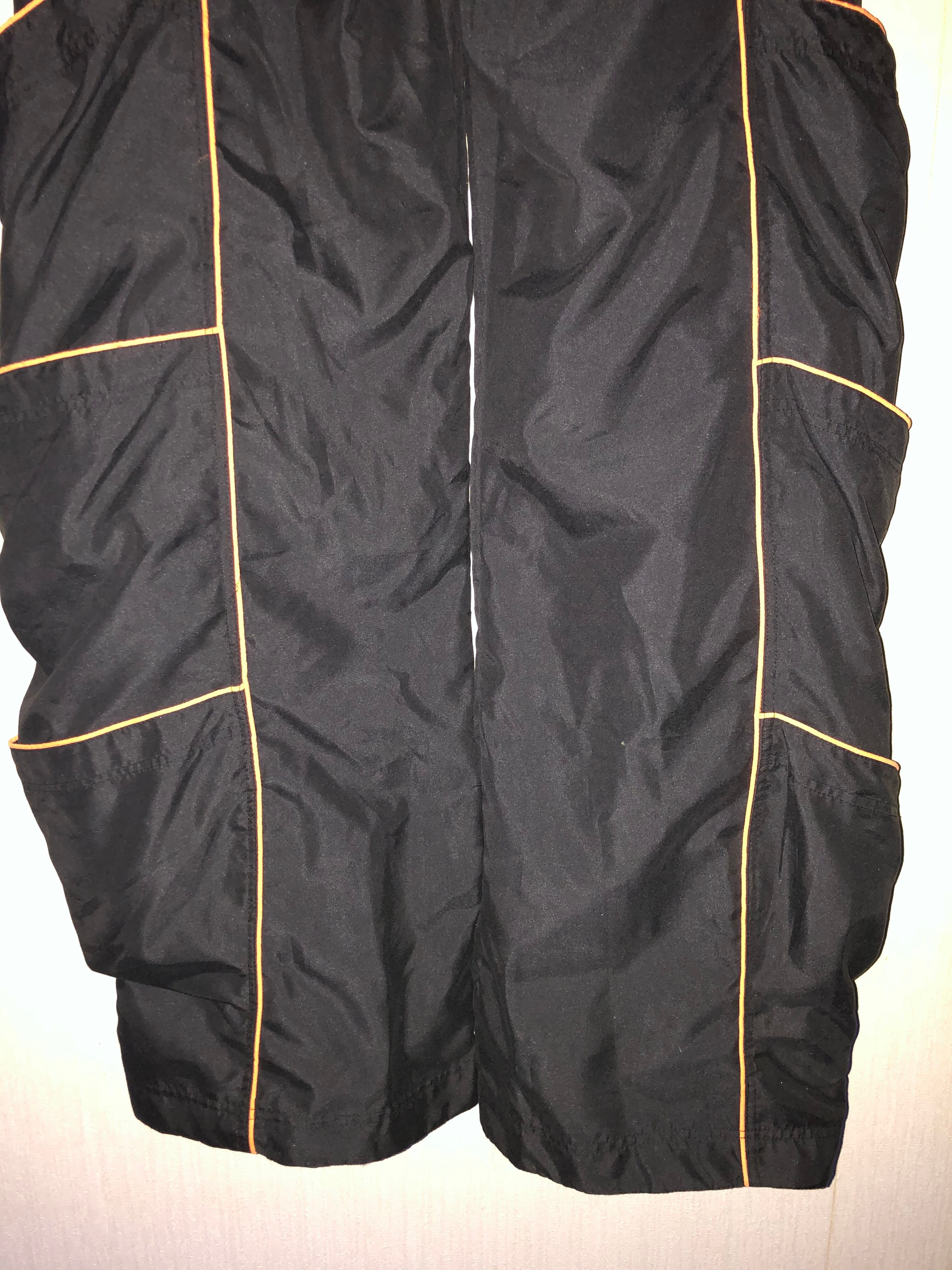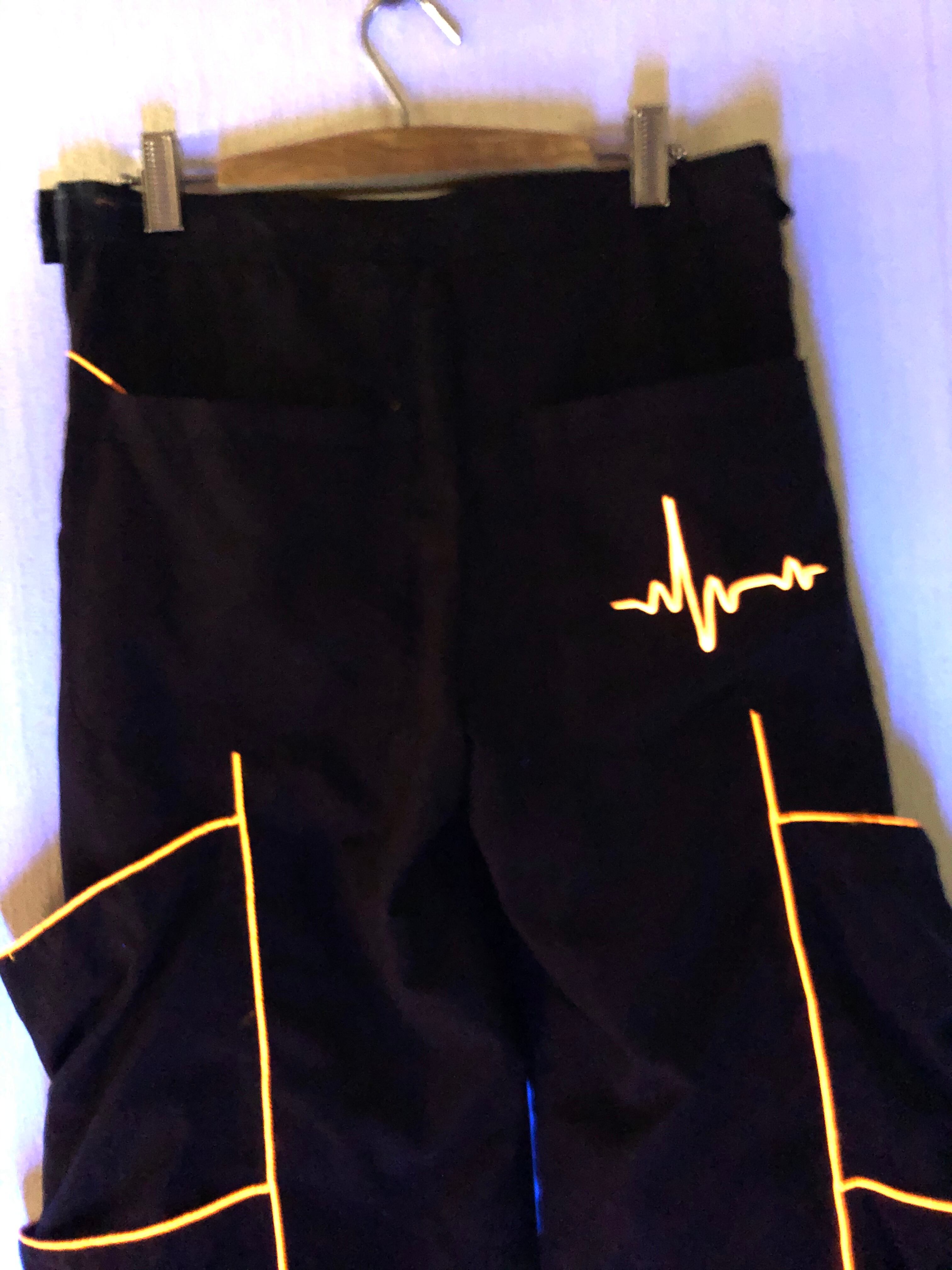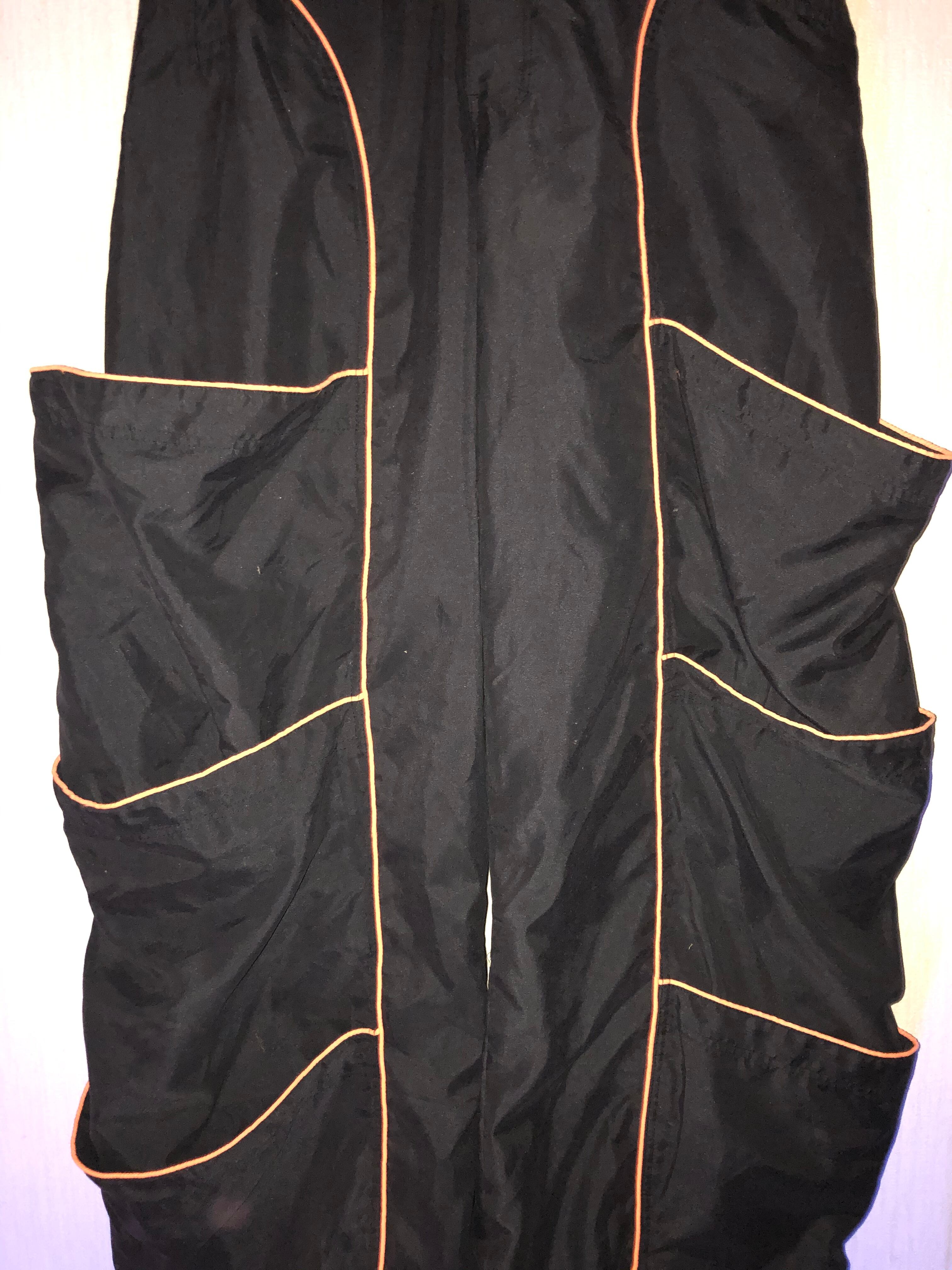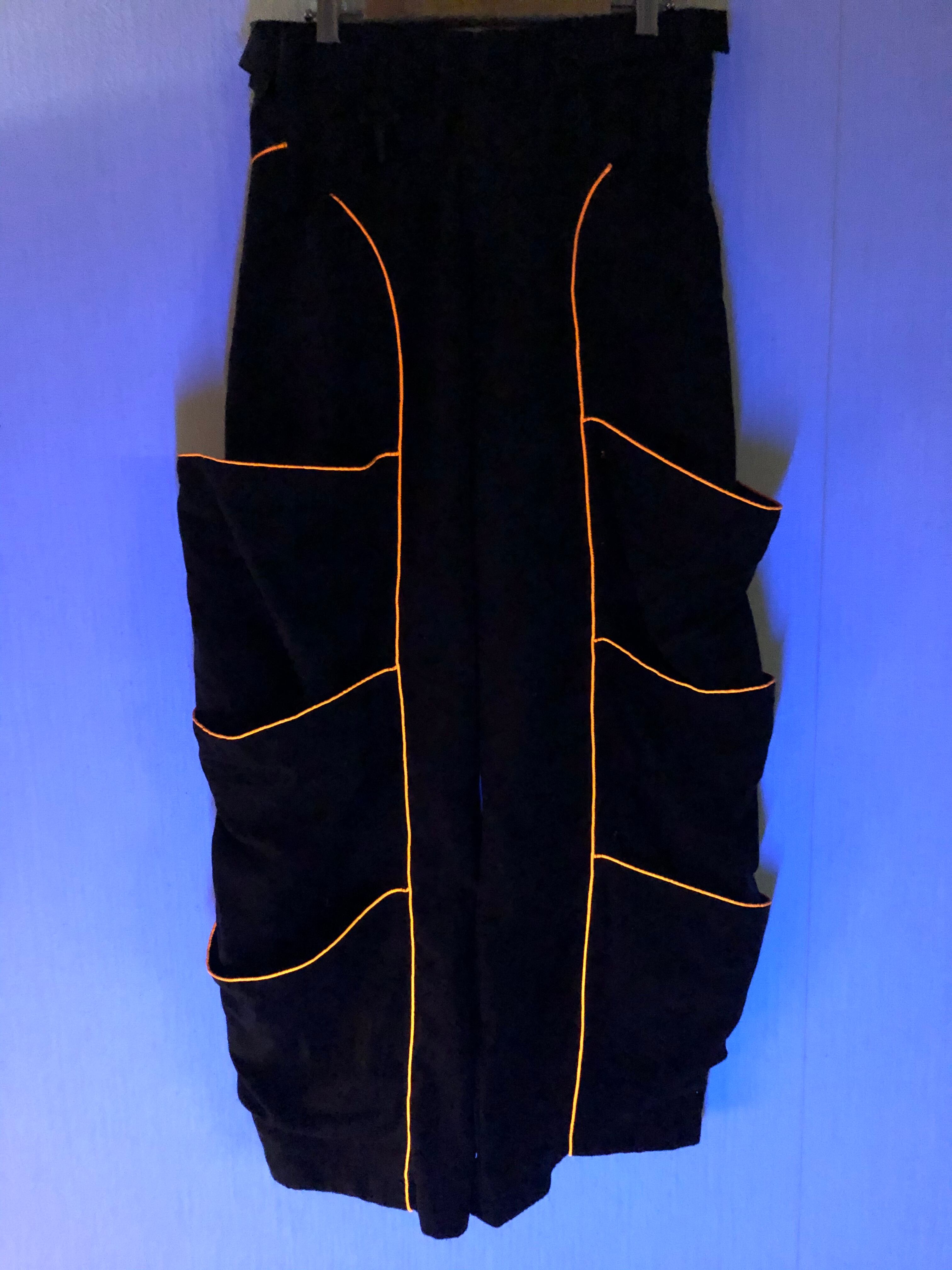 このスペーストライブのパンツはブラック生地でオレンジのラインがポケットの縁に付いています。