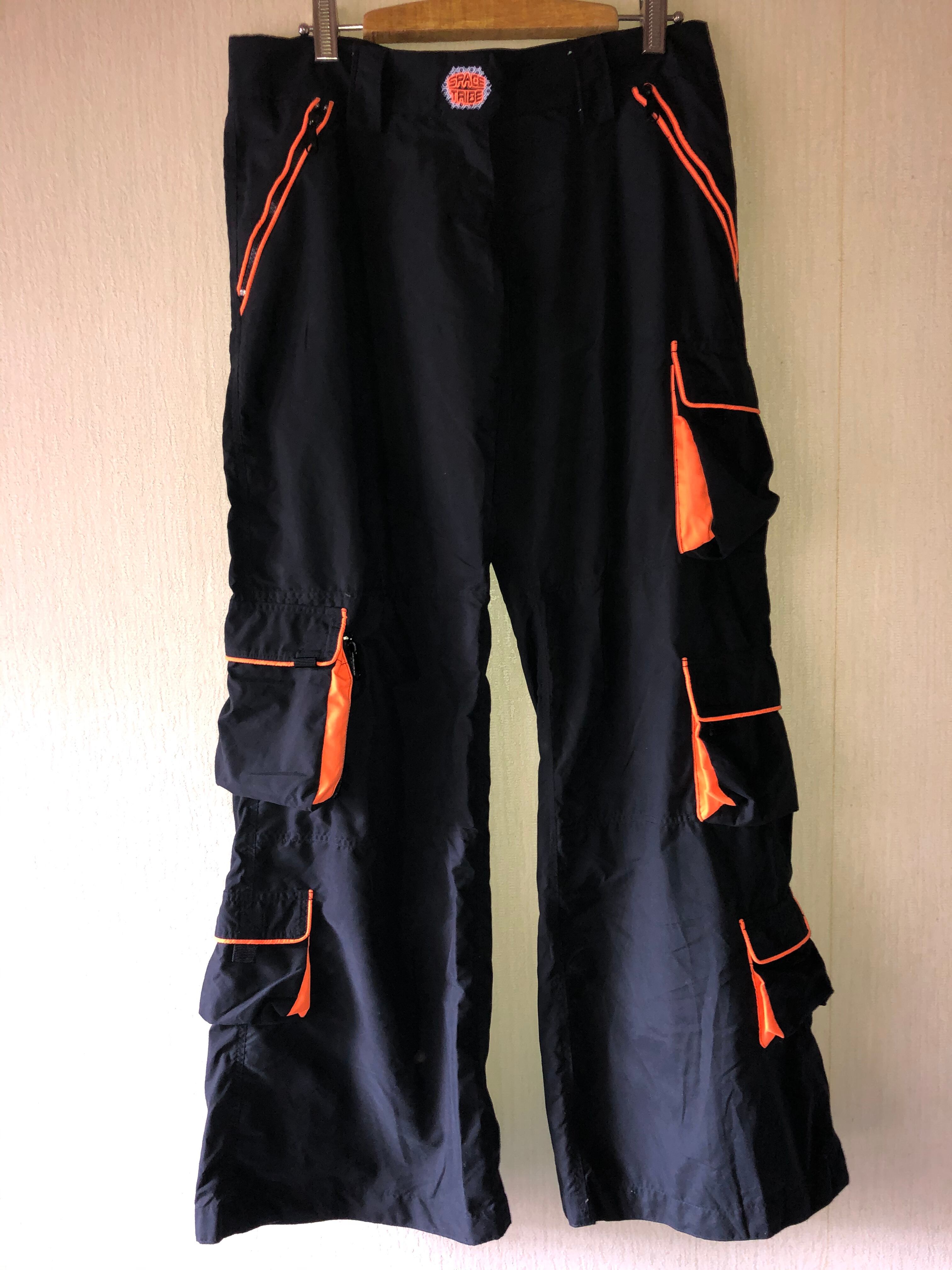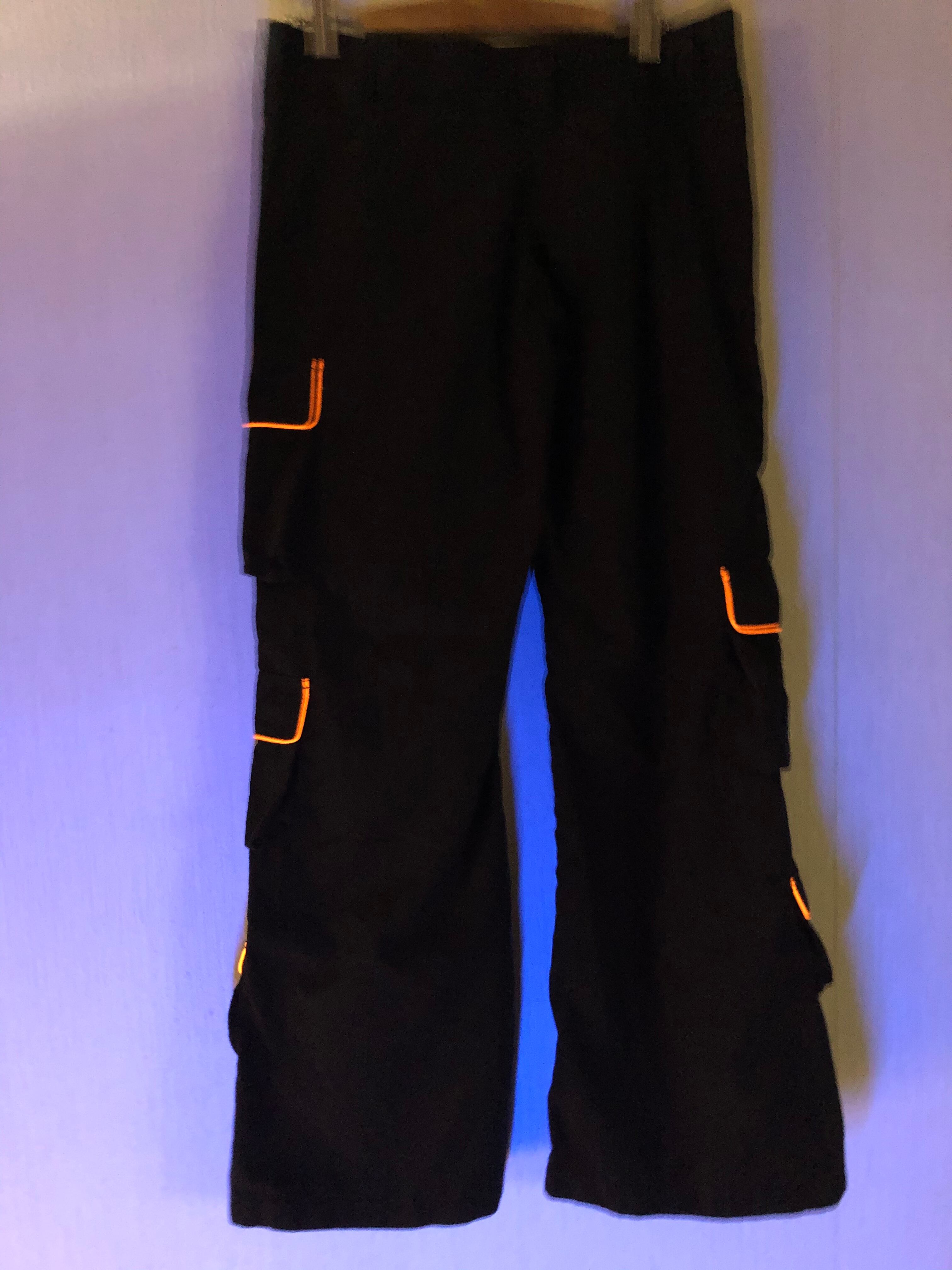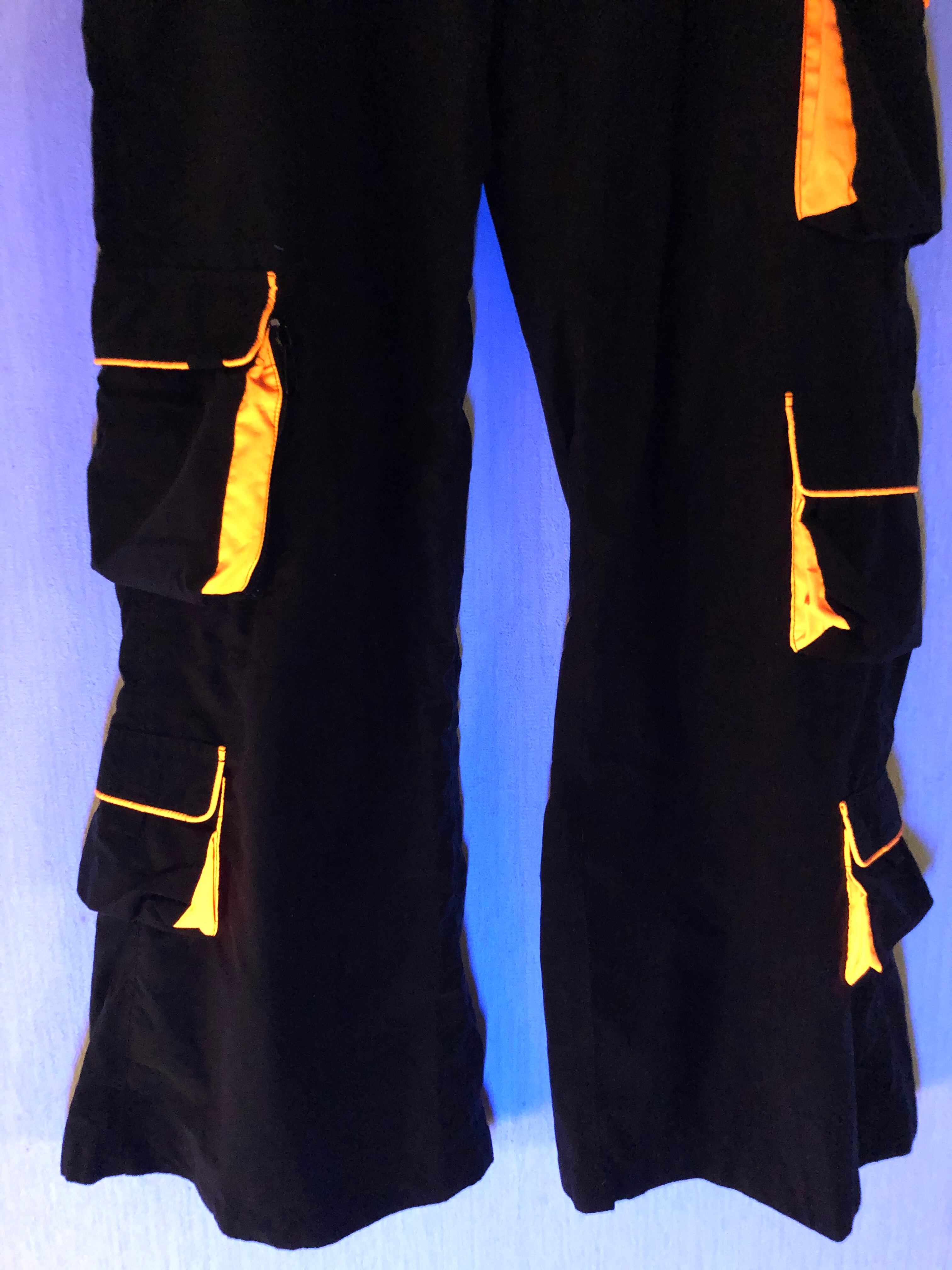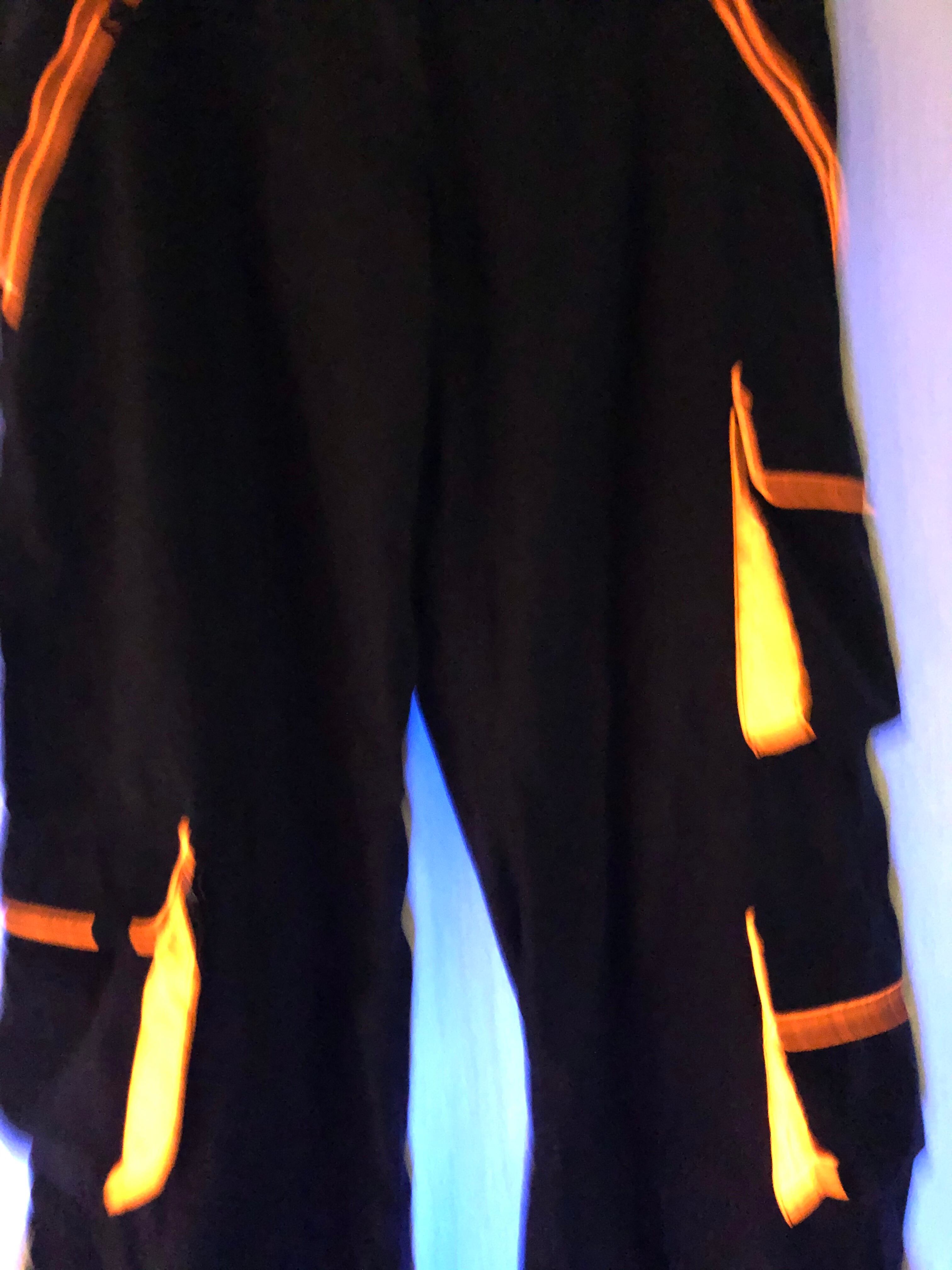 このスペーストライブのパンツはブラックでオレンジのラインやポケットのフチに入っていてブラックライトで光ります。