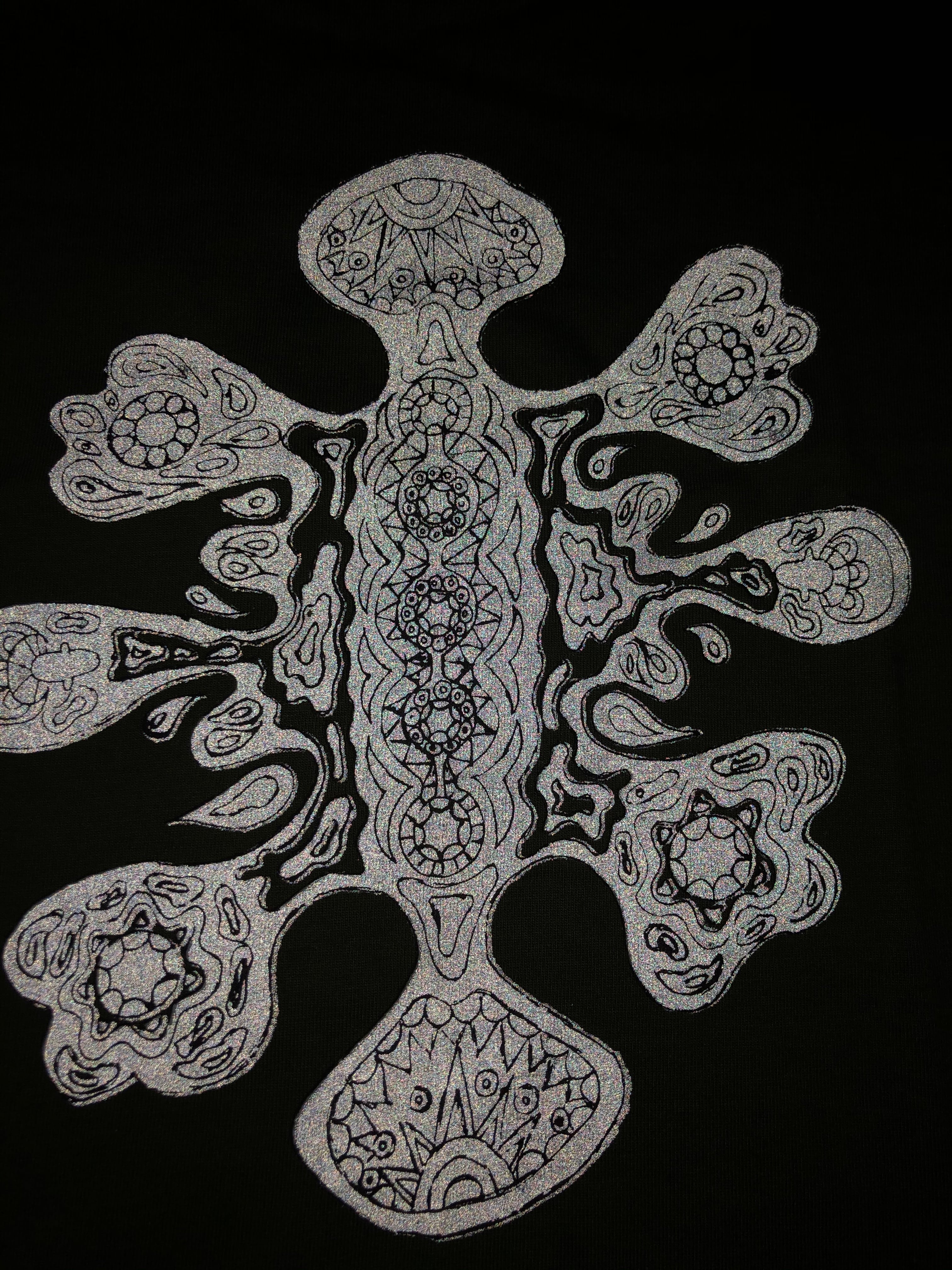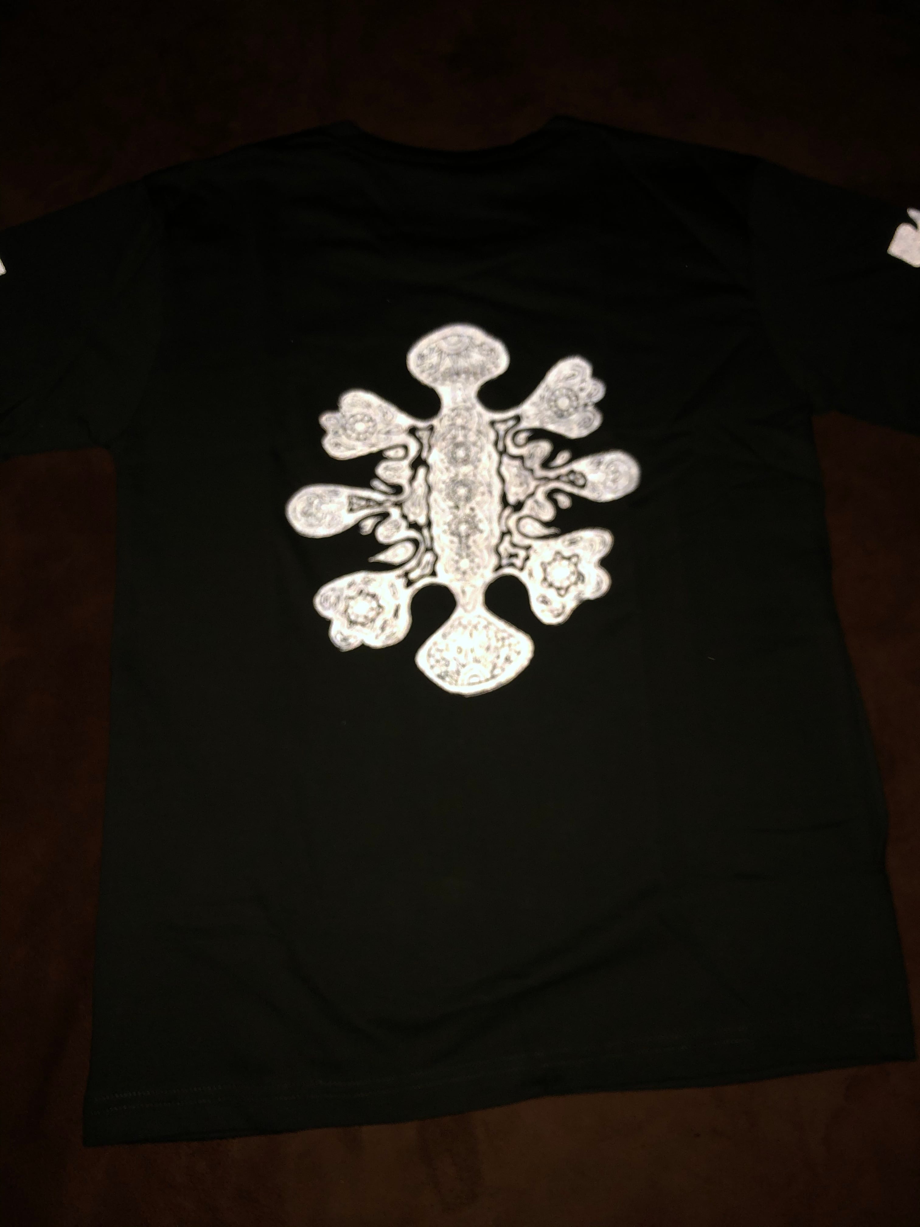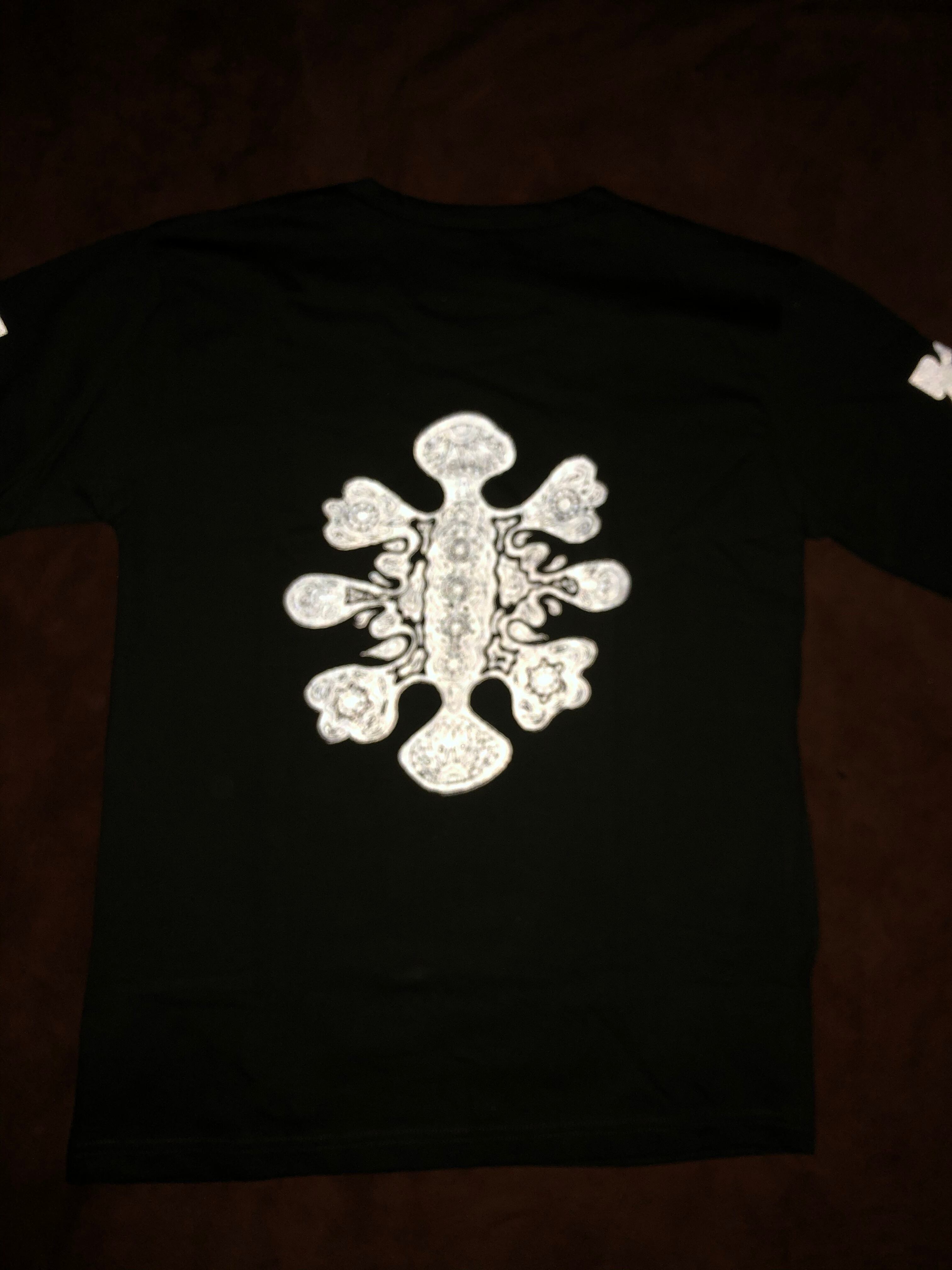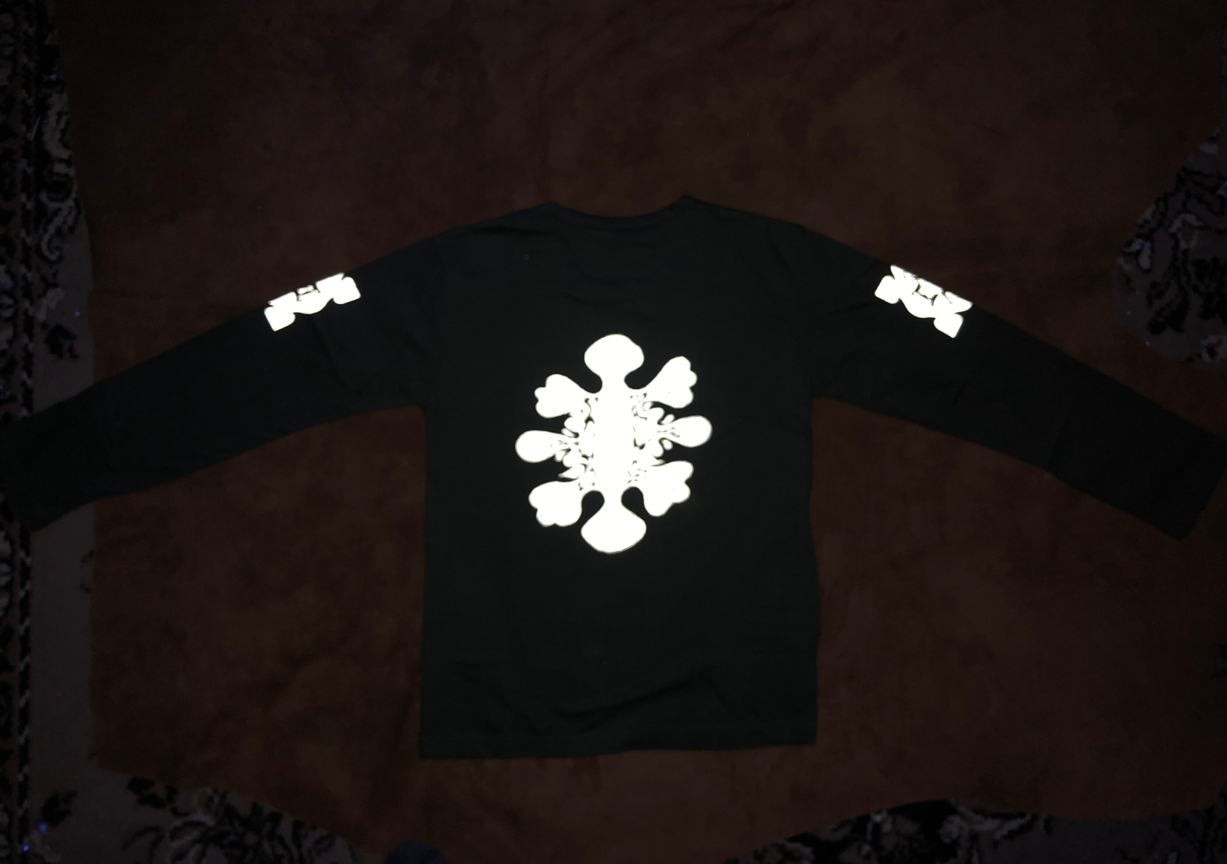 プリントは袖にリフレクタープリントが入っていてカメラのフラッシュや車のライトで光ります。