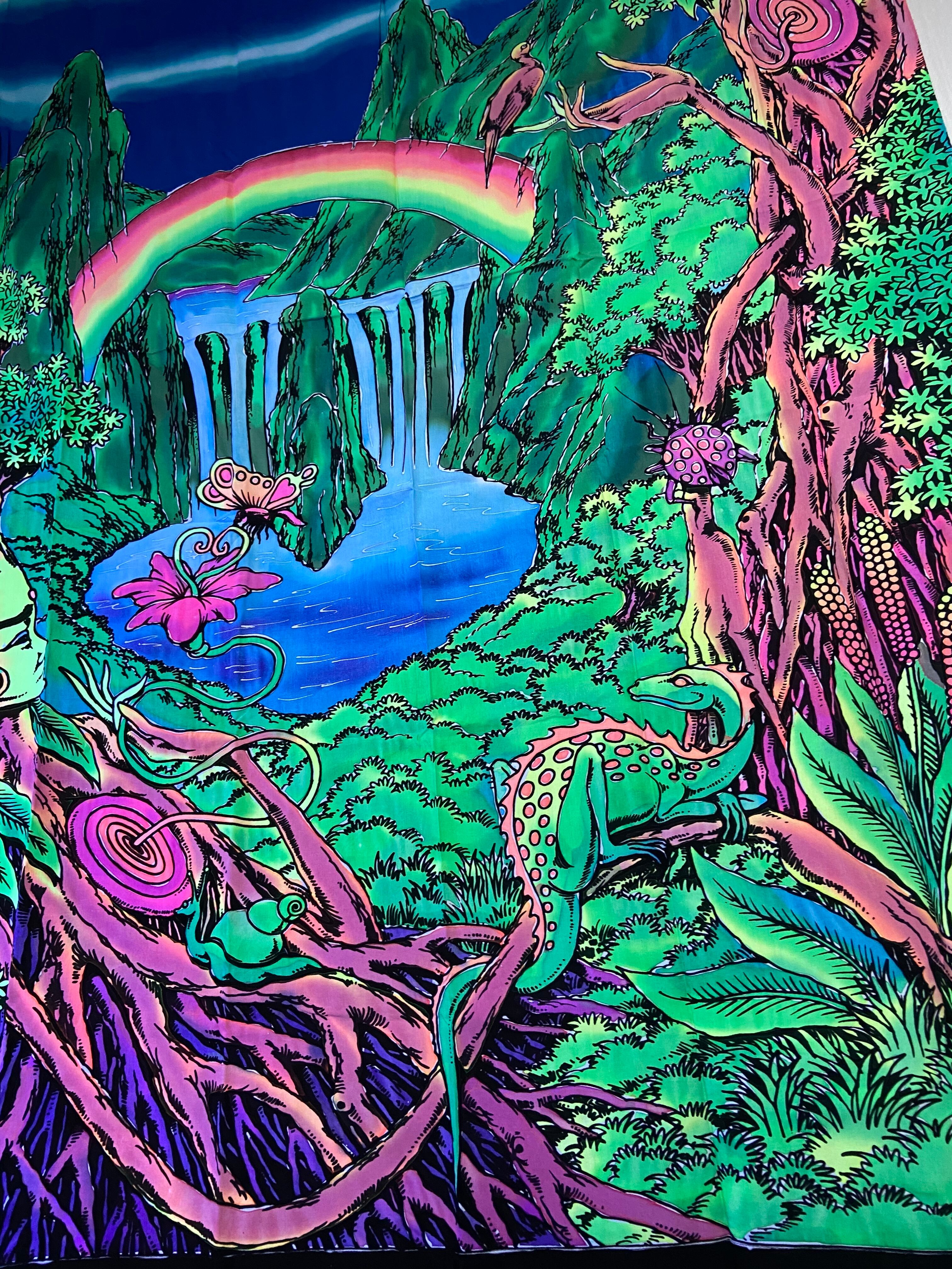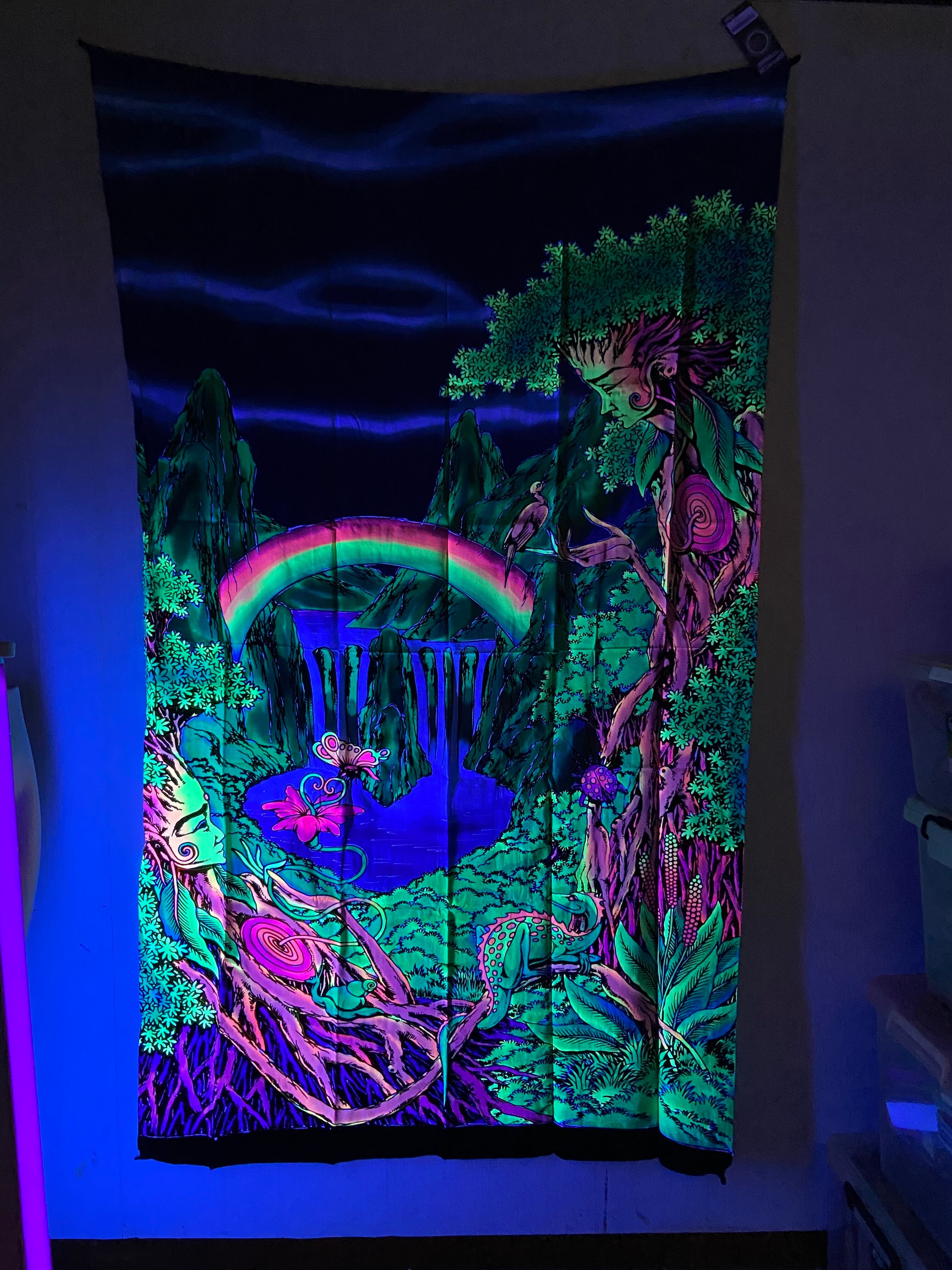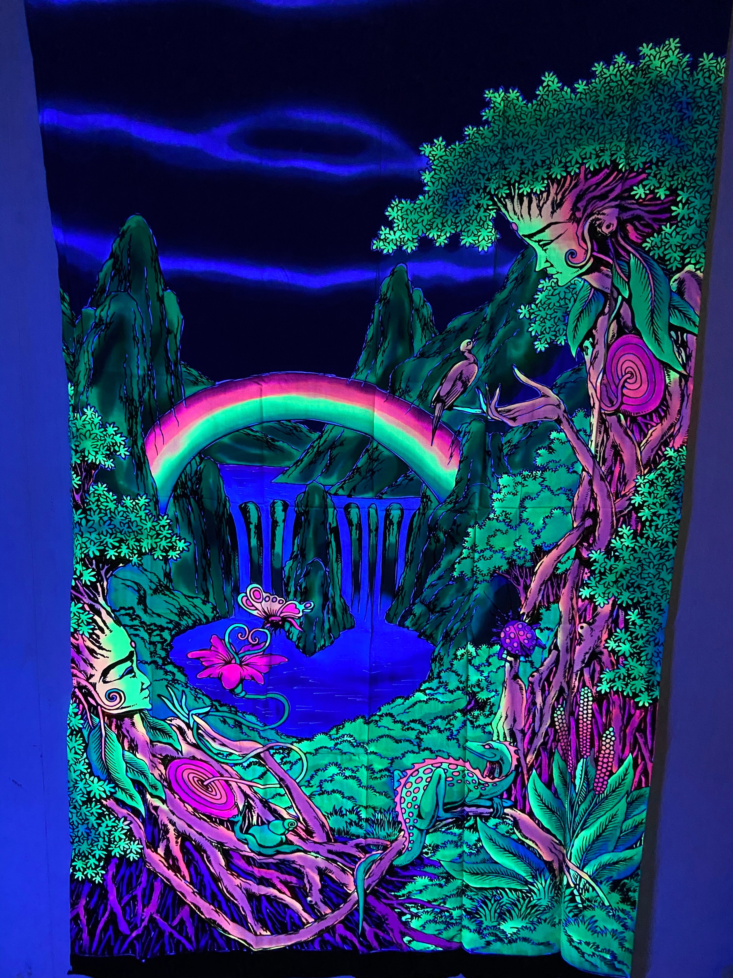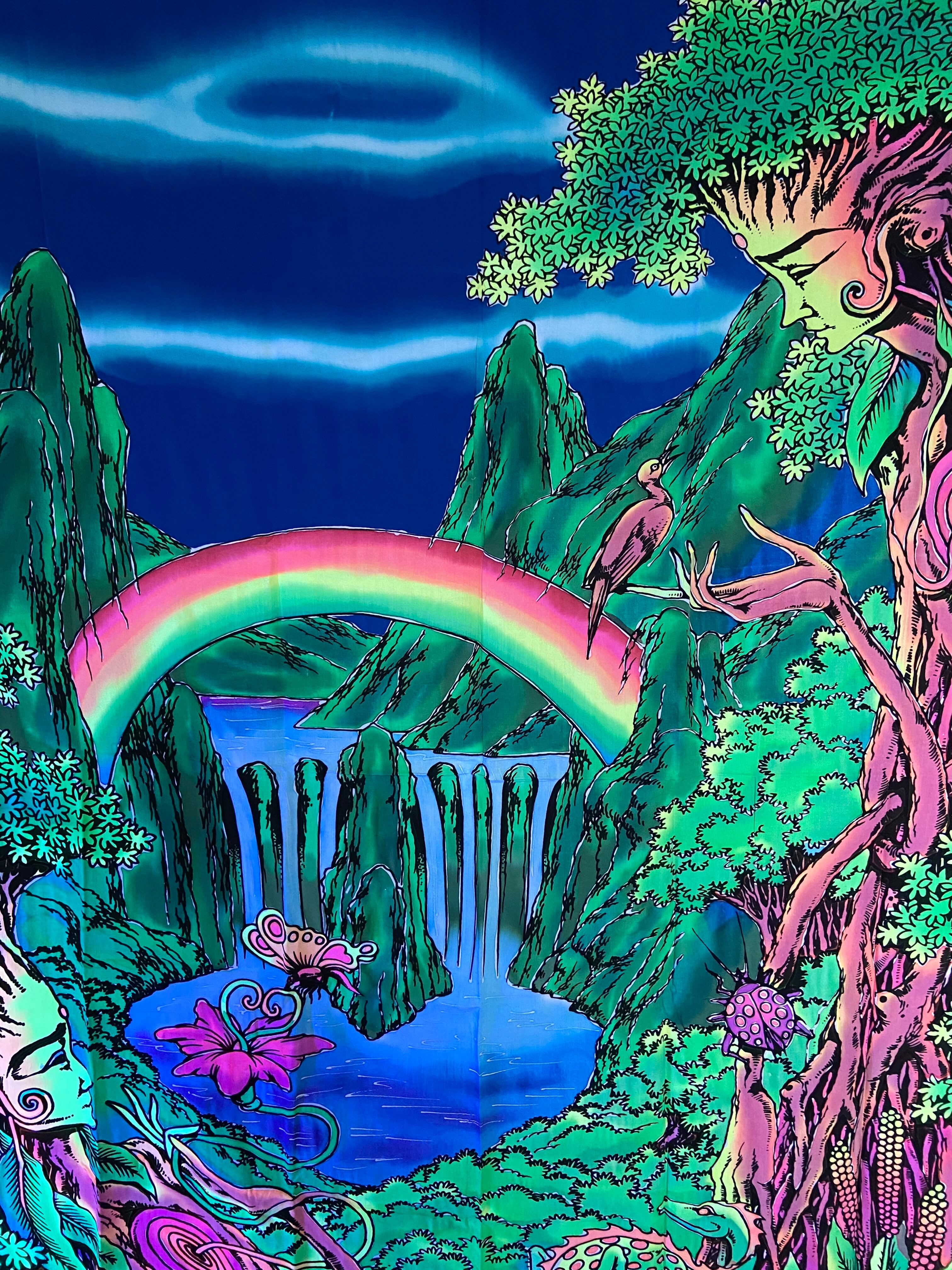 布に蛍光塗料を使いろうけつ染めアートしたタペストリーです。部屋の模様替えやイベントのデコレーション*バックドロップなどに最適です。ブラックライトに反応してサイケデリックな世界が楽しめます