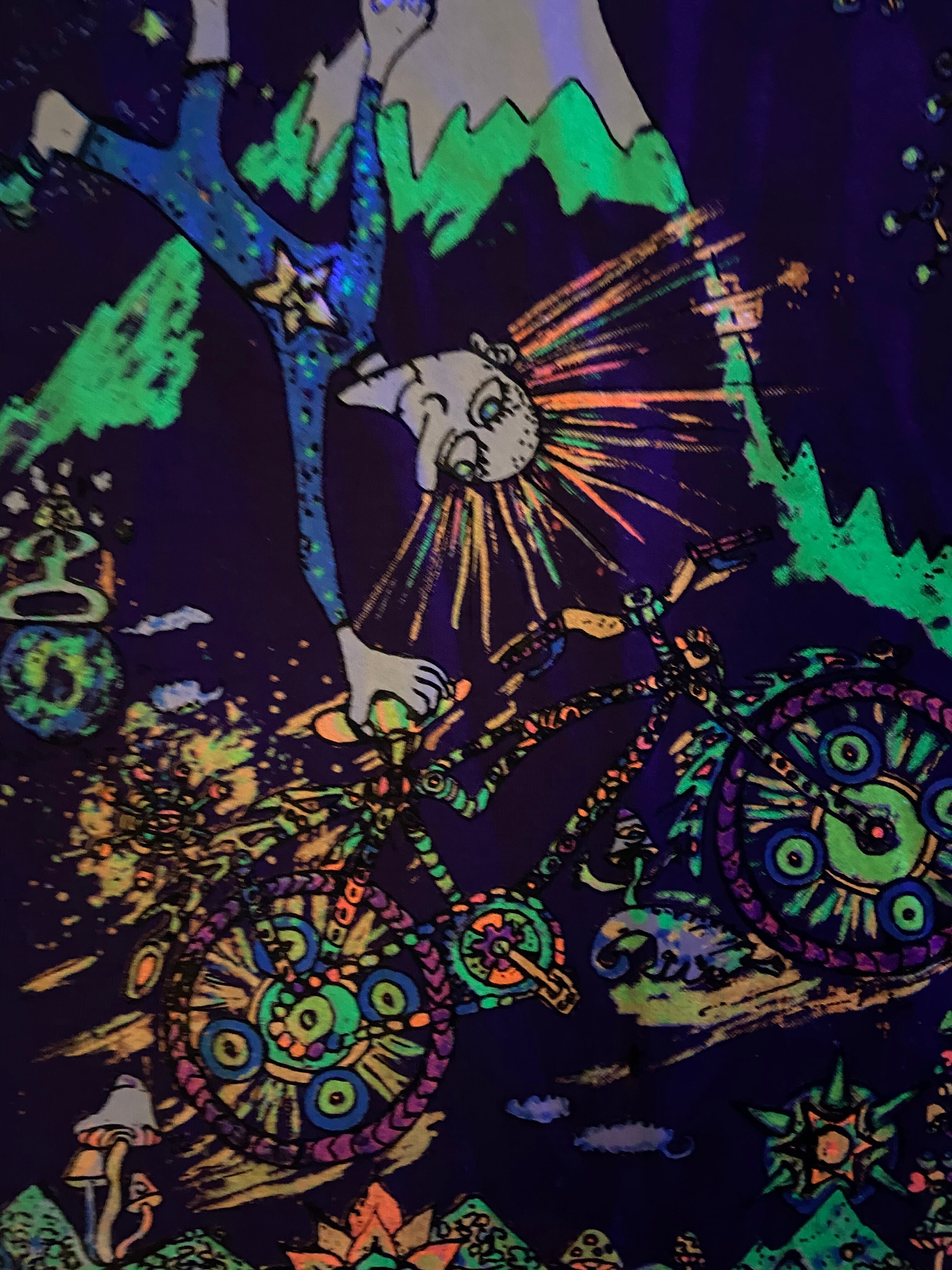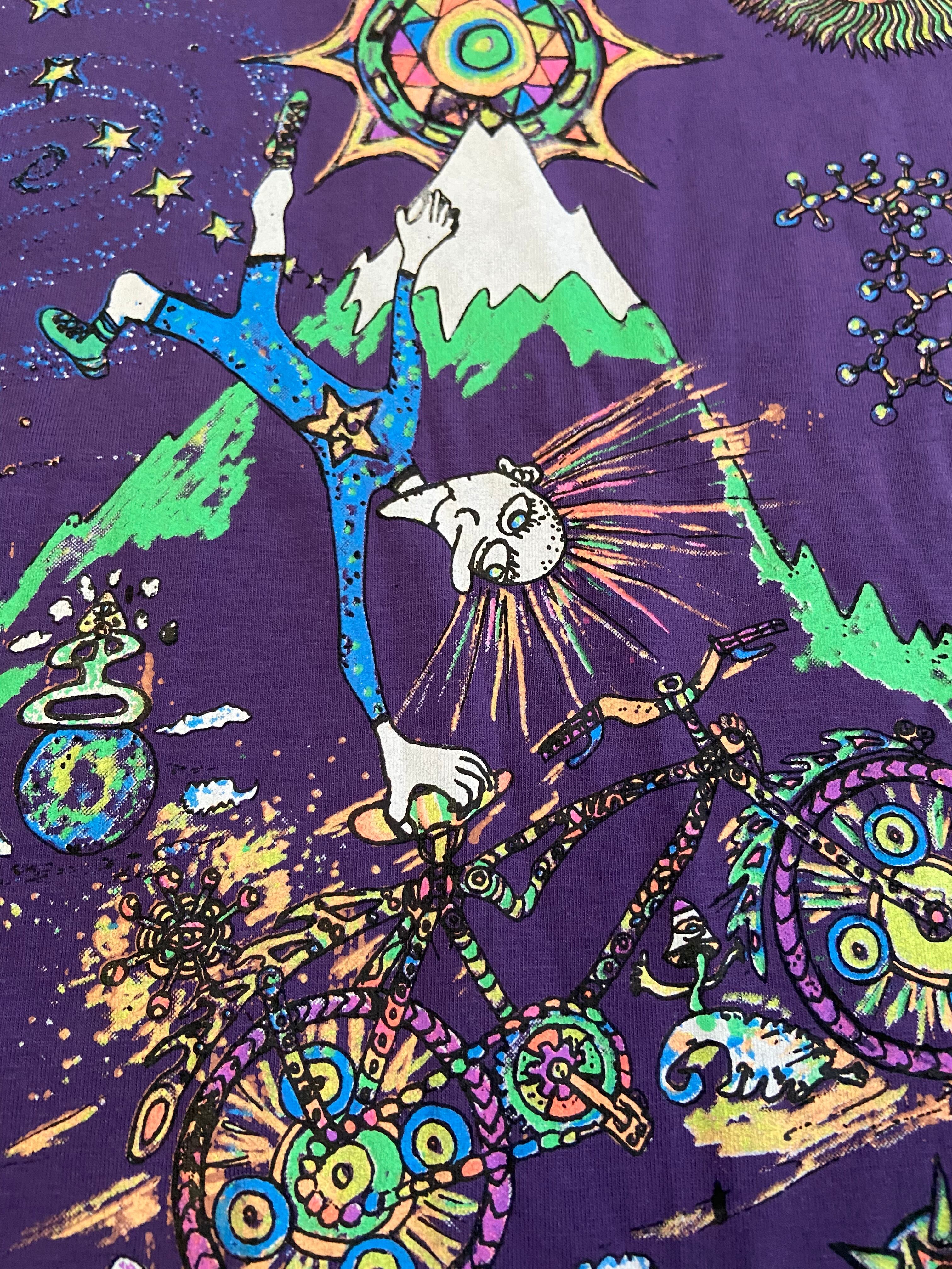 プリントはスイスのアルバートホフマン博士が2008年に102歳で亡くなり肉体を離れ」次元を旅して2016年に再びこの世界に戻ってくるイマジネーションの世界を絵に描いてます。もう自転車こいでないアクロバティックな博士とその他のキャラクターもアクロバット状態で。題してドクターホフマンアクロバットチームと銘打ってますのでよろしくお願いします。