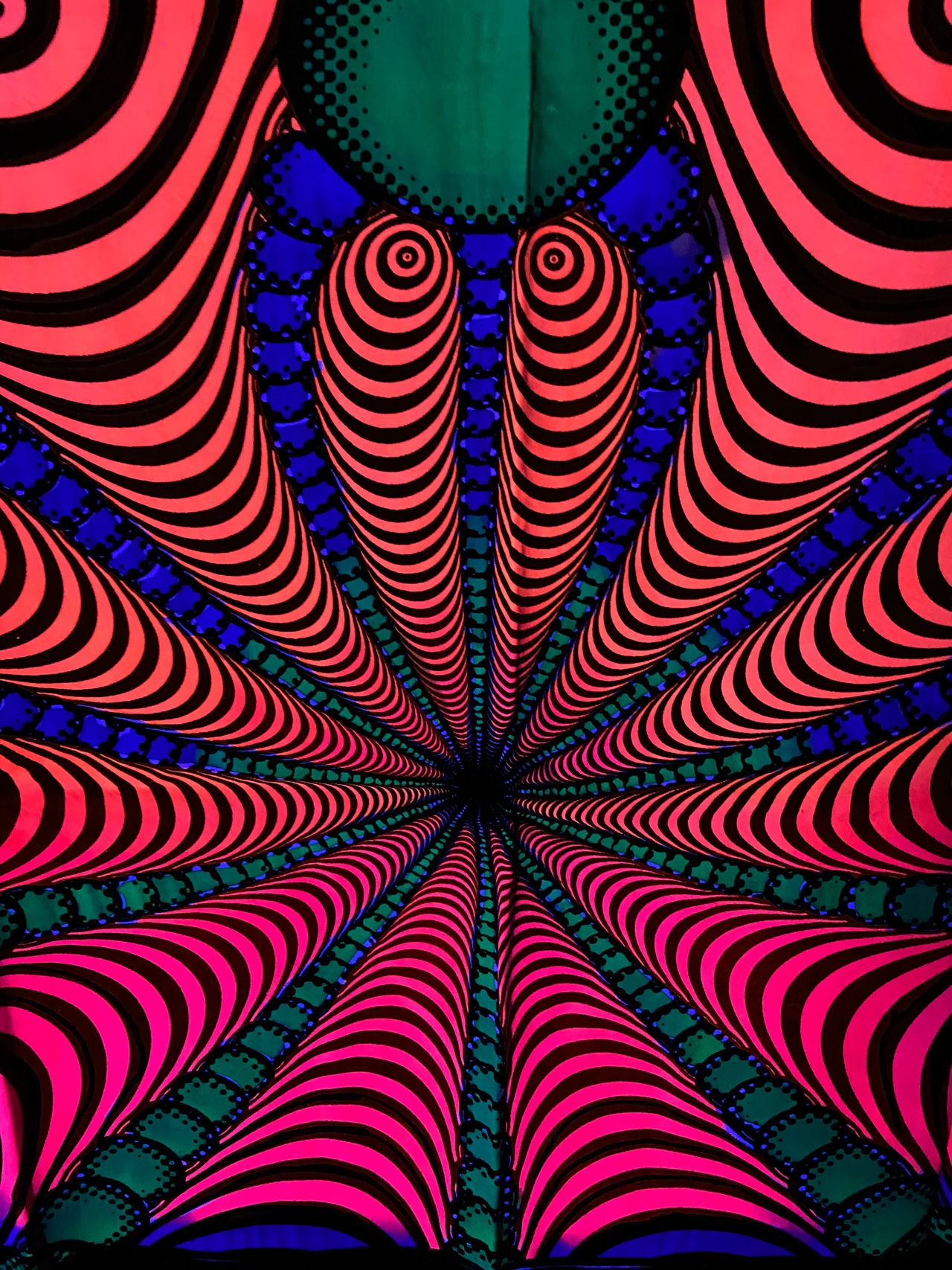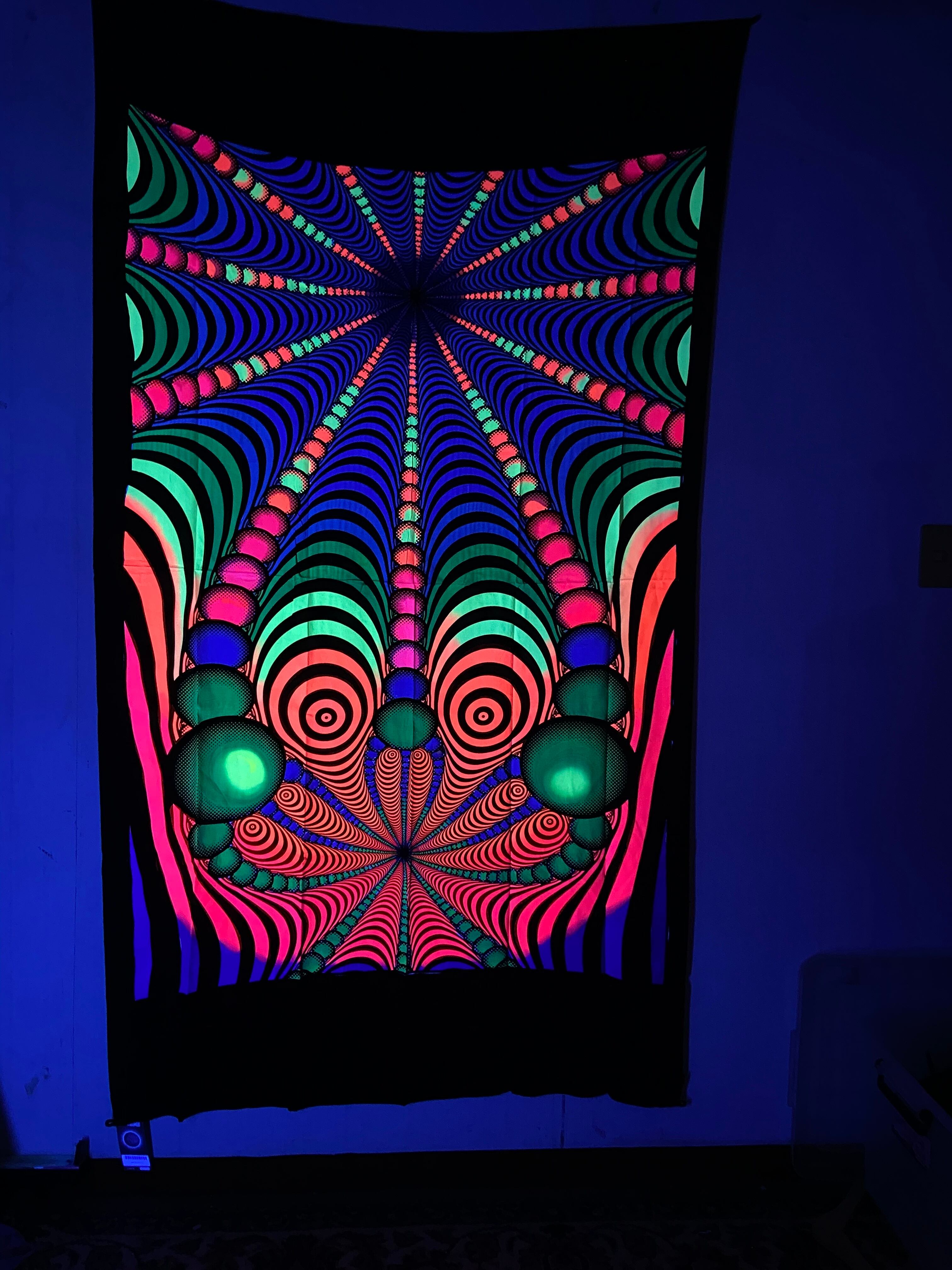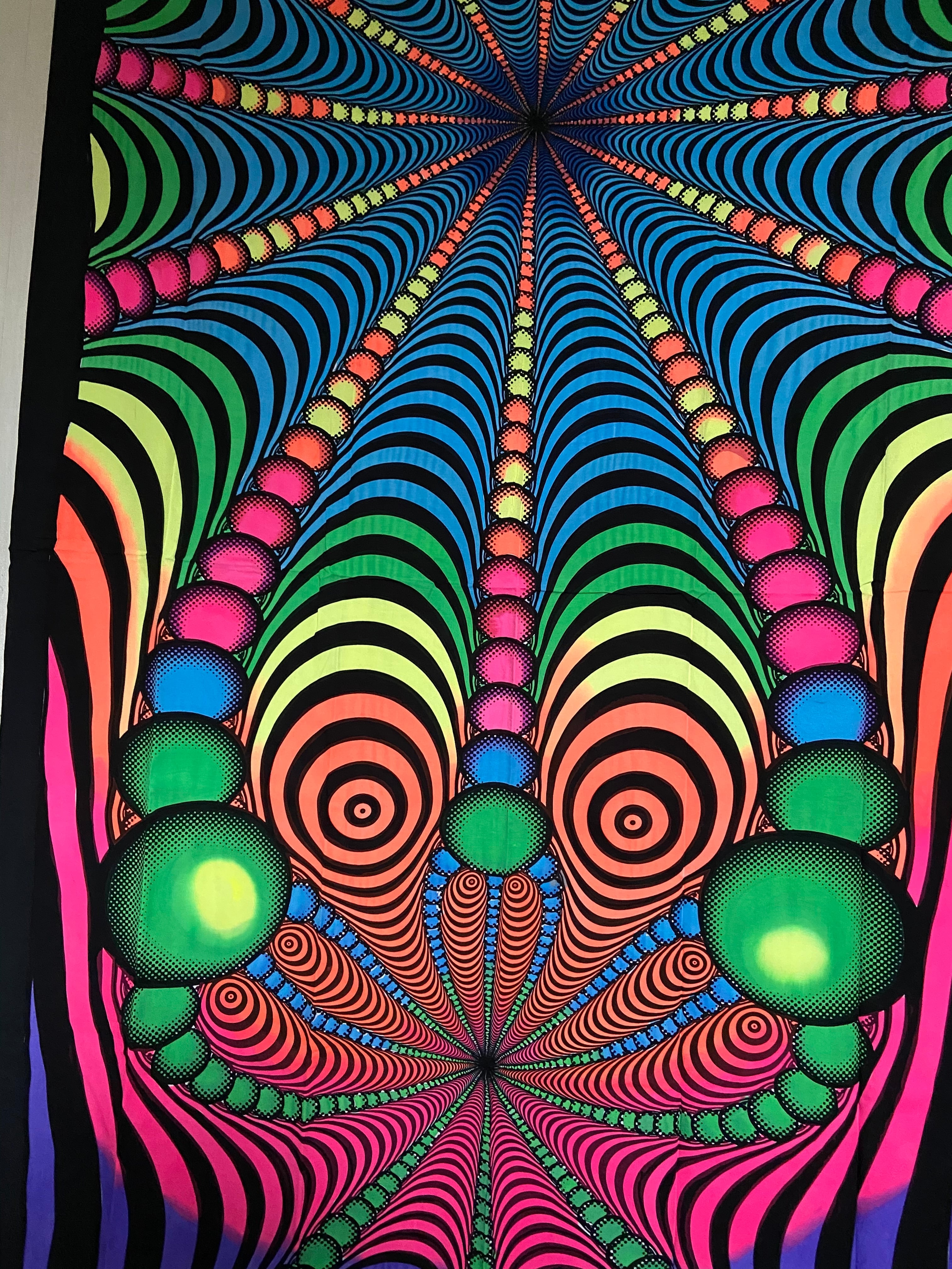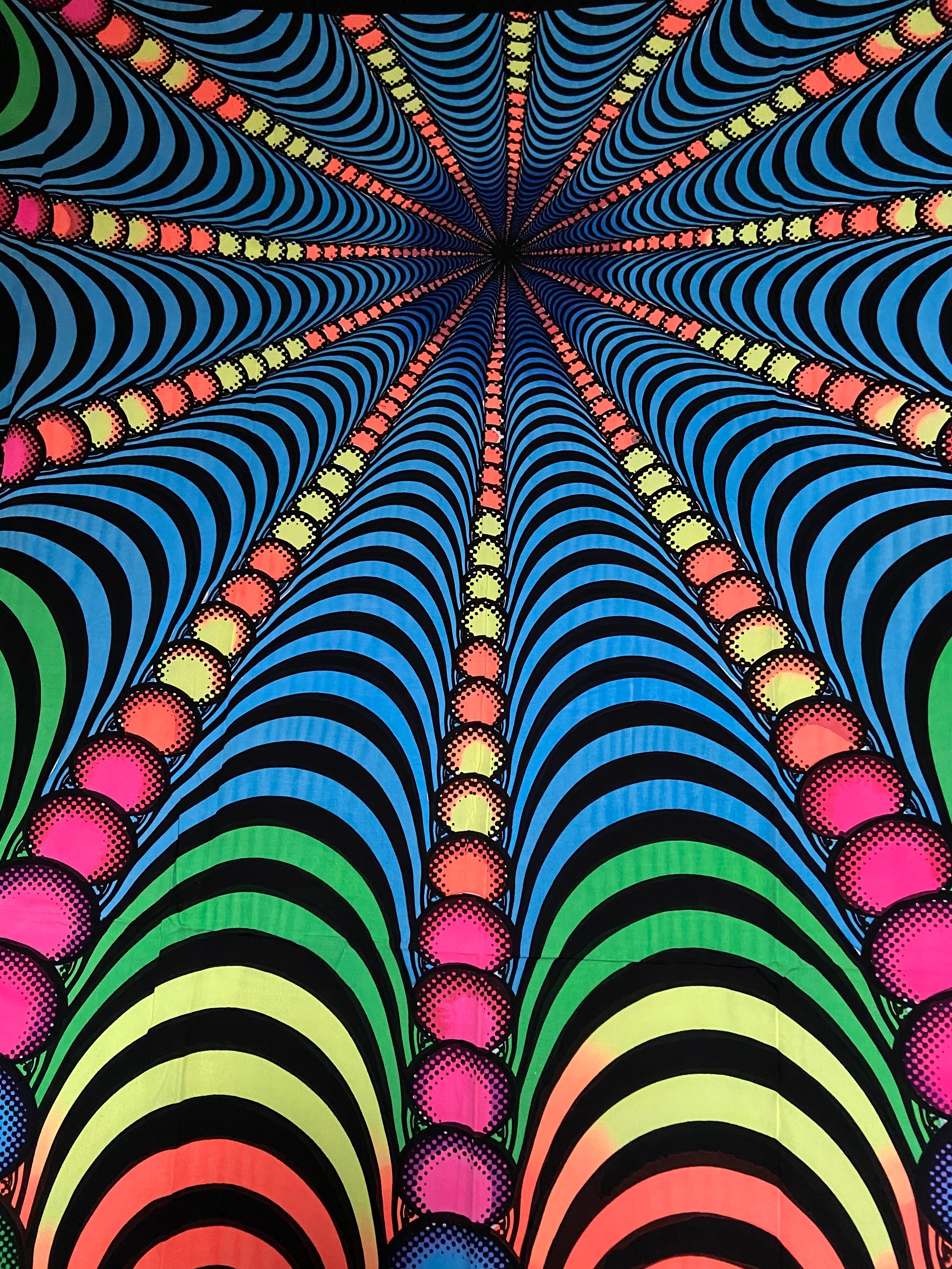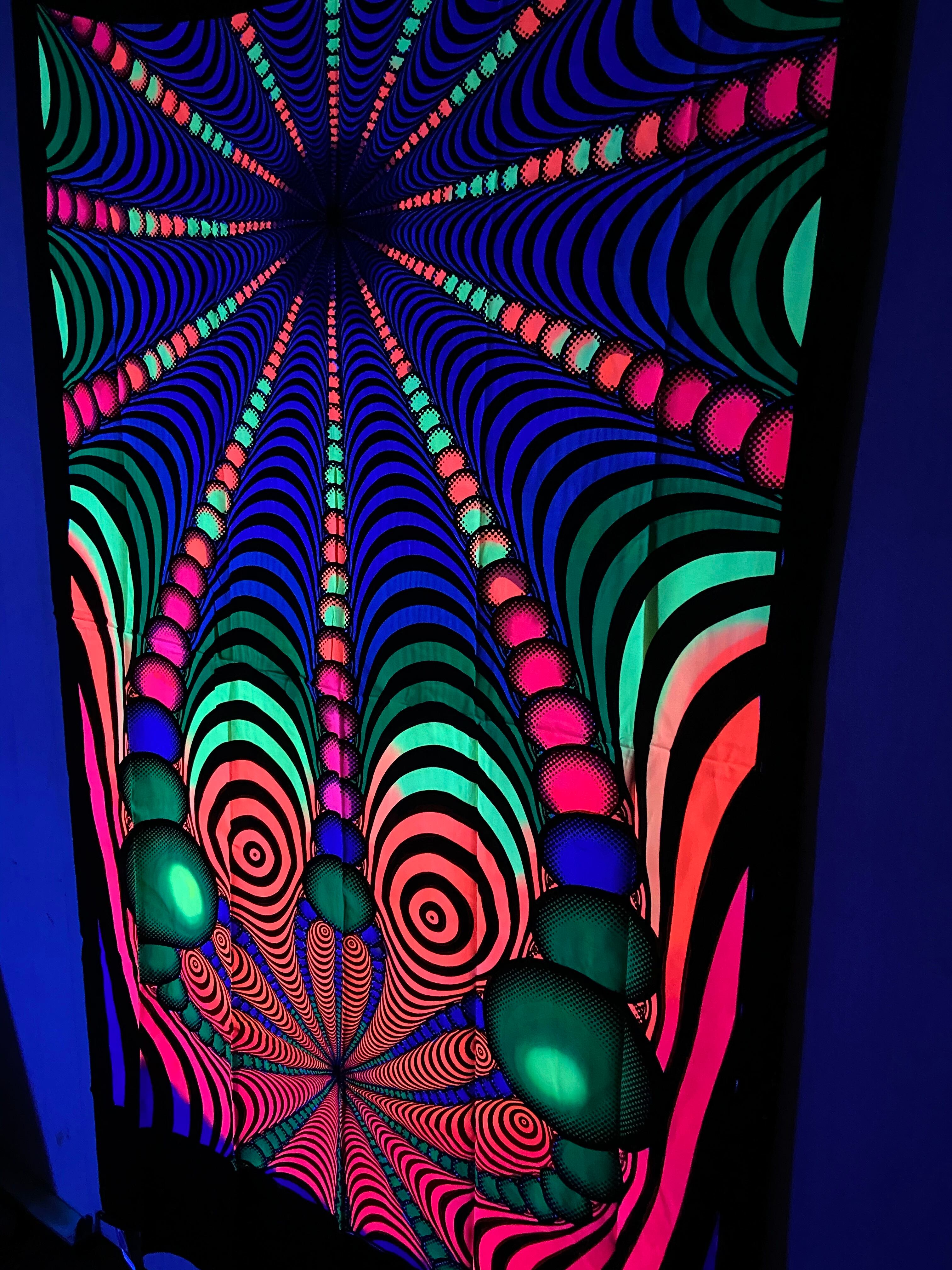 生地レーヨンに蛍光塗料を使いろうけつ染めアートしたタペストリーです。部屋の模様替えやイベントのデコレーション*バックドロップなどに最適です。ブラックライトに反応してサイケデリックな世界が楽しめます。