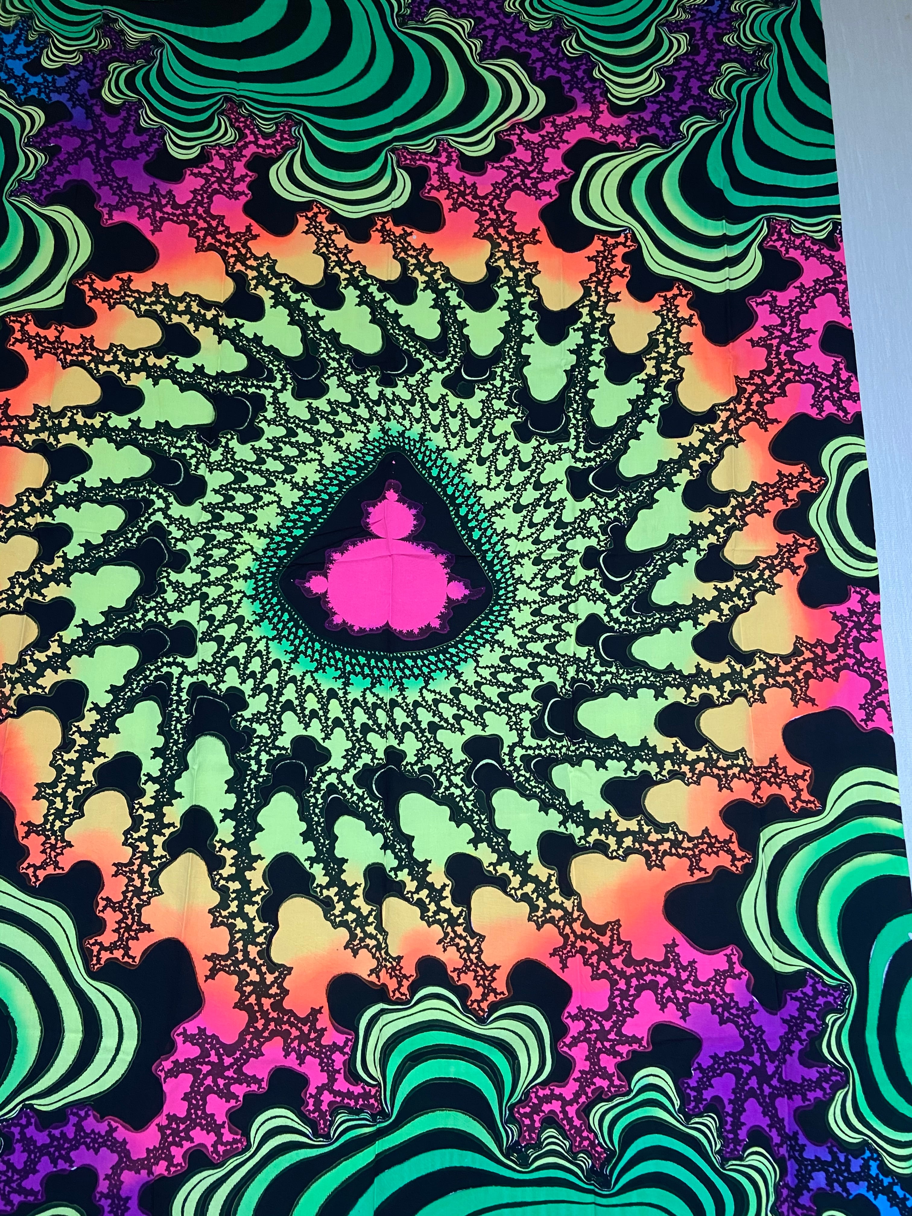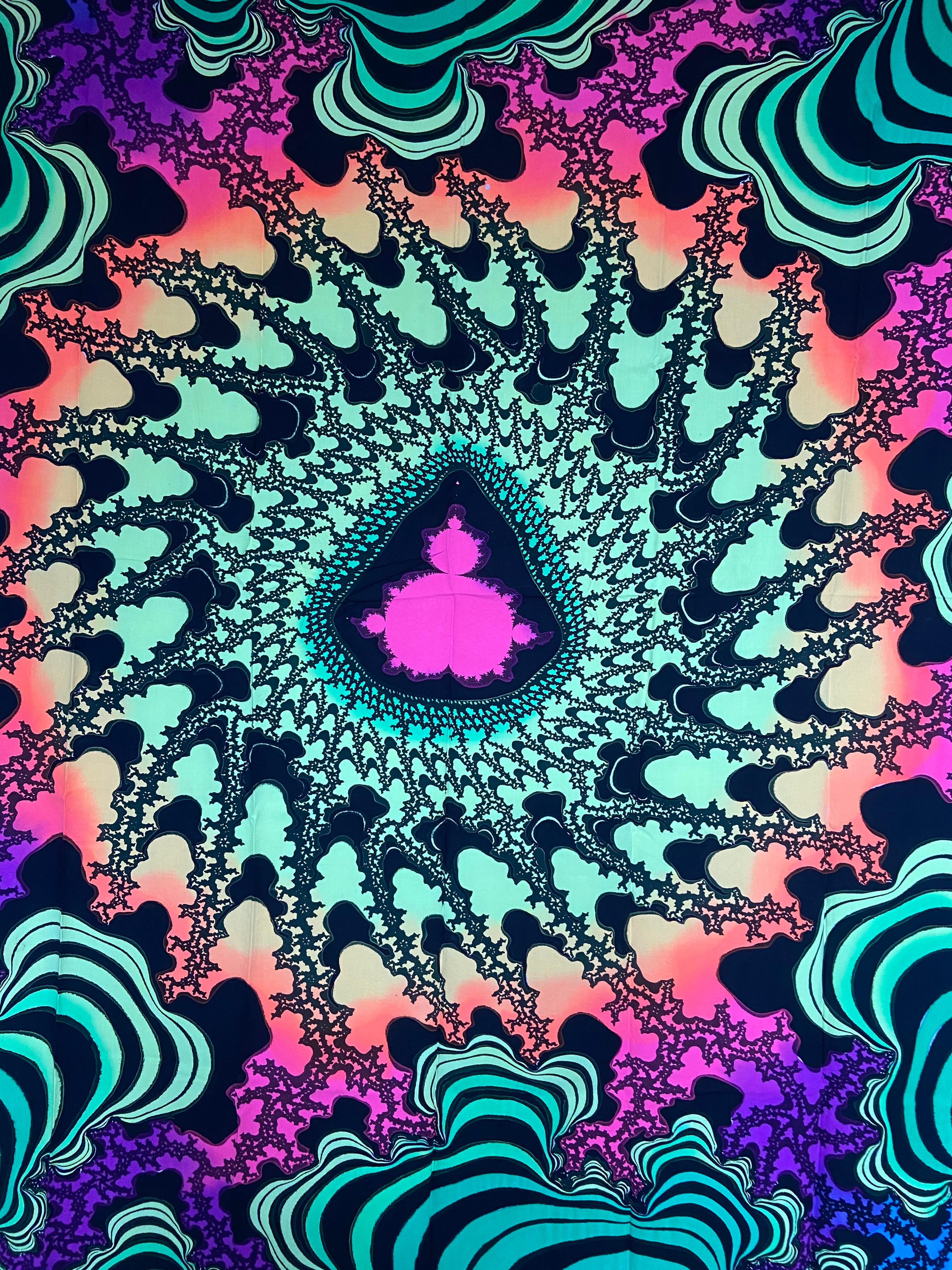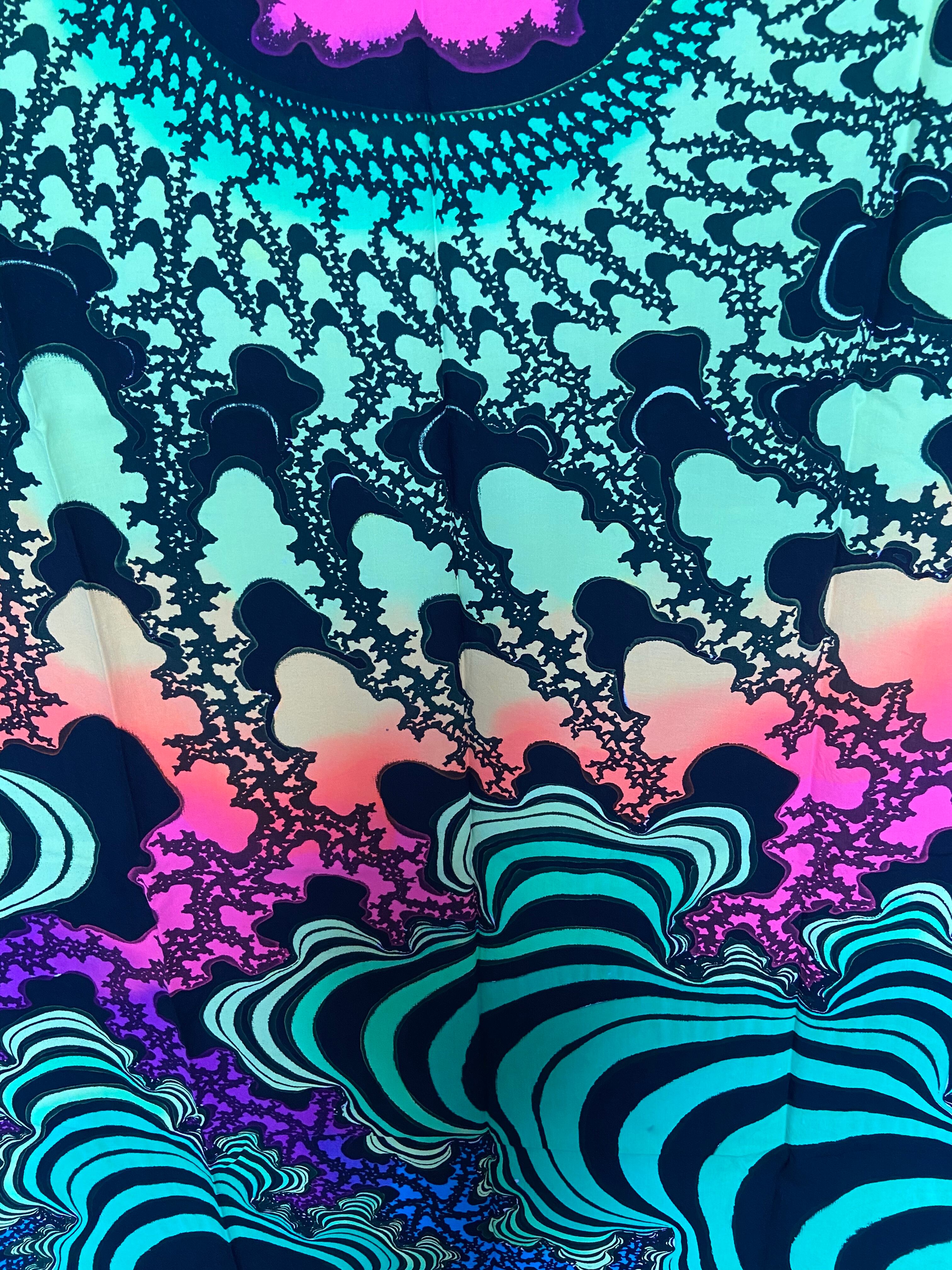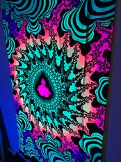 布に蛍光塗料を使いろうけつ染めアートしたタペストリーです。部屋の模様替えやイベントのデコレーション*バックドロップなどに最適です。ブラックライトに反応してサイケデリックな世界が楽しめます