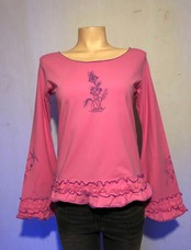 このロングスリブTシャツはピンク生地にパープルのプリントが入った商品です。
