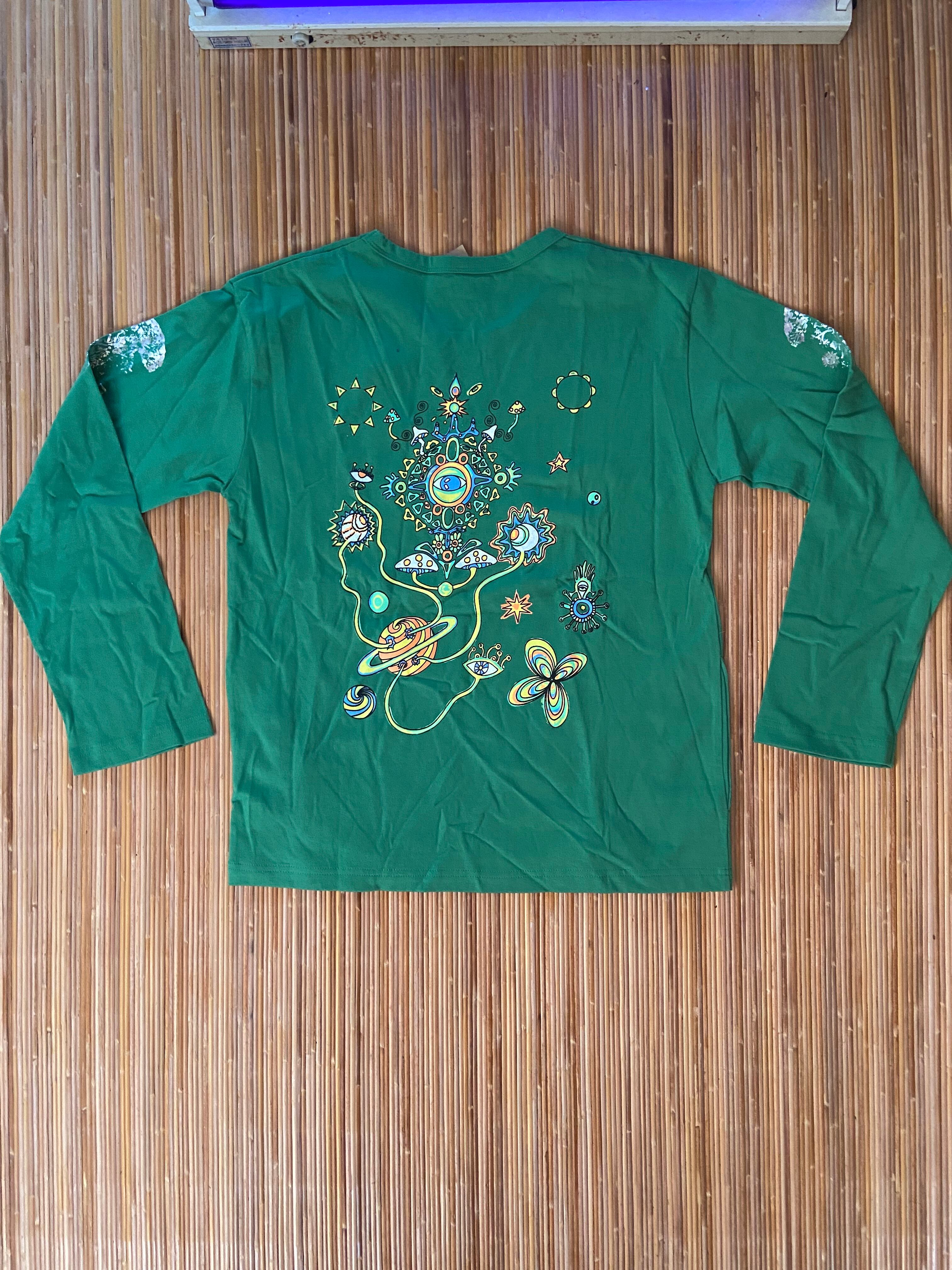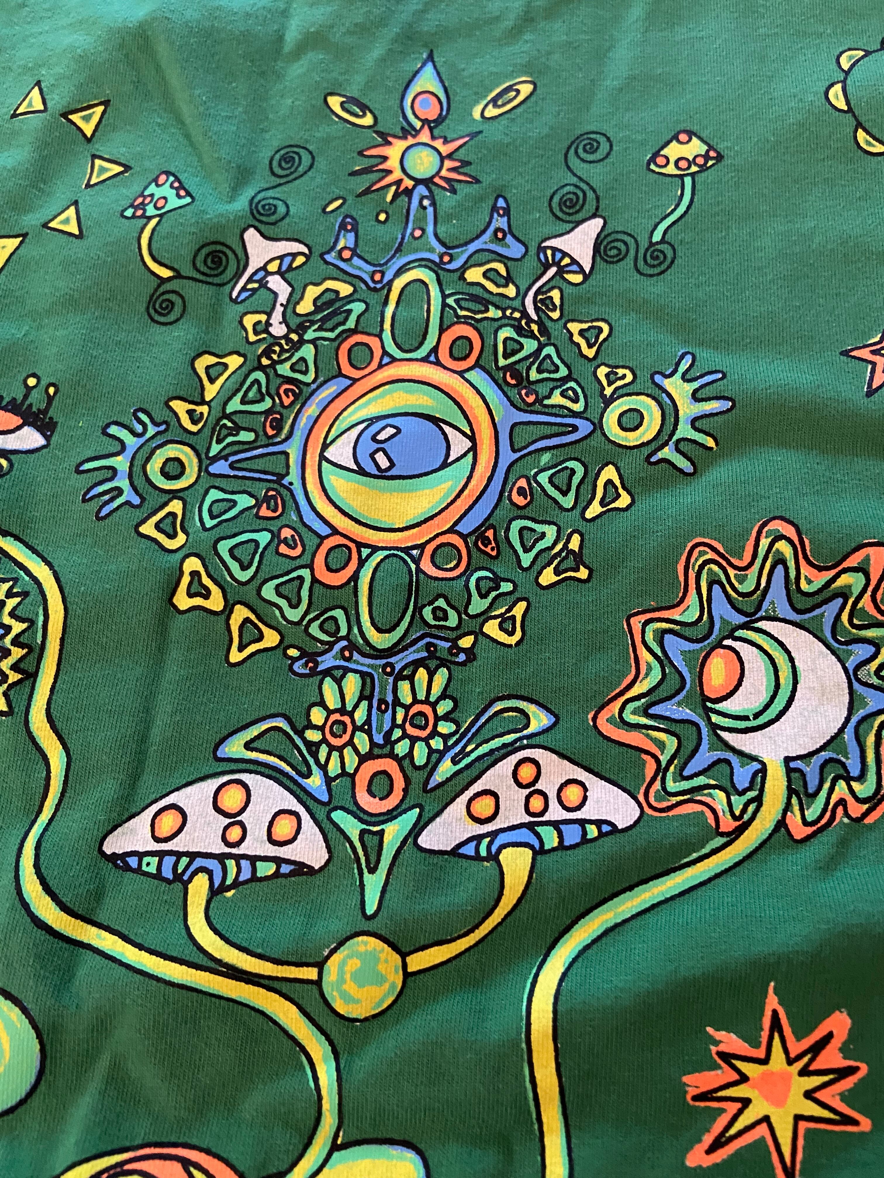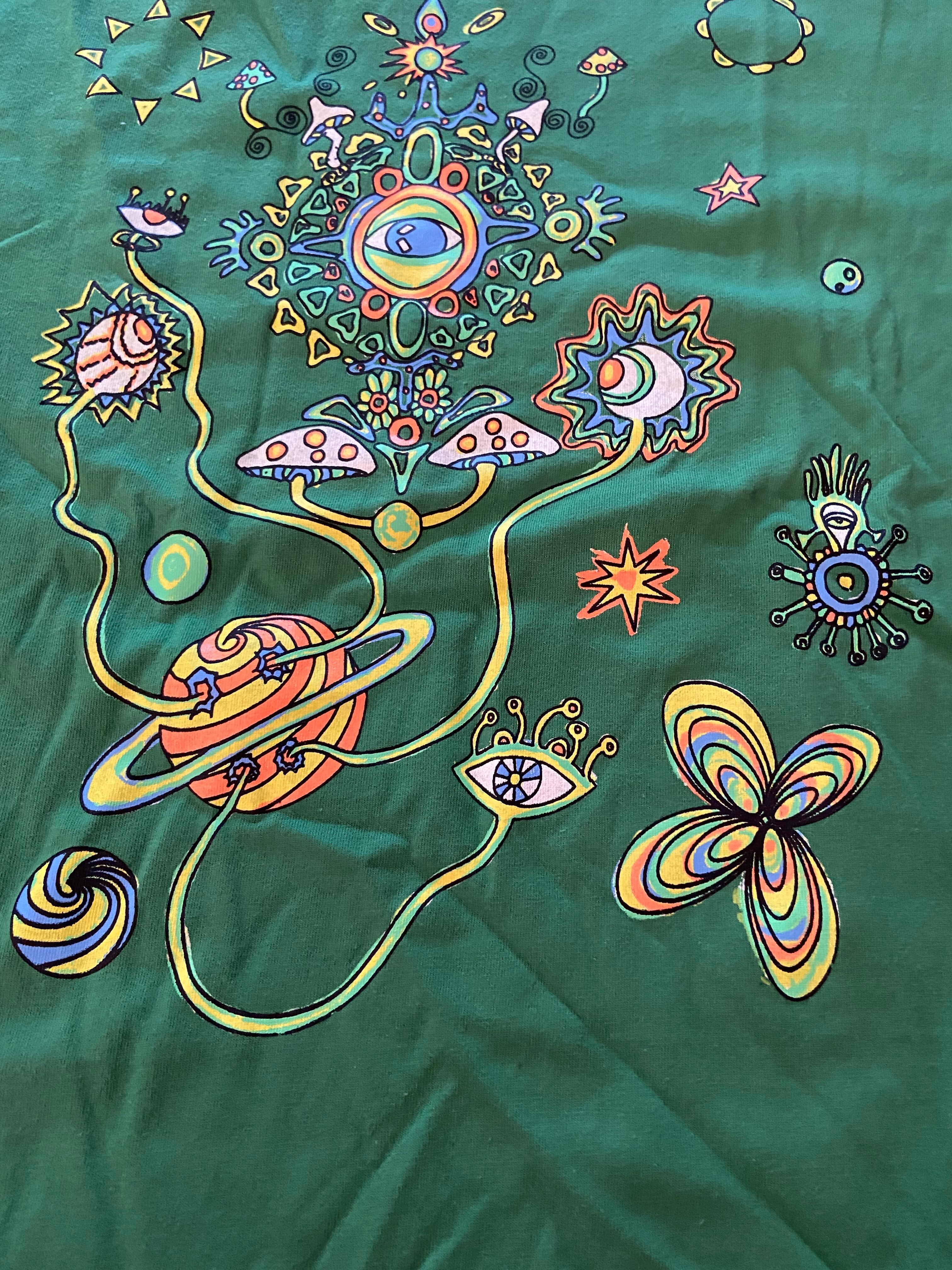 フロントにデジタルマンをグリーンにグリーンでプリントして両サイドにラメでサイケデリックツリーをプリントしてバックはトリップビジョンをプリントしました