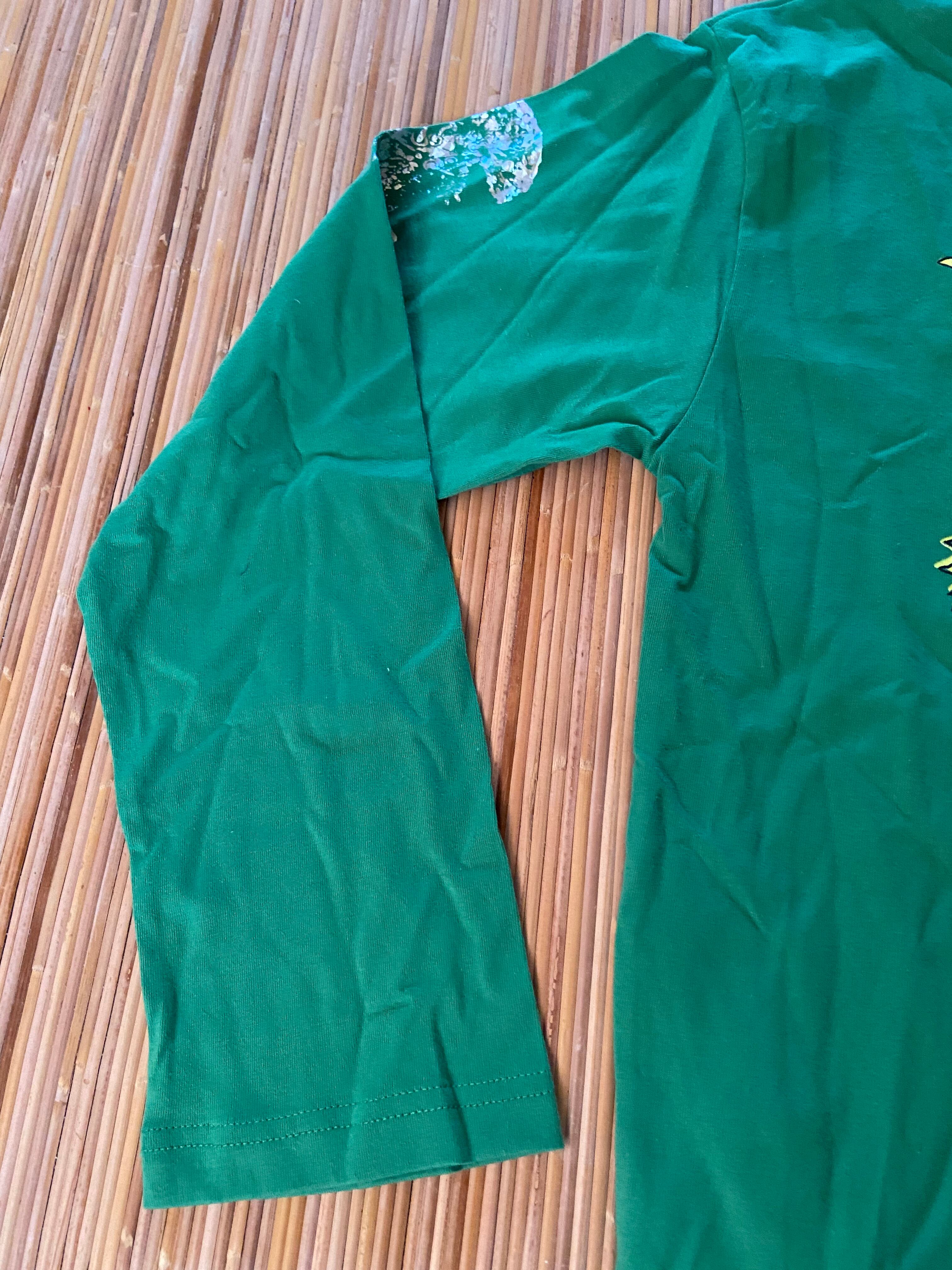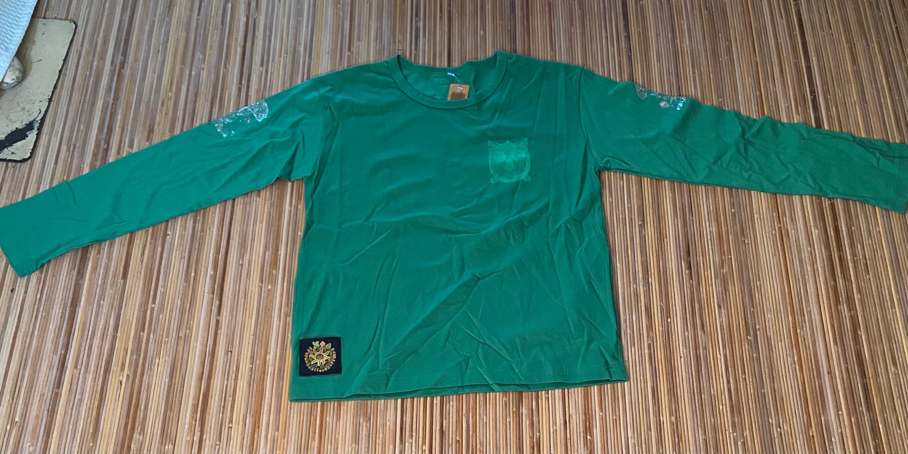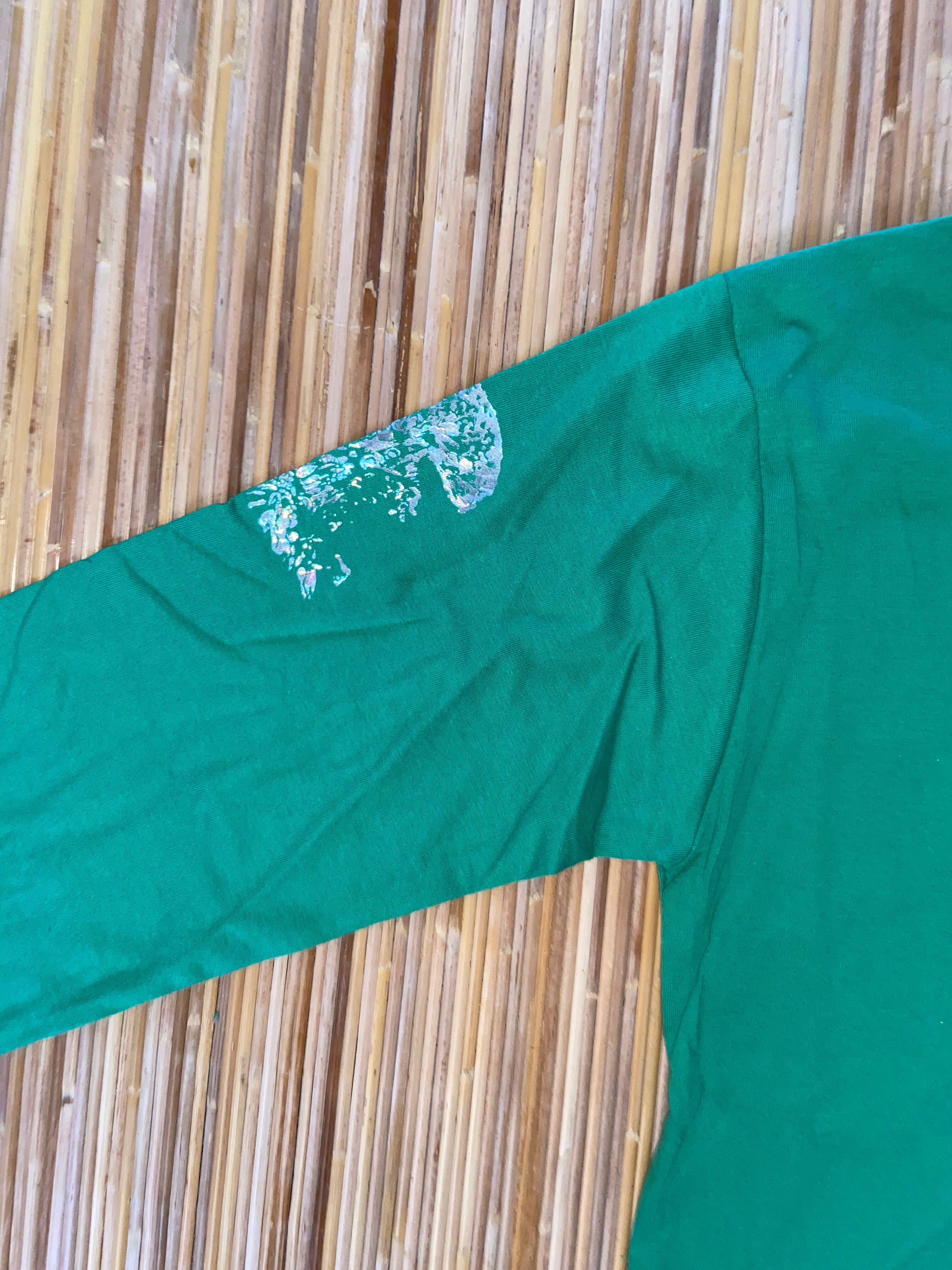 フロントにデジタルマンをグリーンにグリーンでプリントして両サイドにラメでサイケデリックツリーをプリントしてバックはトリップビジョンをプリントしました