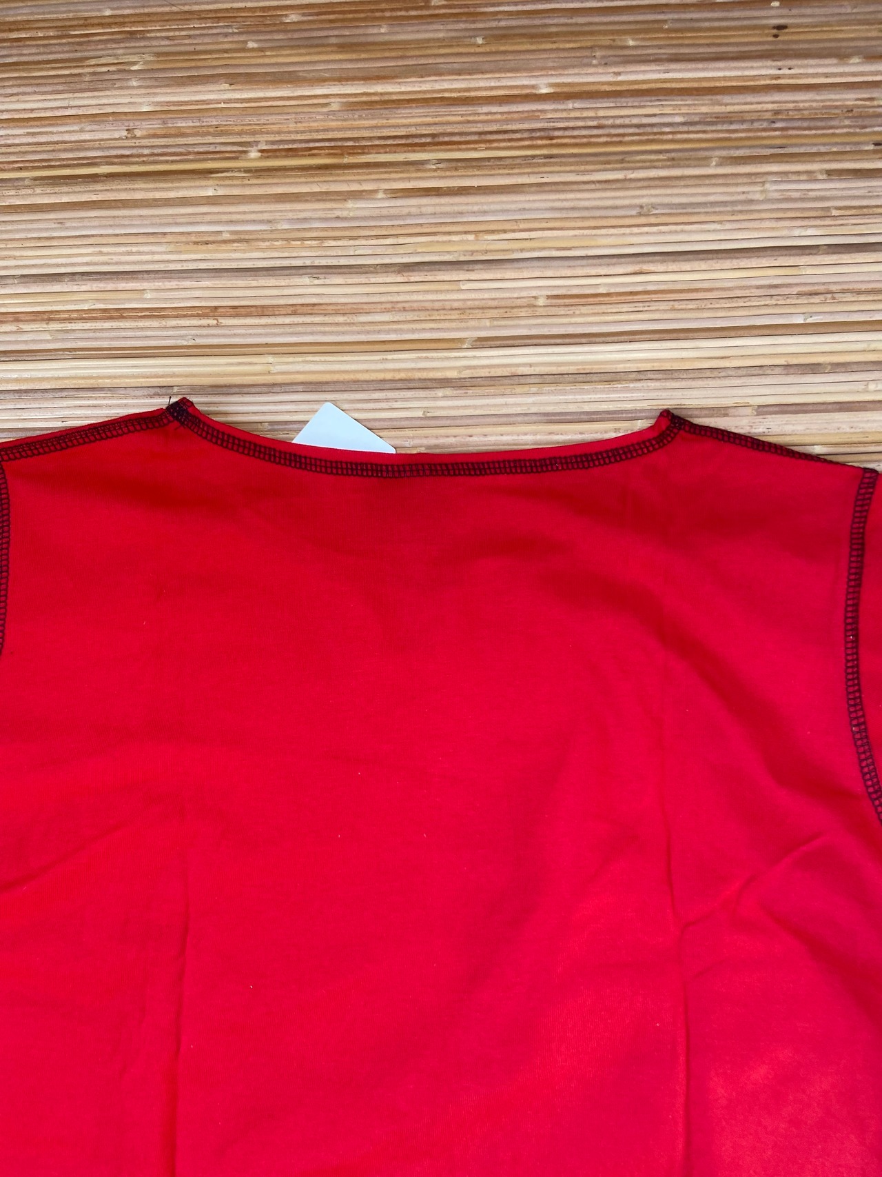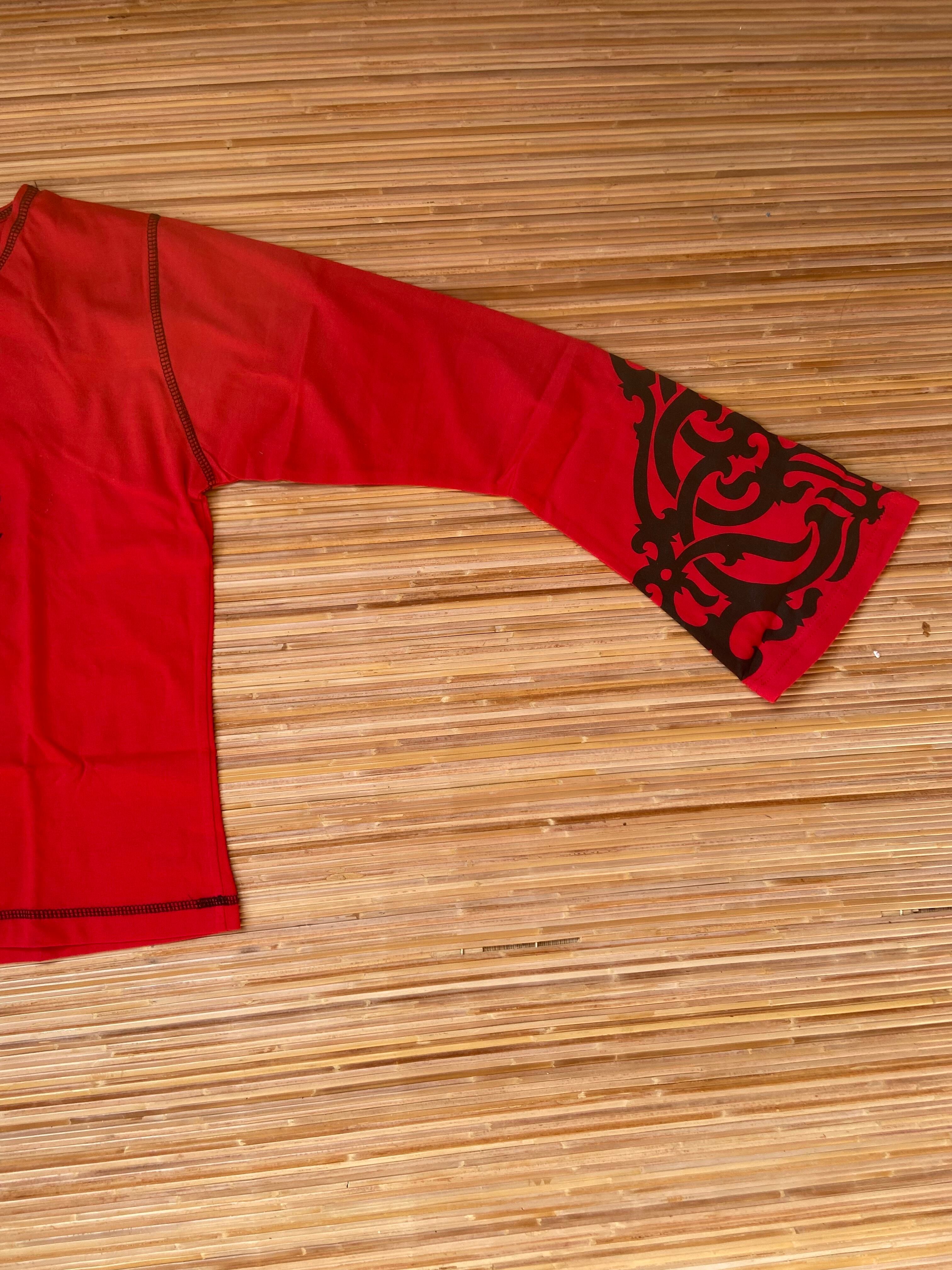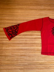 インドネシアトライバルタトゥーデザインをシルクスクリーンで手刷りプリントした赤ベースのレディースロングスリーブTシャツです