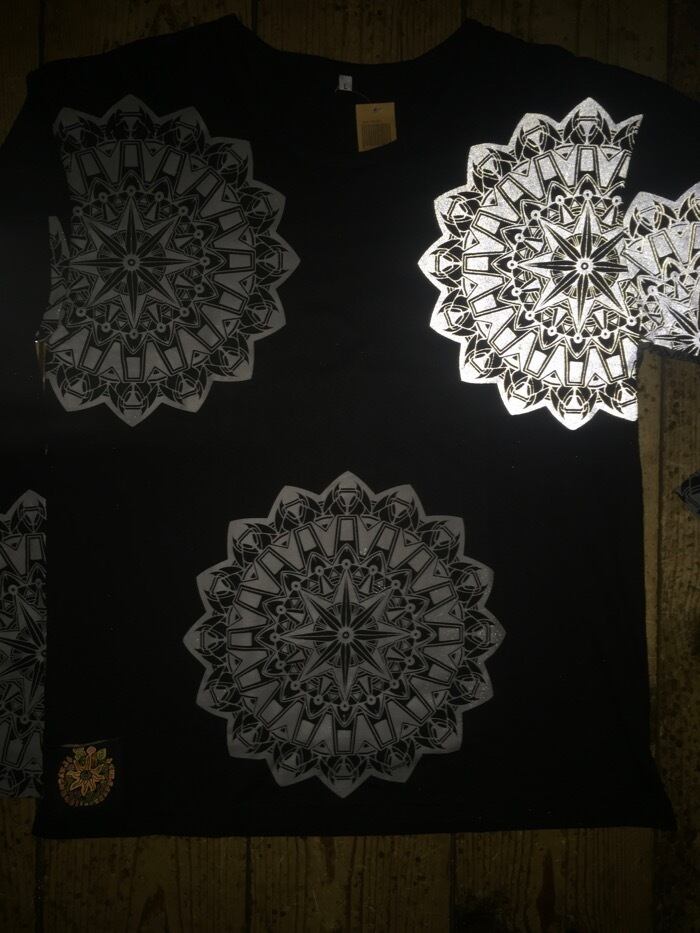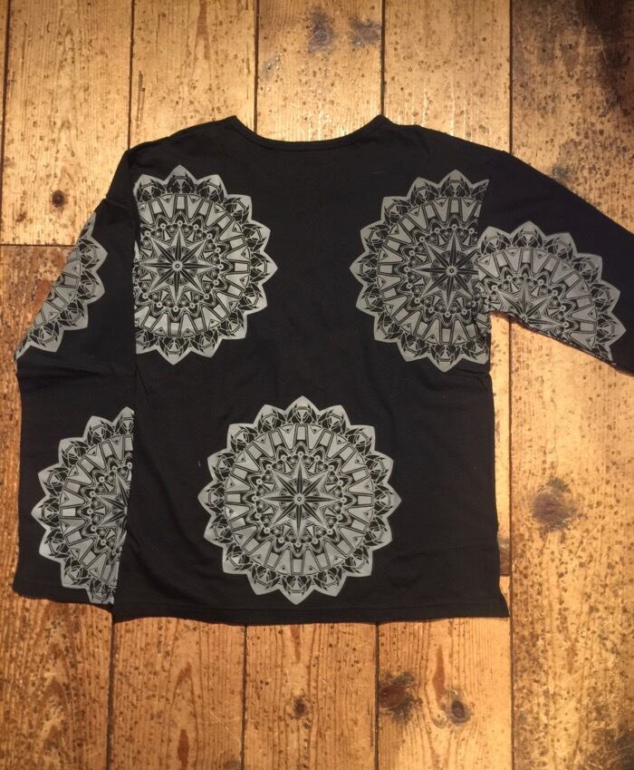 プリントはリフレクターインクを使いシルクスクリーンで手刷りプリントを前後、両袖に入れてます。。